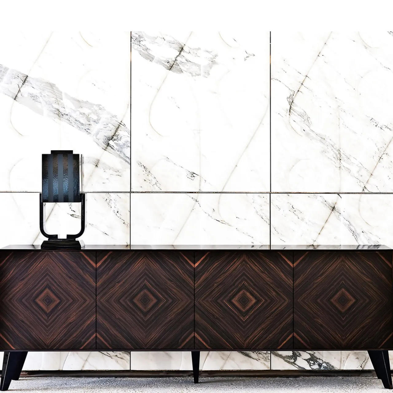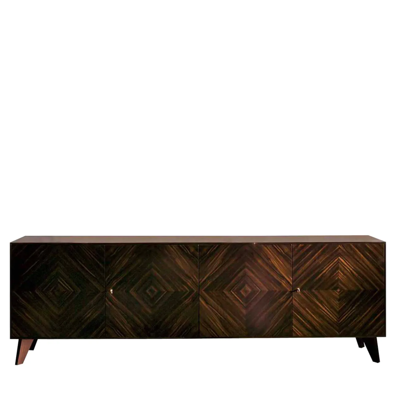 Da sola, esposta in un ampio ingresso come console unica, o in un soggiorno o in una sala da pranzo come elegante spazio di archiviazione, questa credenza è la versione corta del mobile alto Michel e può essere abbinata alla sua controparte più alta per un effetto sorprendente. La sua silhouette orizzontale è sostenuta da piedini corti in ebano con laccatura nera lucida ed è superbamente decorata con un’impiallacciatura in ebano Macassar applicata a mano sui pannelli frontali delle quattro ante. Lo spazio interno è tinto scuro e diviso da un ripiano.