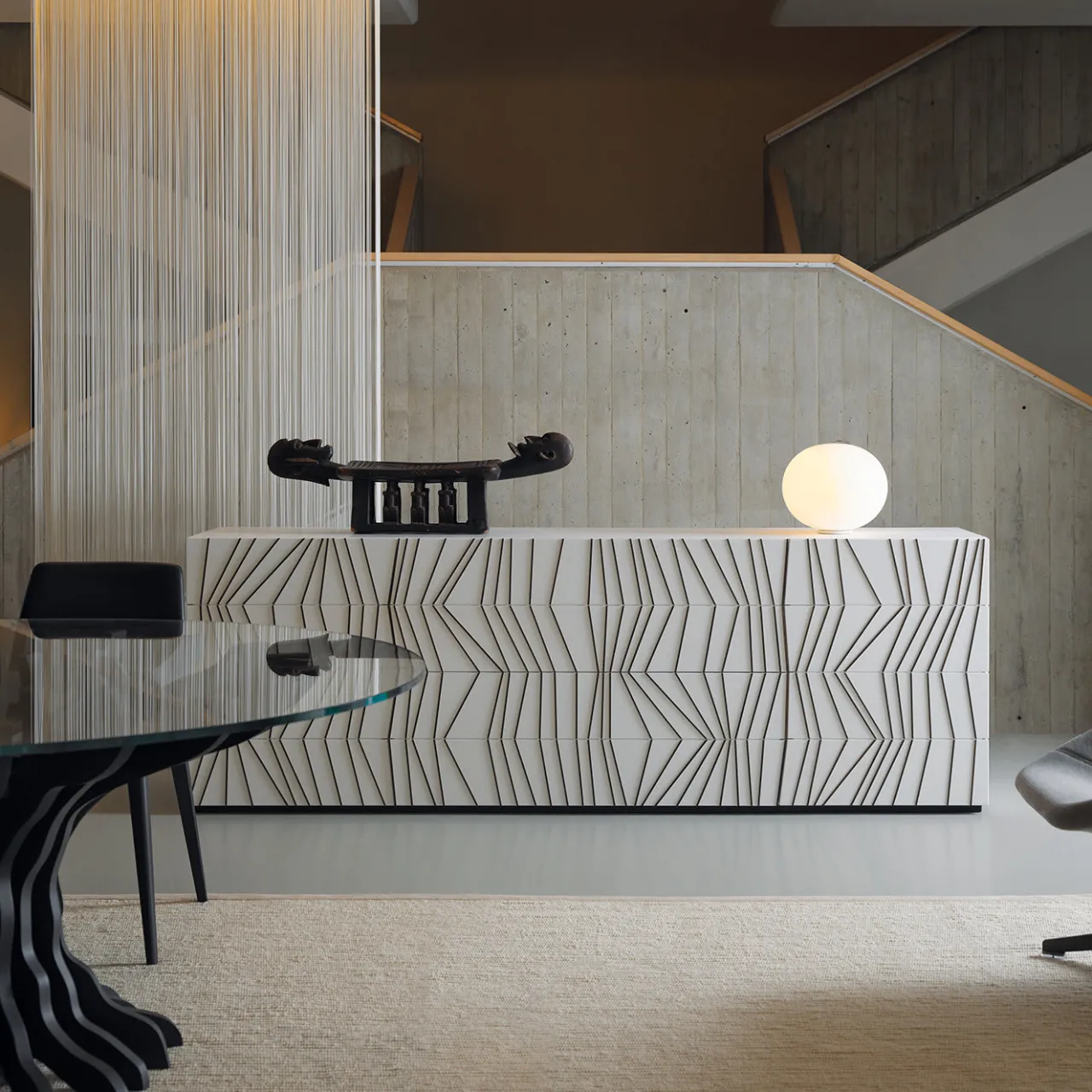 Questa accattivante credenza è un pezzo d’arredamento sofisticato che farà la sua figura in qualsiasi interno contemporaneo. Realizzata a mano in legno di frassino, presenta una finitura laccata bianca opaca arricchita da linee geometriche in rilievo. La struttura è composta da quattro sezioni: due ante laterali e due serie di cassetti al centro, dotati di un meccanismo di apertura push-pull. Un cassetto aggiuntivo è nascosto all’interno, proprio sotto il piano, per un maggiore spazio di archiviazione.