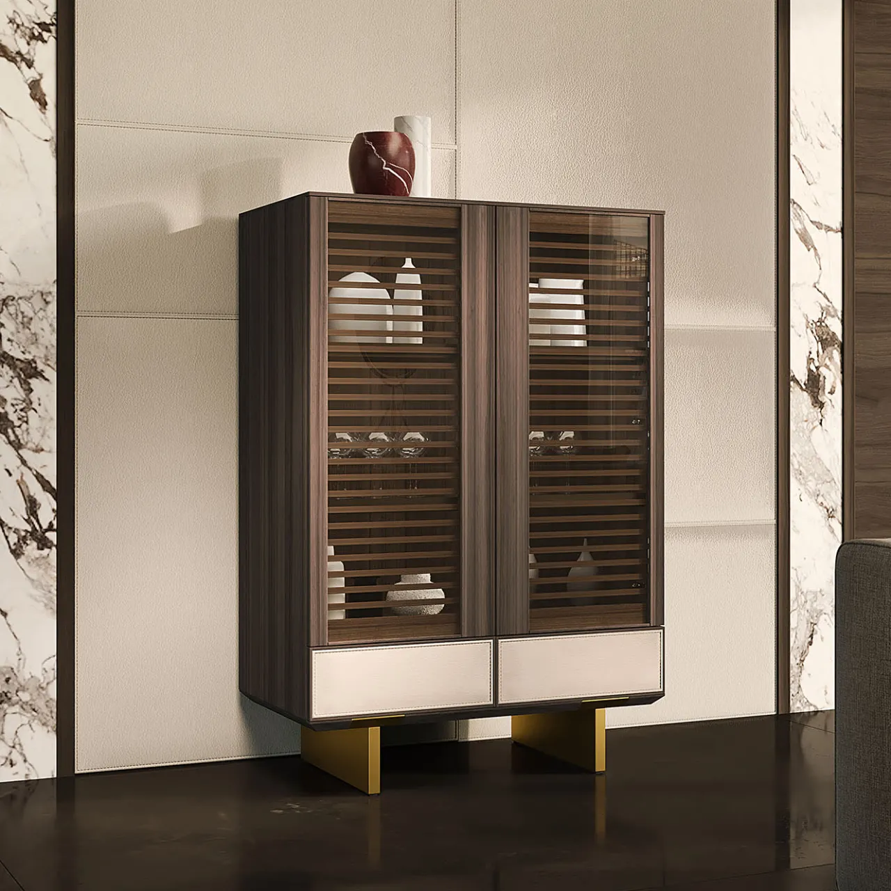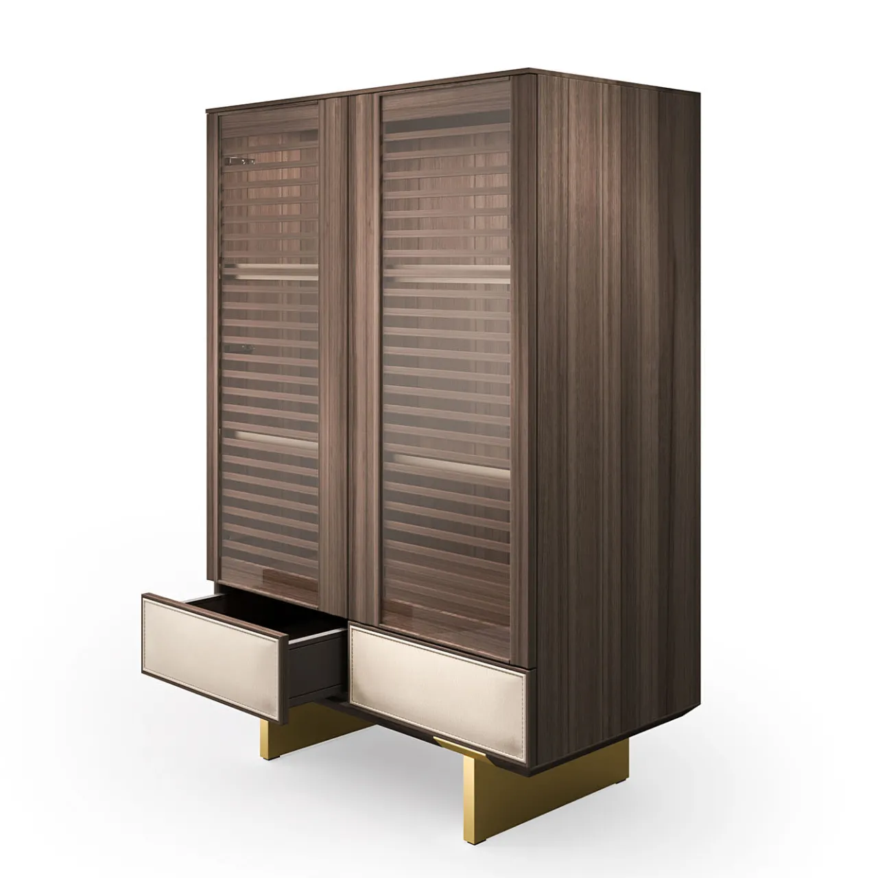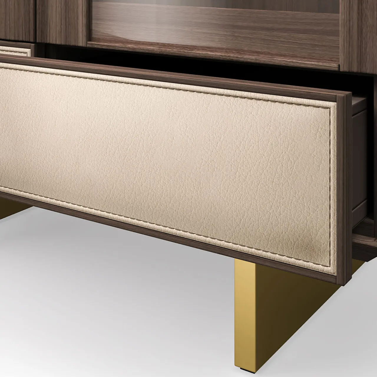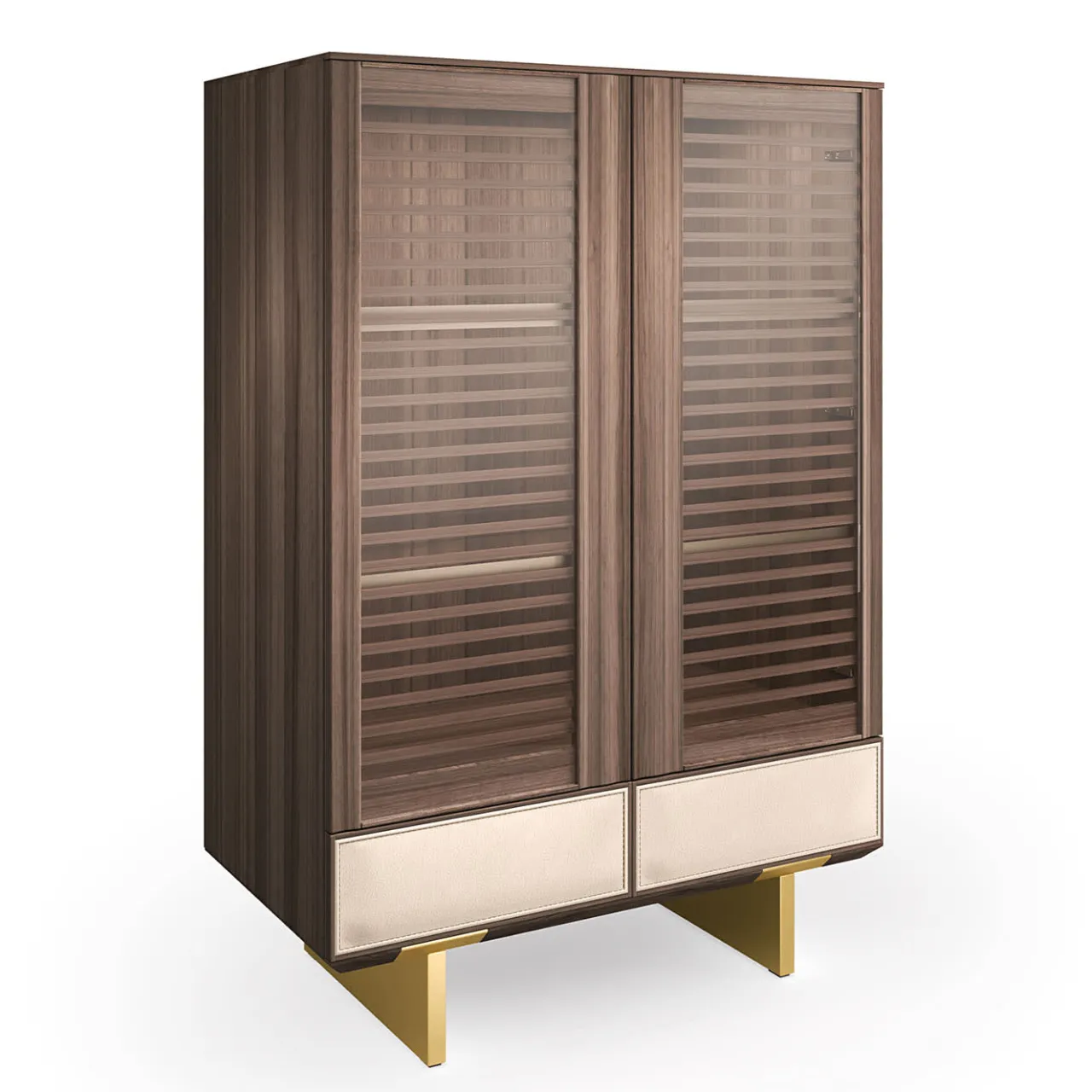 La Madia Solferino è un’opera d’arte funzionale. Il noce canaletto brunito incornicia i cassetti in pelle beige, creando un contrasto tattile. Le ante in vetro a doghe svelano il contenuto interno con delicatezza. La base, con dettagli dorati, aggiunge luce e lusso. Un mobile che invita al tatto e all’ammirazione, perfetto per chi ama materiali pregiati e design sofisticato.