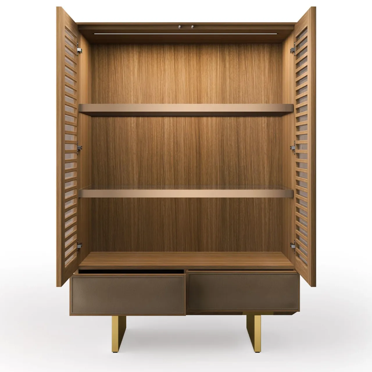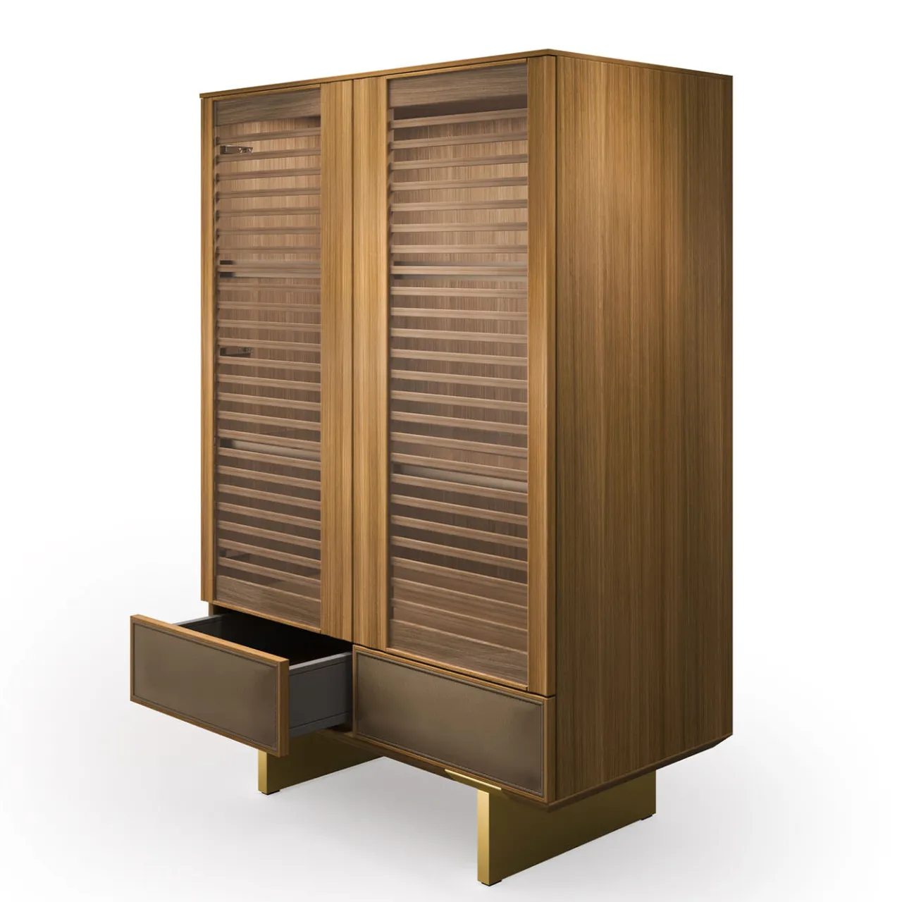 La Madia Solferino celebra l’eleganza. Il noce canaletto incorni-cia i cassetti in pelle marrone, creando un contrasto tattile. Le ante in vetro a doghe svelano l’interno. I ripiani in alluminio e vetro offrono spazio espositivo, mentre l’illuminazione a LED esalta i dettagli. Ogni elemento è curato, dai materiali alla lavorazione. Un mobile di design contemporaneo, per chi ama la bellezza dei materiali e la cura dei dettagli. La Madia Solferino invita a circondarsi di oggetti che raccontano una storia di passione e maestria.