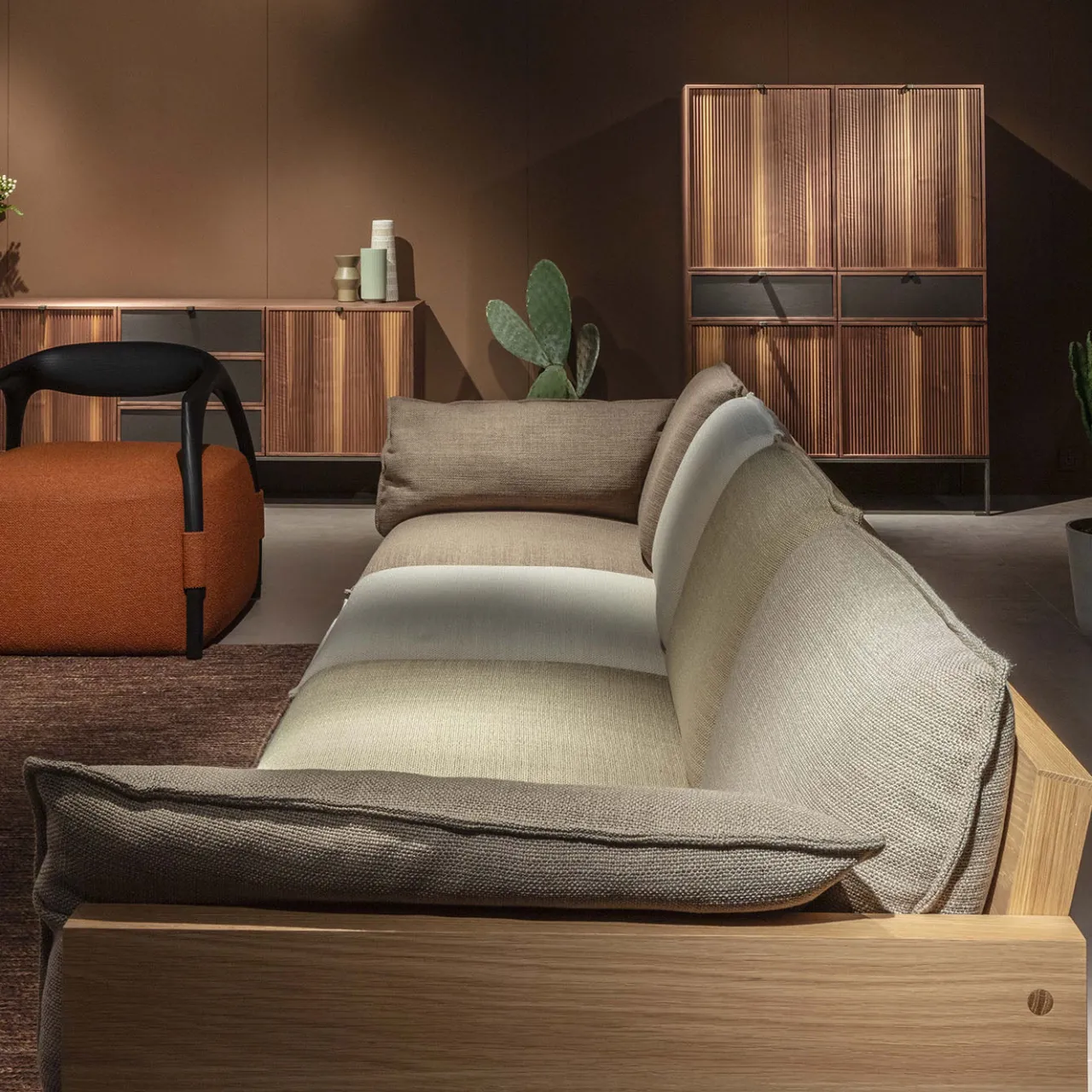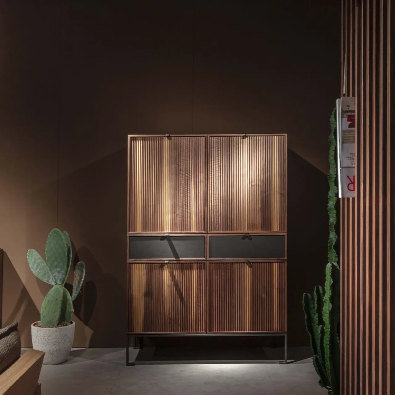 Questo raffinato mobile contenitore, realizzato in legno di noce canaletto e sostenuto da un’elegante base in metallo, è un esempio di raffinata maestria e design. Con un piano in legno, quattro ante in legno scanalato e due cassetti rivestiti in pelle, ogni dettaglio è progettato per evidenziare l’eccellenza artigianale. Si apre per rivelare ripiani in vetro e un pannello posteriore a specchio. Personalizzabile in varie opzioni di legno, questo pezzo unisce raffinatezza e funzionalità, rendendolo un’aggiunta di spicco a qualsiasi interno.