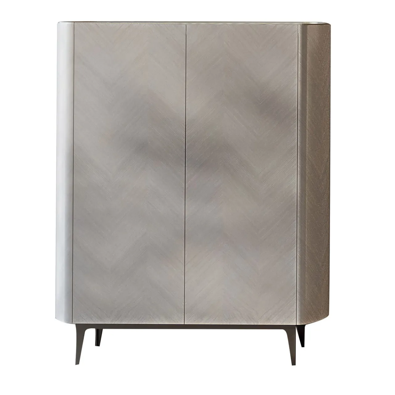 Mobile con intarsio geometrico in Tay scuro, anta a ribalta e cassetti, interno in noce canaletto, ripiani interni in vetro bronzato e fronte dei cassetti interni rivestito in pelle. Piano in marmo verde Lepanto opaco e profilo in pelle. Piedi in metallo nella finitura bronzo-oro, disponibili anche nelle finiture piombo e brunito. Disponibile anche con intarsio in Tay chiaro e noce canaletto. Piano in vari tipi di marmo, illuminazione interna su richiesta.