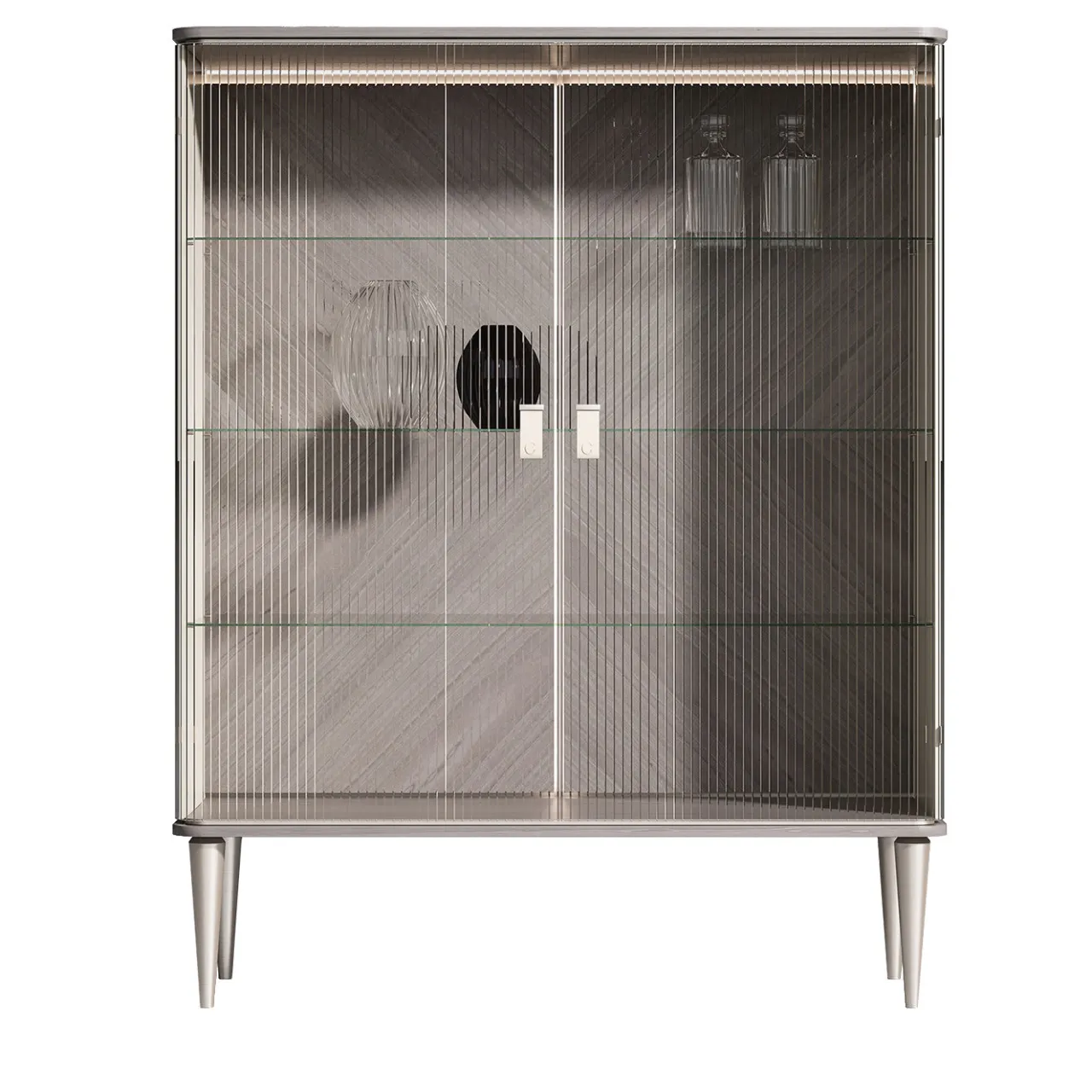 Questo mobile unico, frutto di una sapiente maestria artigianale e di un’estetica innovativa, emana eleganza e raffinatezza. Poggiato su quattro piedini conici in legno con finitura grigia, il mobile in legno laccato beige presenta un sofisticato motivo a fusti scanalati e due ante in vetro con strisce verticali incise. All’interno, il mobile è dotato di tre ripiani in vetro impreziositi dalla finitura grigia e dalle luci incassate. Questo mobile, di una leggerezza e di un equilibrio visivo fuori dal comune, si inserisce perfettamente in qualsiasi salotto, sala da pranzo o studio.