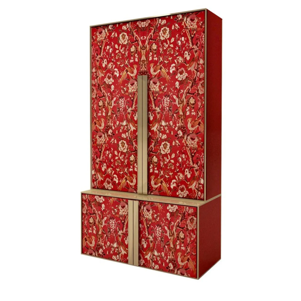 Questo elegante mobile contenitore presenta una struttura in legno laccato lucido rosso corallo con finiture in ottone spazzolato effetto oro. I pannelli frontali sono rivestiti in un pregiato tessuto di seta lavorato a jacquard, un lampasso con un motivo orientale che riprende le decorazioni dei paraventi di Coromandel. Le maniglie in rilievo sono in ottone dorato e lucido. L’interno è rifinito in legno laccato opaco rosso corallo, con due cassetti superiori e due ripiani in vetro trasparente. Uno specchio sul fondo rende l’insieme più elegante e luminoso.