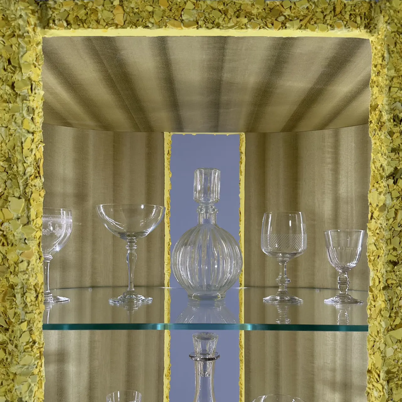 Semplicemente esigente, questo singolare pezzo artistico offre una soluzione eccentrica per esporre oggetti da collezione o collezionare whisky con inaspettata originalità. La struttura a giorno è caratterizzata da fianchi avvolgenti il cui manto fatto a mano di scaglie di supergesso giallo si abbina ai piedi affusolati per una dichiarazione cromatica fresca e coerente. Un’impiallacciatura in tinta impreziosisce il mobile interno, organizzato in tre ripiani in vetro e illuminato da un elegante sistema di illuminazione a LED.