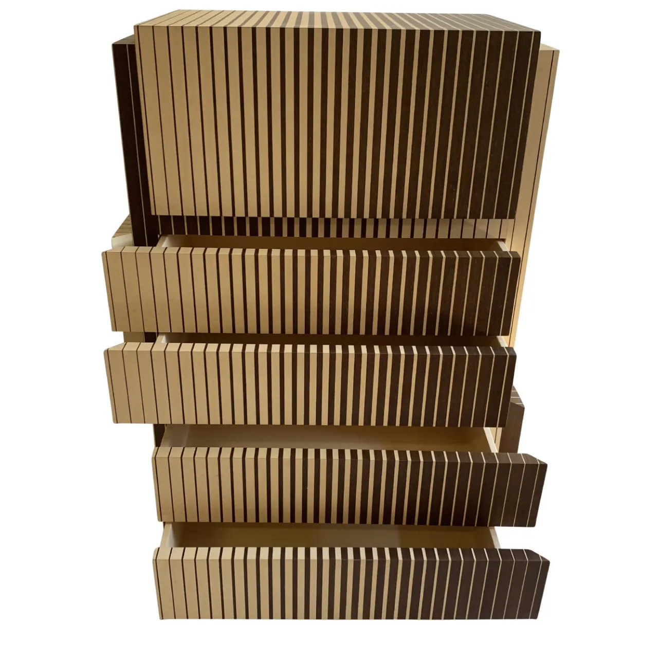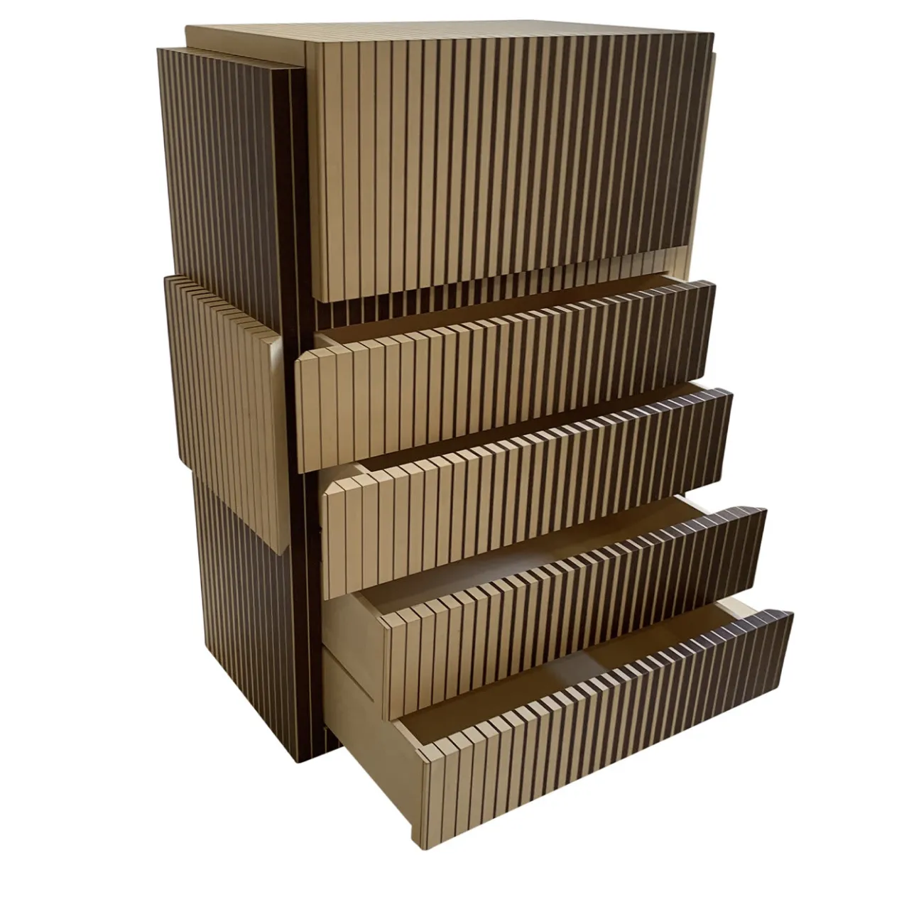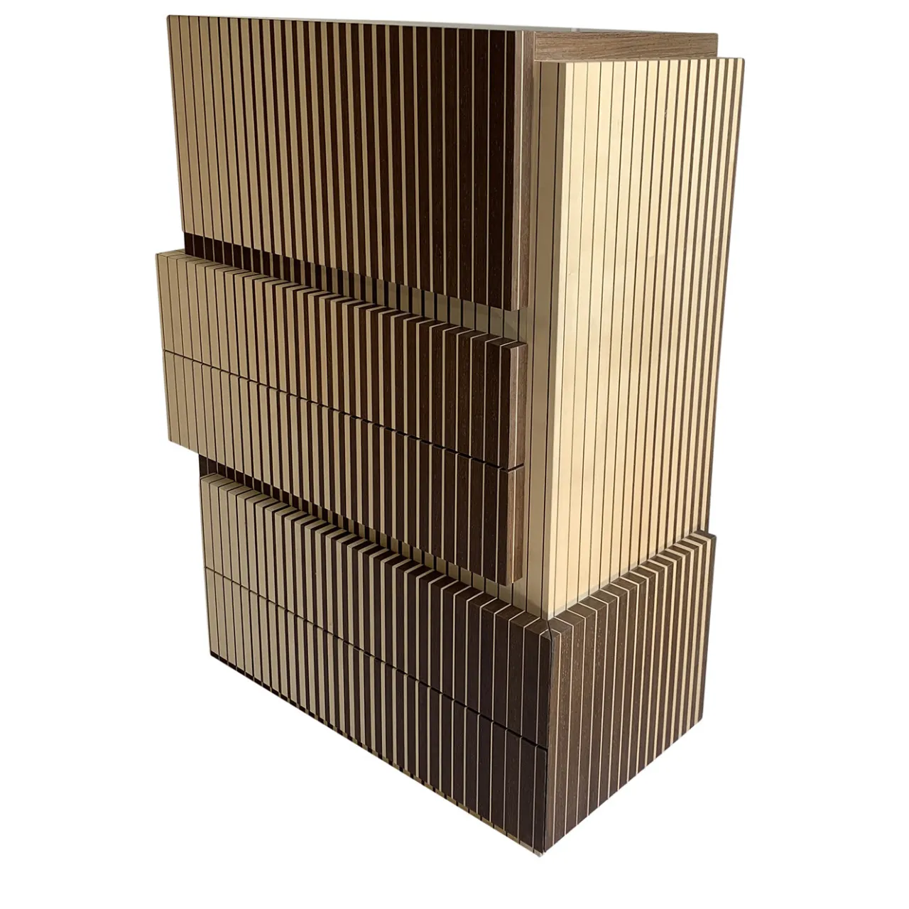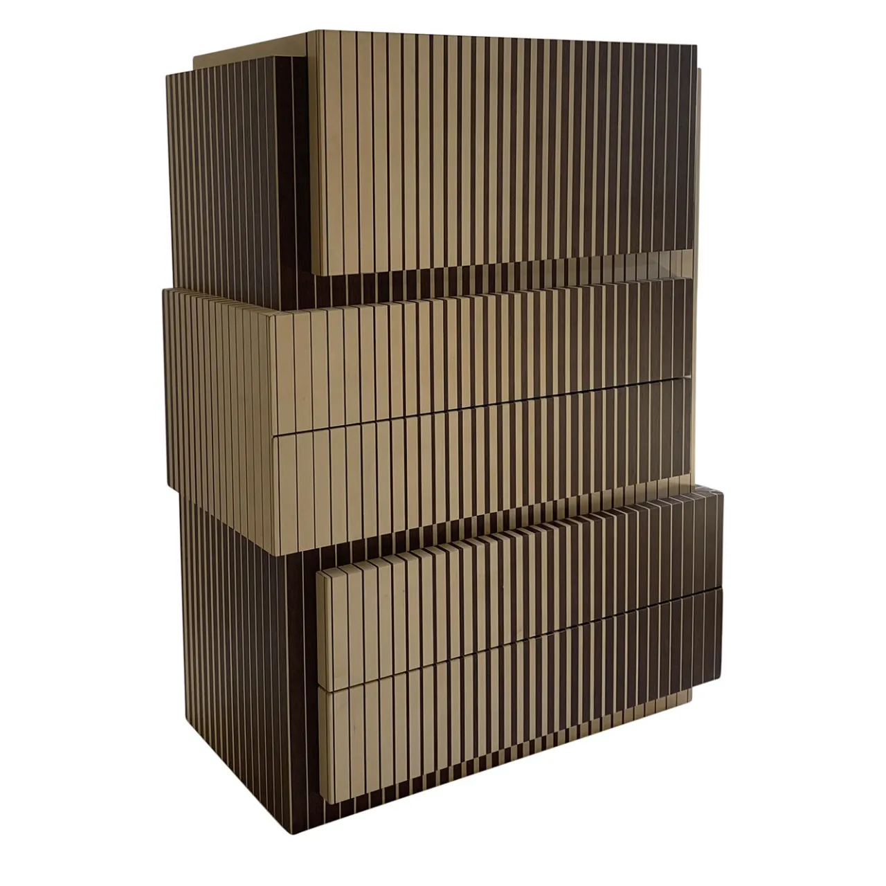 Caratterizzato da un accattivante senso di movimento, questo mobile infonderà un fascino inconfondibile sia in un ambiente classico che contemporaneo. Pezzo unico creato per un concorso di design italiano, è interamente realizzato a mano in legno impreziosito da un’impiallacciatura in acero bicolore. Composto da quattro cassetti e da un’anta superiore che nasconde due vassoi estraibili, la sua dinamica forma modulare colpirà lo sguardo di chiunque si trovi nella stanza.