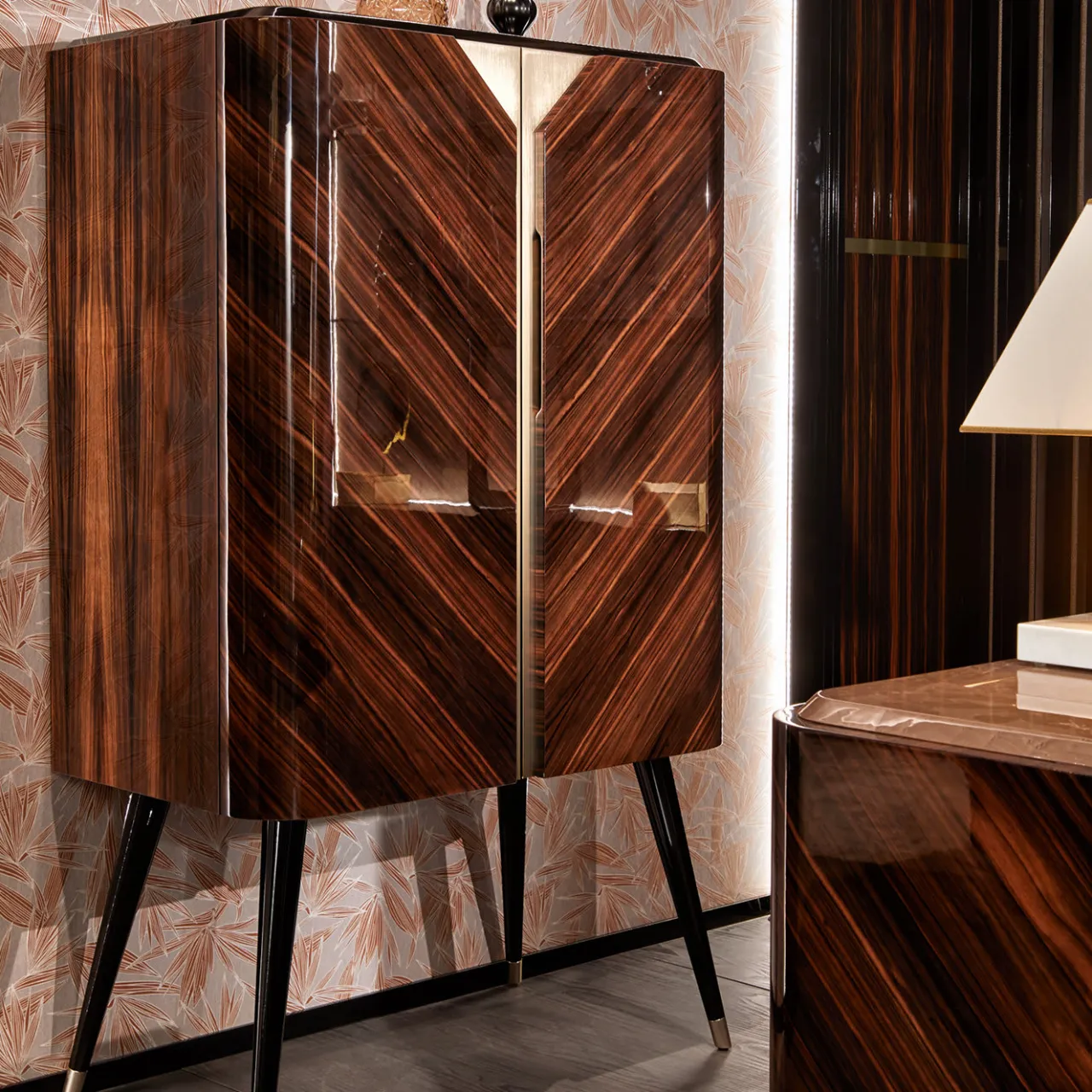 Testimonianza della bellezza del legno naturale, il mobile bar Brent è realizzato in splendido ebano Macassar, con pannelli accuratamente posizionati che esaltano le venature del legno. Poggiato su gambe svasate ispirate al design moderno di metà secolo, il mobile bar con finitura lucida attira l’attenzione e promette una cena incantevole. Due ante, accenti dorati. È disponibile anche una versione più alta del mobile.