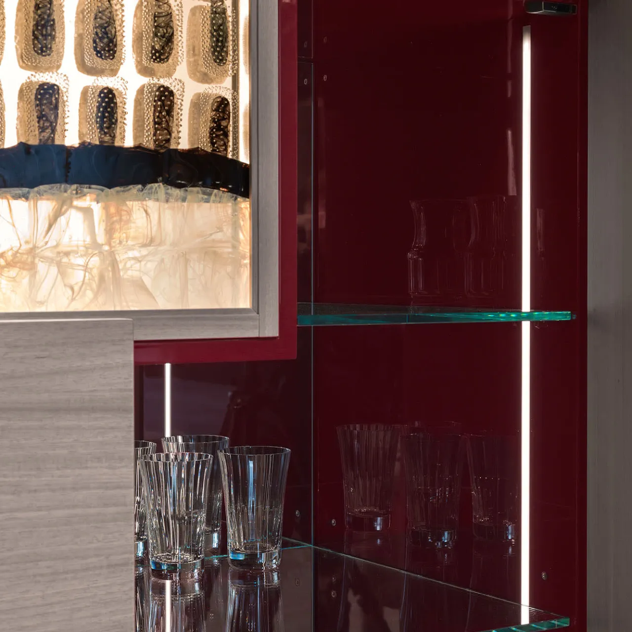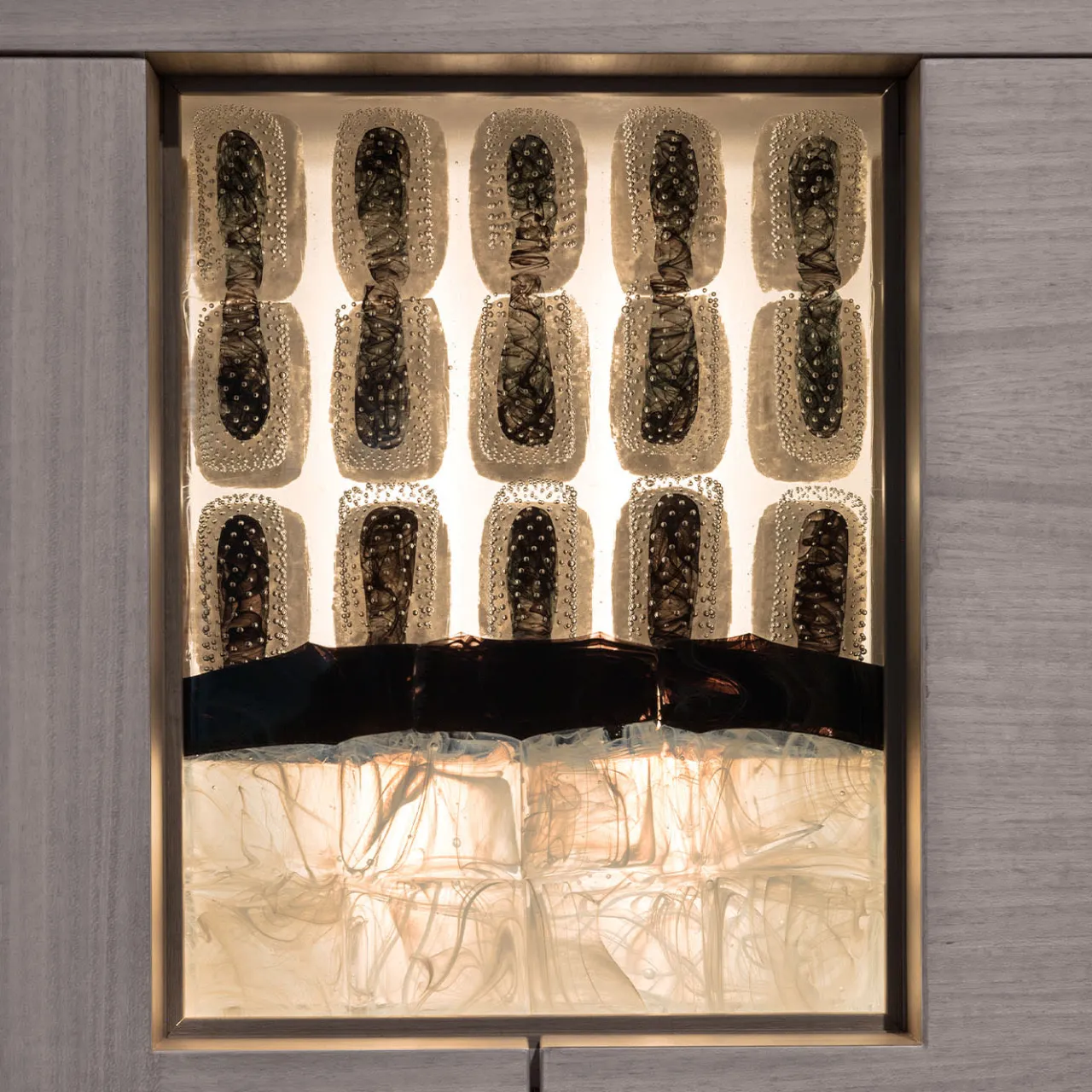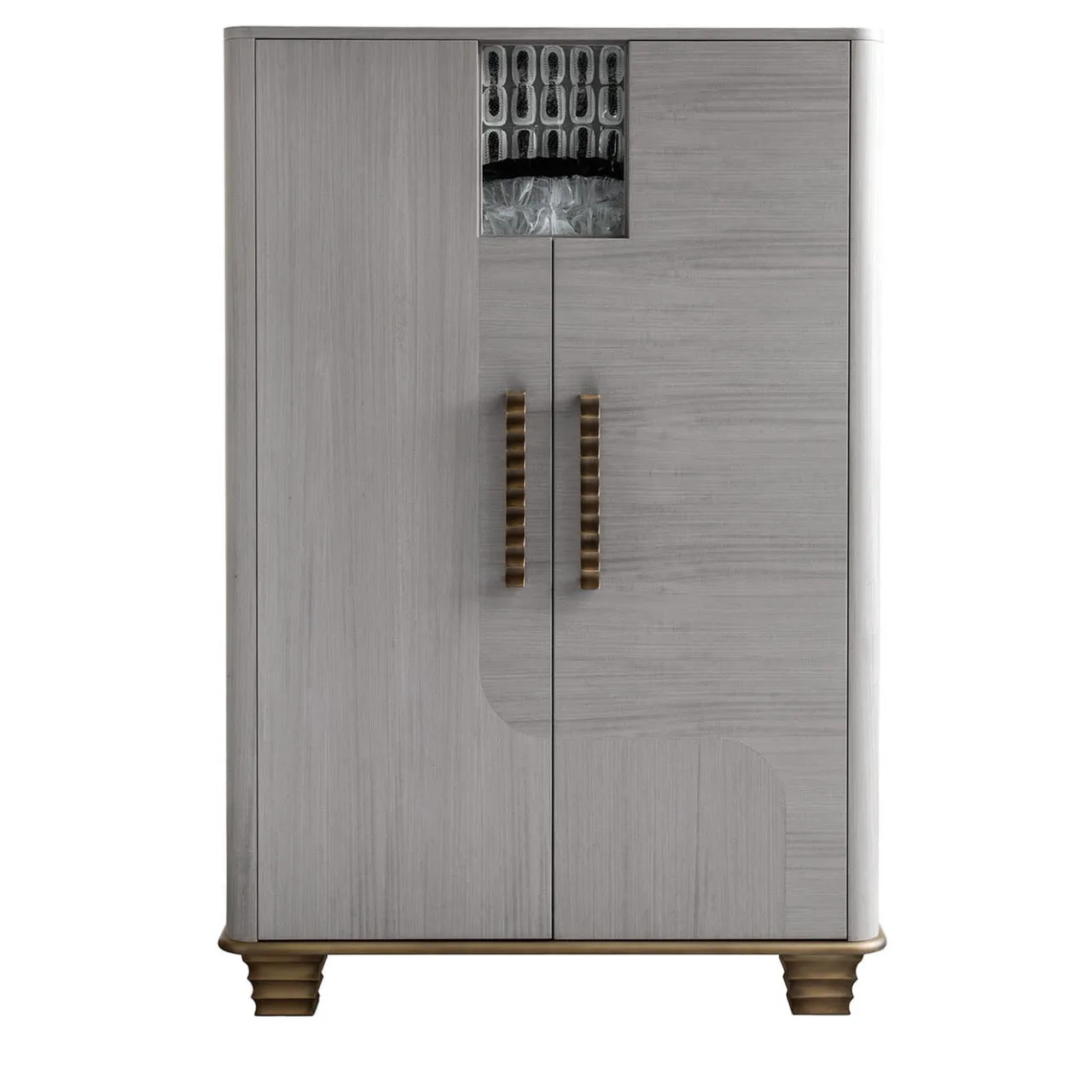 Un pezzo di valore inestimabile, arricchito da inserti in vetro retroilluminati da luce LED, questo mobile è un’aggiunta superba a lussuosi arredamenti moderni. Le maniglie ondulate in bronzo si armonizzano perfettamente con i piedi in legno scanalato, che presentano una calda e preziosa tonalità bronzata. Le ante si aprono per rivelare un ampio spazio di archiviazione, con ripiani in vetro, fondo a specchio e lati laccati lucidi.