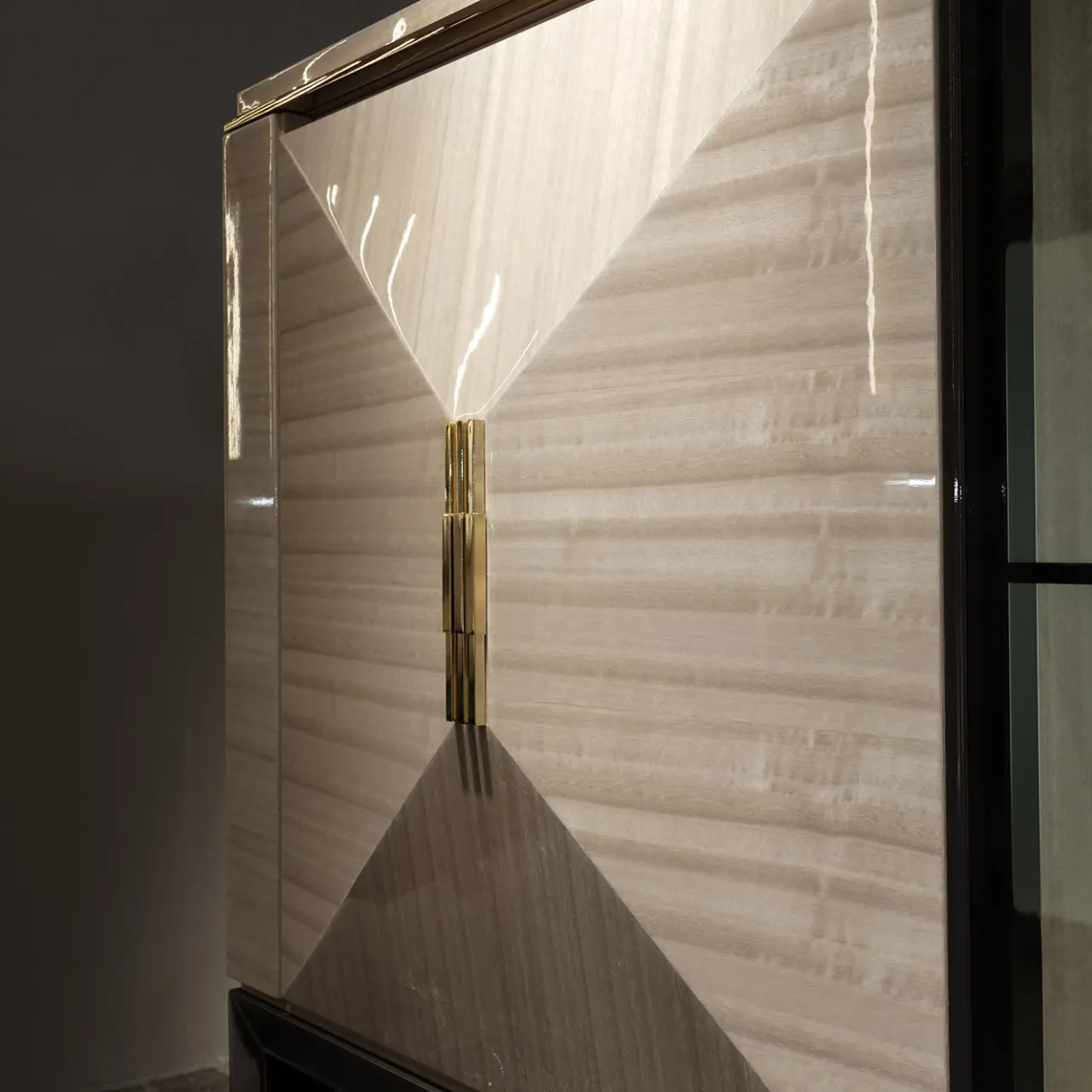 Un mobile bar di grande effetto, con due ante dall’accattivante effetto piramidale 3D e un’anta centrale in metallo verniciato antracite. Realizzato in legno di Eucalipto con finitura lucida, il mobile è impreziosito da eleganti profili in metallo dorato e da accenti decorativi. Le eleganti gambe in faggio tinto antracite sostengono questo pezzo sofisticato, mentre le luci LED integrate illuminano il vano centrale.