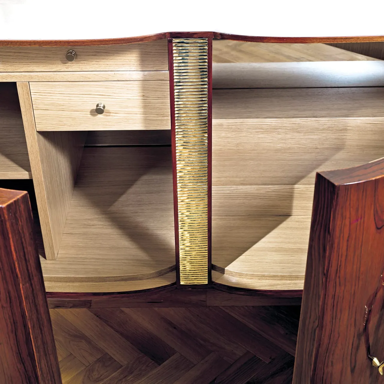 Questo prezioso mobile bar aggiungerà un’allure raffinata e senza tempo a interni moderni e classici, grazie a un design semplice ma sofisticato, abilmente realizzato da esperti artigiani. Presenta una struttura in palissandro Rio, che contrasta elegantemente con il piano in cristallo bianco. Arricchito da dettagli metallici luminosi. Per ulteriori dettagli, rivolgersi al Concierge.