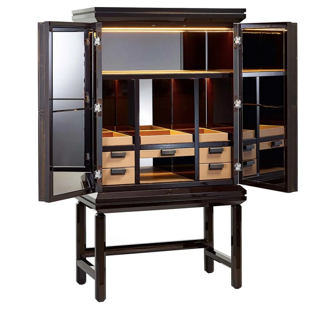 Il mobile bar Ledoux in legno laccato è un complemento elegante per la sala da pranzo, il soggiorno o il salotto. Pratico e dal design elegante, presenta diversi cassetti e spazi per gli oggetti essenziali da bar, ante a battente con bordi profilati, inserti in ottone brunito e vetri prismatici della collezione ColibrÌ.
