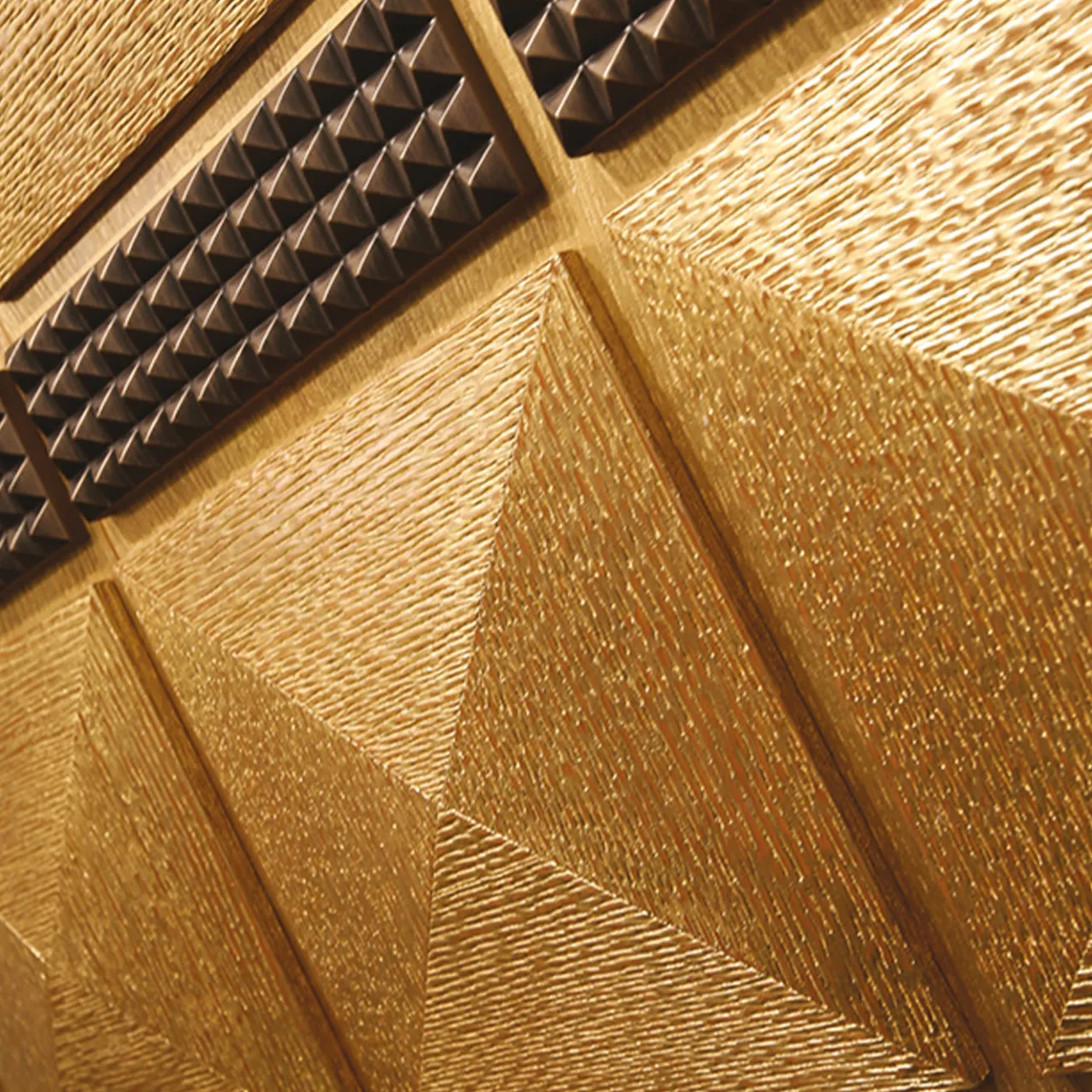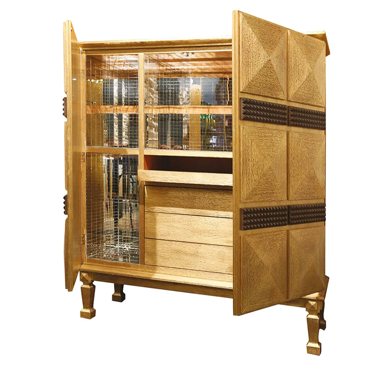 Maestoso e sensuale, questo mobile bar si inserisce senza sforzo in un salotto sofisticato di ispirazione Art Déco. L’imponente struttura, che poggia su quattro piedi scolpiti, è realizzata in rovere decapato e ampiamente ricoperta di pregiata foglia d’oro per un look di lusso. Due ante con disegni di piramidi in rilievo si aprono per rivelare l’ampio vano portaoggetti, dotato di cassetti e unità con ripiani in vetro dove raccogliere raffinate collezioni di bicchieri e rari liquori.