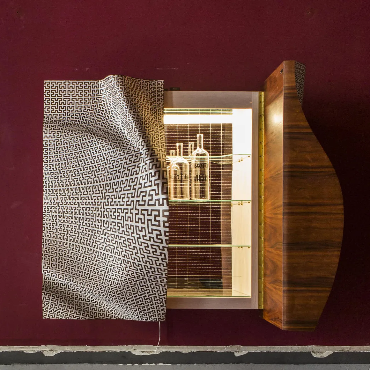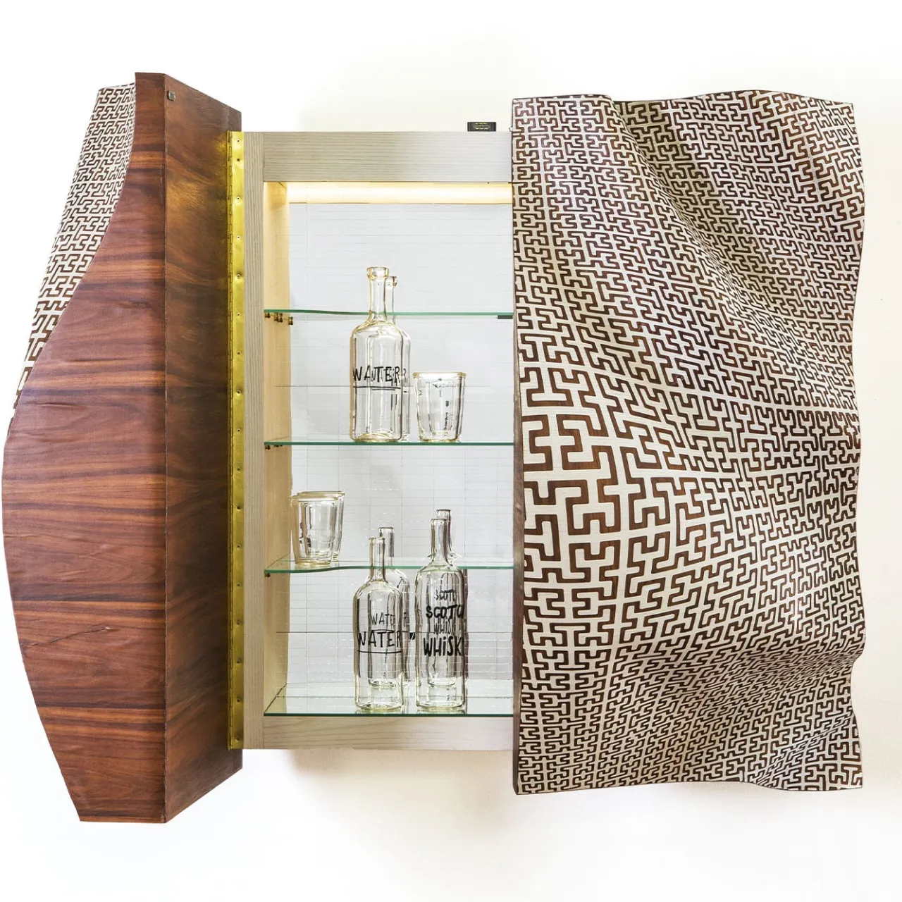 “Una” è il nome della collezione che deriva dalla grammatica italiana dove l’articolo indeterminativo precede un sostantivo non identificato. Gli oggetti giocano sull’ambiguità della materia che può ingannare l’occhio: un elemento robusto come il legno, intagliato e levigato a mano, sembra un arazzo leggero. Le curve e il morbido panneggio del legno sono ispirati da un lungo e attento studio dell’uso del panneggio nella storia dell’arte, che va dall’antica Grecia alle sculture del Bernini.