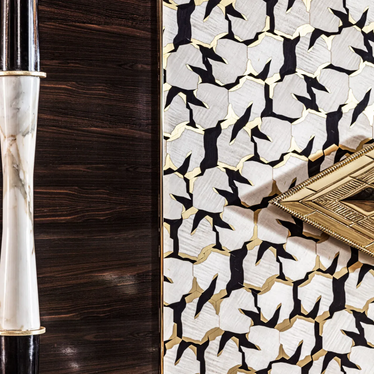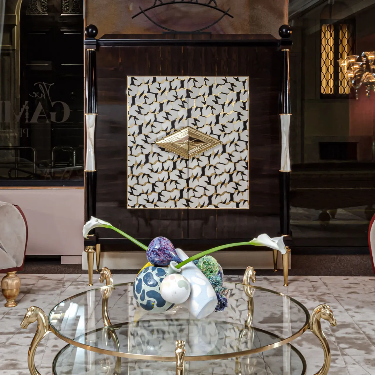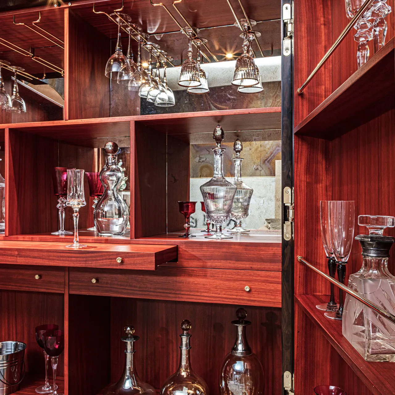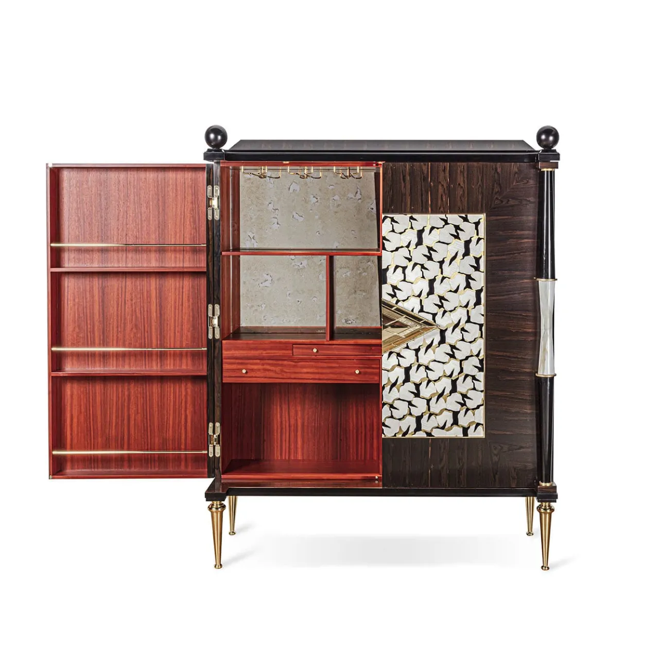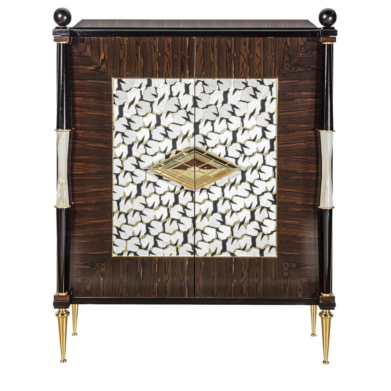 Mobile bar in legno di ziricote con intarsi in acero scurito e ottone. Le colonne in marmo sostengono la robusta struttura, impreziosita da ornamenti in ottone.