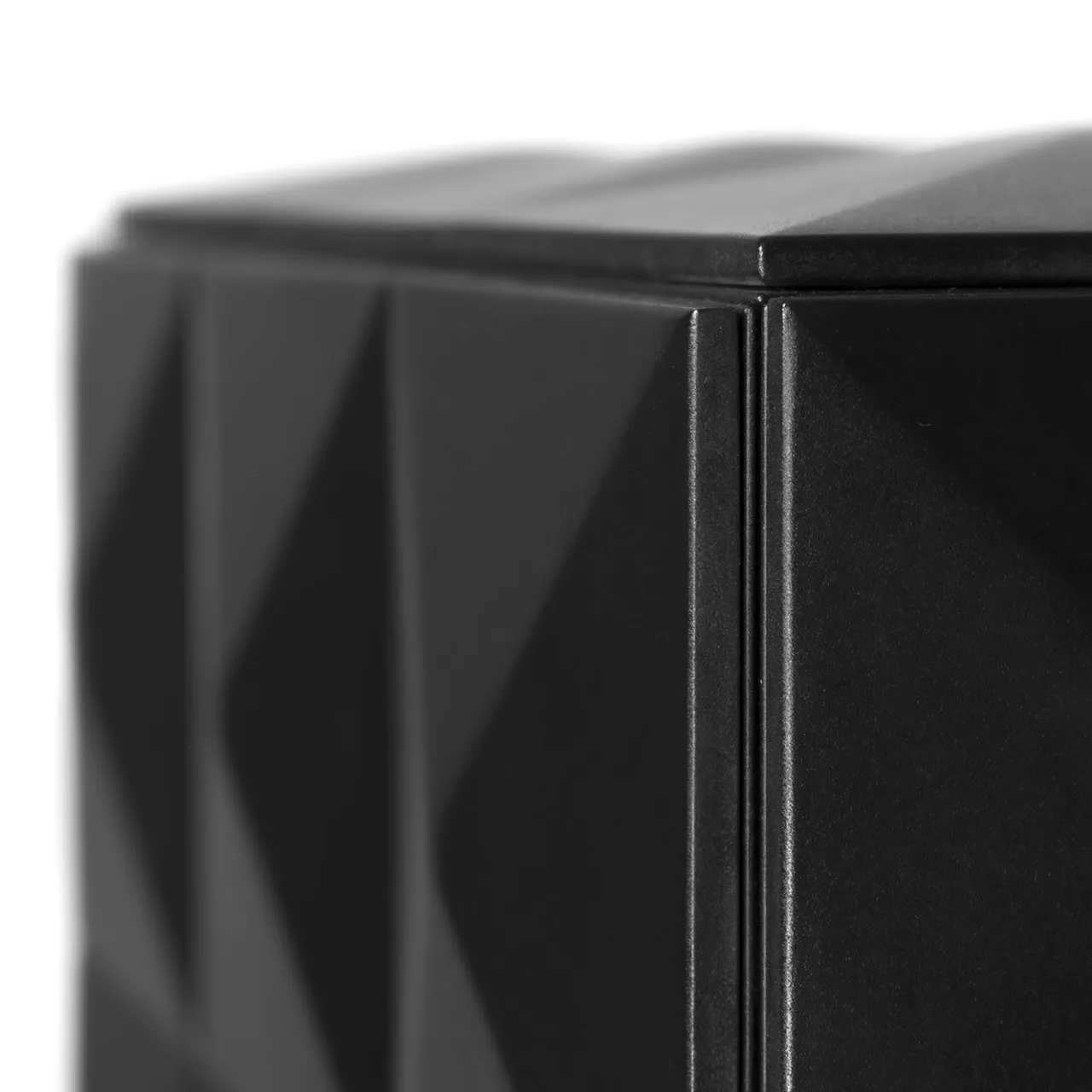 Questo mobile distintivo e ultramoderno è rivestito con piastrelle magnetiche piramidali di sezione 15×15 cm. Realizzato interamente in MDF laccato testurizzato, presenta 2 ante a battente, una fascia centrale fissa e ripiani interni. Il mobile si apre con un pomello ed è sostenuto da una base in metallo laccato nero di sezione 25×25 cm. Possibile fornitura del solo kit piastrelle.