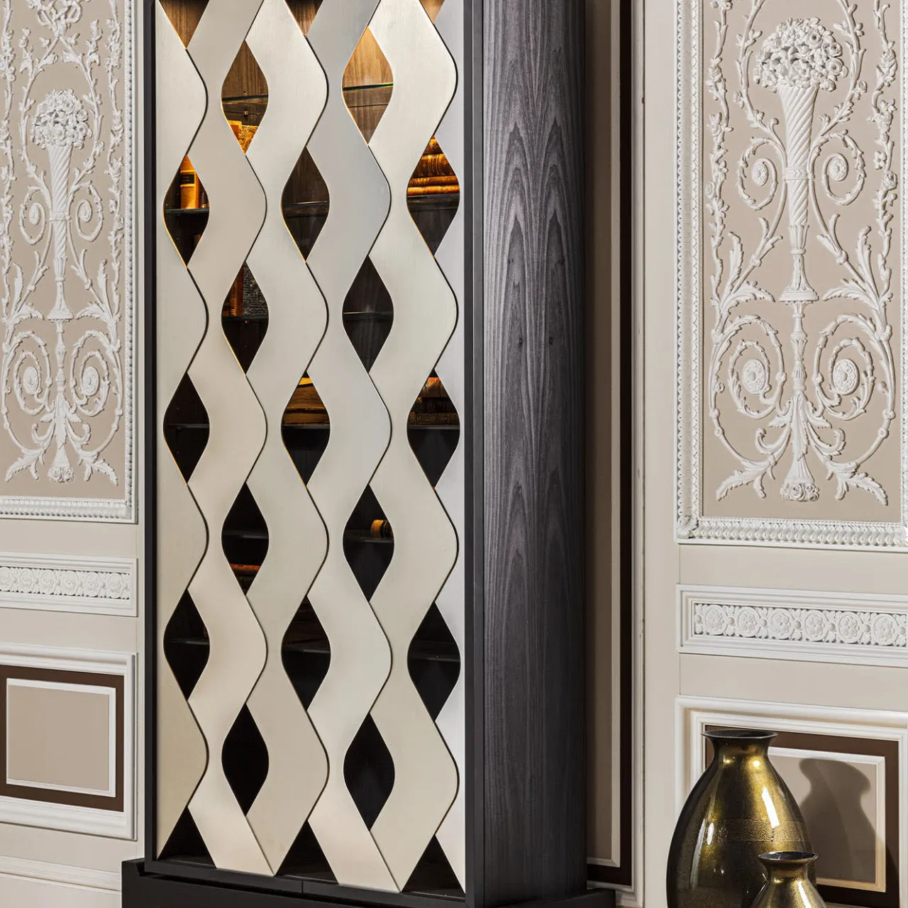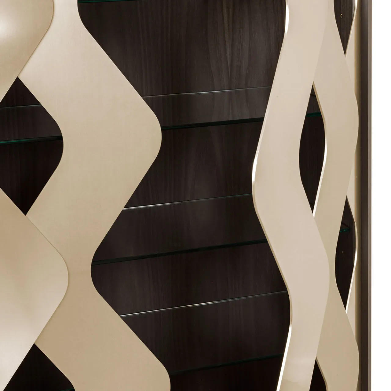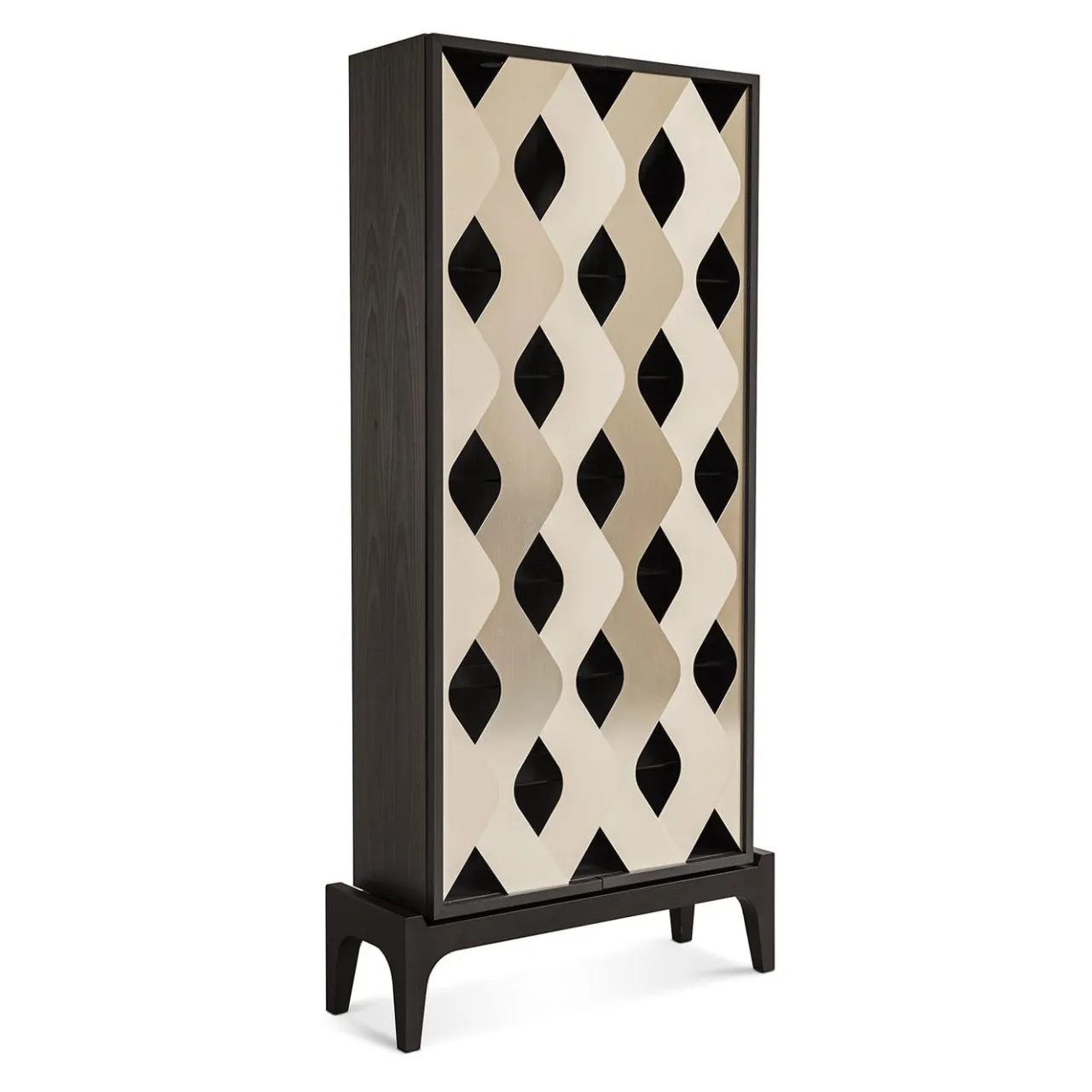 Mobile in legno Bolivar con base in rovere e ante a forma di onda in alluminio zincato.