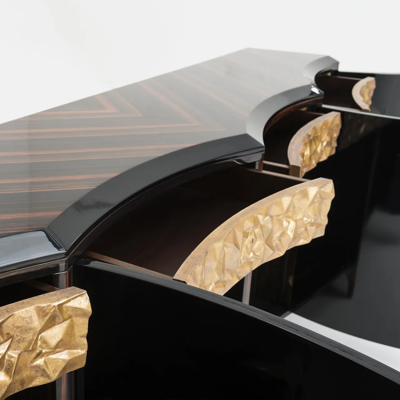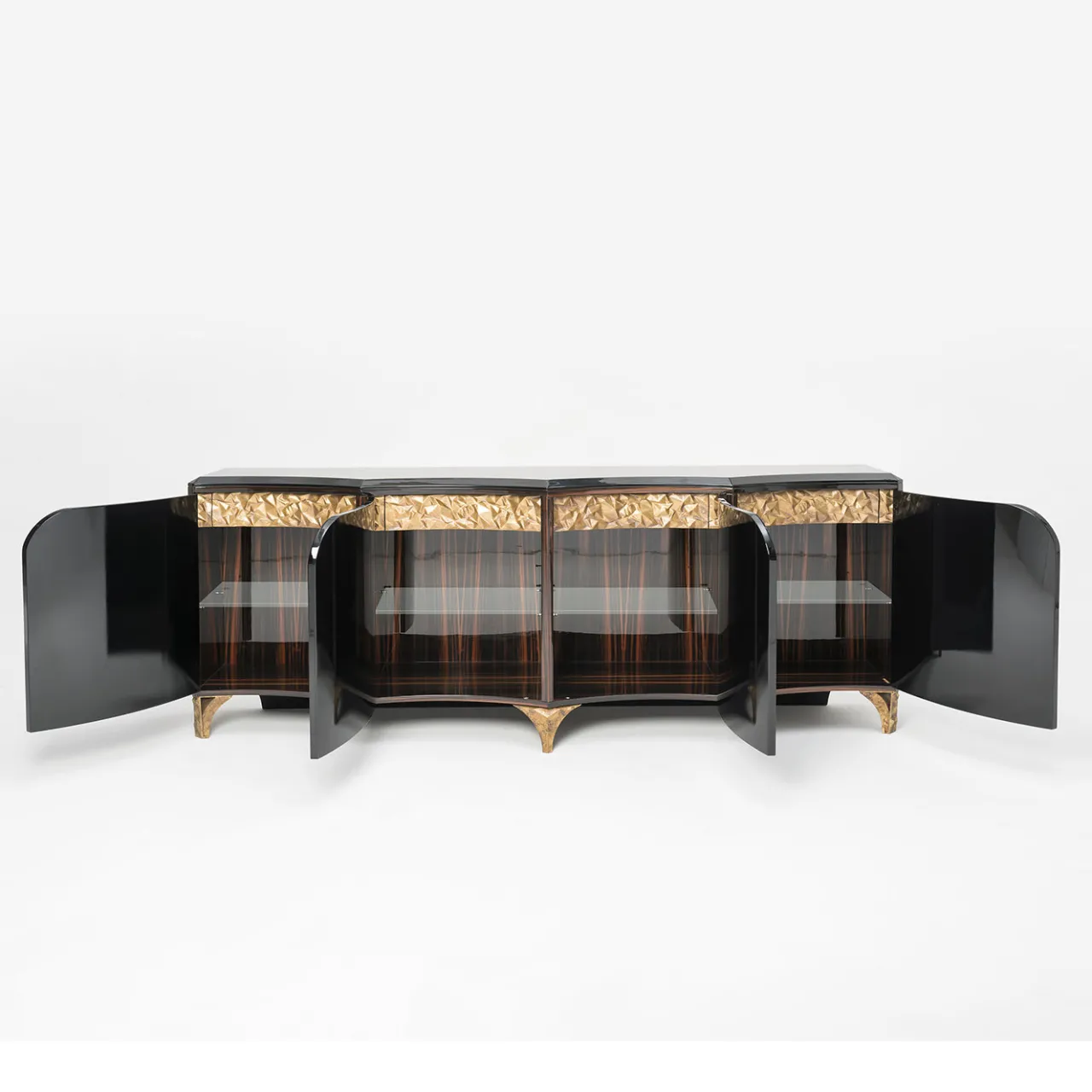 Con il piano, i pannelli laterali e quelli interni impiallacciati in ebano, l’accattivante buffet Ermes della collezione Cosmopolitan fa bella mostra di sé in qualsiasi ambiente tradizionale o moderno. Le ante e i bordi sono laccati in nero lucido, mentre i piedini e i dettagli sulla parte anteriore sono rifiniti in foglia d’oro. I ripiani interni sono in cristallo extra chiaro.