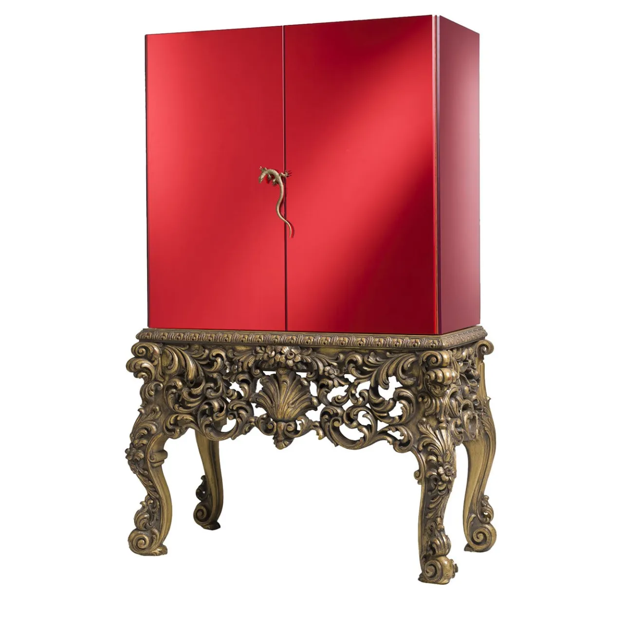Abilmente intagliato in uno splendido design di sofisticato valore ornamentale, questo mobile sarà un’aggiunta maestosa e sontuosa a uno spazio interno elegante. Rifinito in oro antico, il basamento in legno sostiene il mobile a due ante, rivestito da uno specchio laccato arancio accostato all’interno laccato nero opaco, arricchito da ripiani in vetro nero. Disegnato da Ferruccio Laviani, si distingue per la maniglia in ottone a forma di geco.