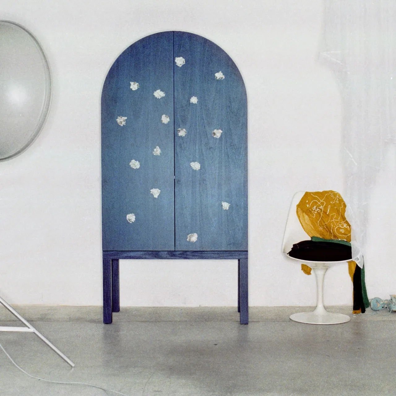 Realizzato da Sergio Mannino, questo mobile incarna un design senza tempo e una maestria artigianale, fondendo perfettamente forma e funzione con eleganza e innovazione. Le sue doppie ante vantano inserti in ceramica fatti a mano, ciascuno impreziosito da una lucente finitura bianca, che aggiunge un tocco di unicità a ogni pezzo. La sofisticata finitura in legno blu è completata da pratici ripiani laccati bianchi. Con piccole imperfezioni che ne esaltano il fascino, questo mobile è un’autentica opera d’arte.