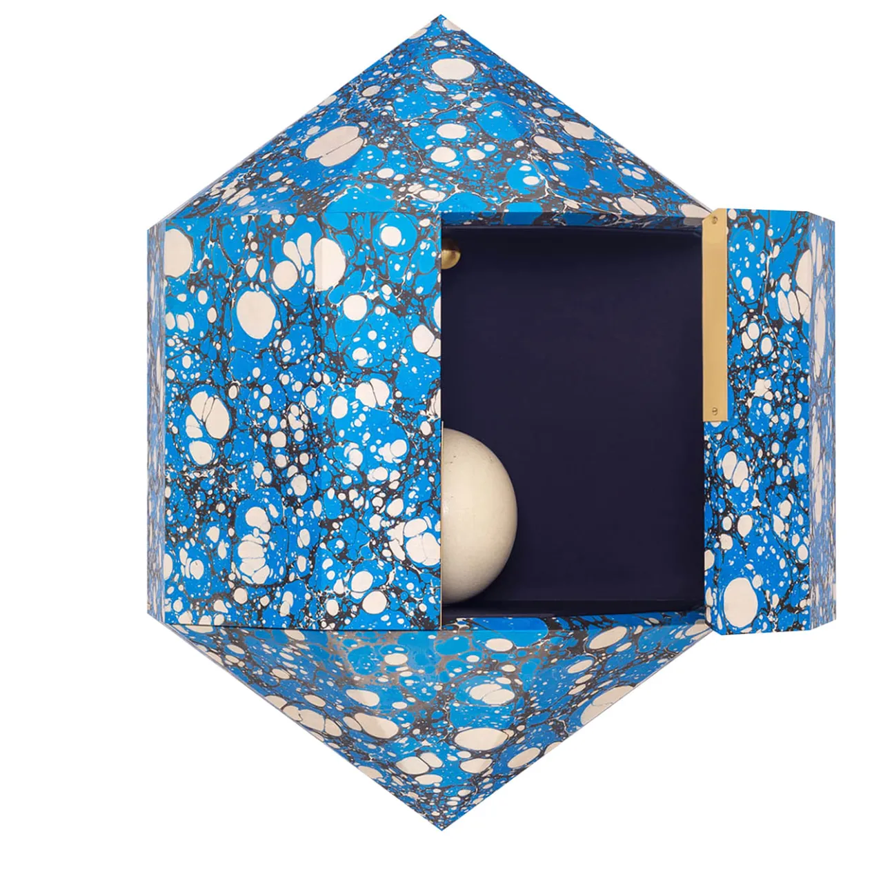 Questo elemento nasce dall’unione di riferimenti dal significato profondo: tabernacoli e pietre preziose. Realizzato in legno, è un mobile che vuole diventare il custode delle piccole gioie domestiche e dei riti quotidiani. L’esterno è rivestito di carta di cotone marmorizzata, realizzata a mano da esperti artigiani umbri, mentre l’interno è rivestito di ottone lucido e specchi, capaci di esaltarne il contenuto. Può essere declinato in molti modi, da altare domestico a mobile bar.