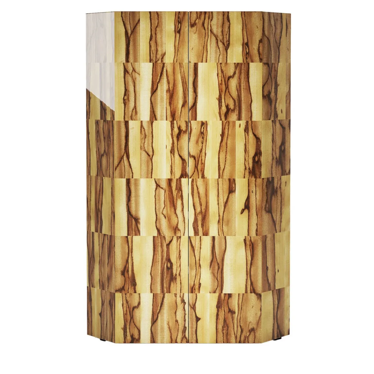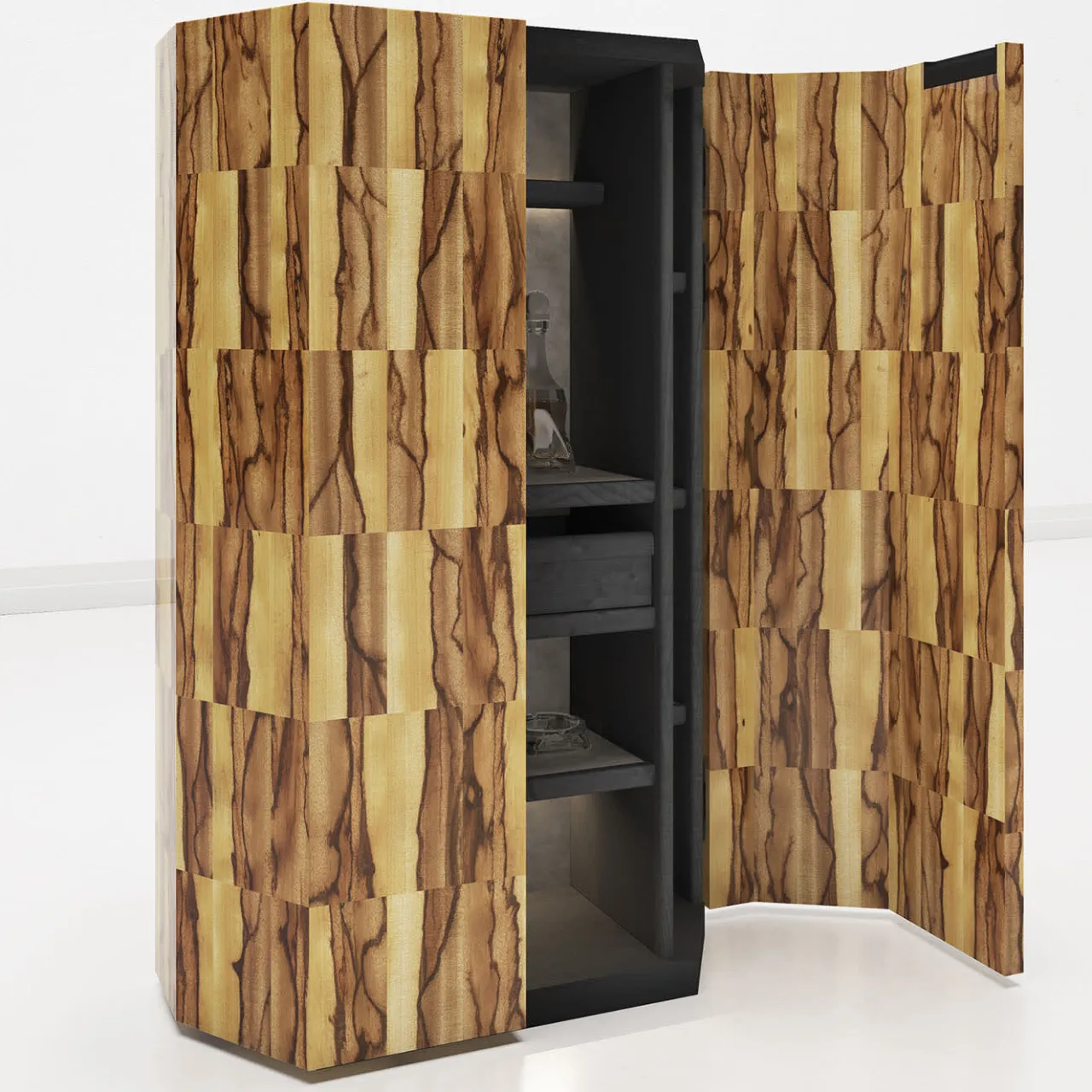 Il mobile Senza Fine presenta una struttura in frassino nero sabbiato con schienale interno foderato in pelle di velluto e ante impiallacciate in legno Black Antiaris laccato poliestere lucido. La tecnica di cucitura utilizzata per il Black Antiaris crea una superficie ricca e strutturata, aggiungendo carattere al pezzo. Grazie a un meticoloso processo di finitura con cinque strati di vernice, ciascuno dei quali essiccato per tre giorni, il risultato è una lucentezza radiosa, che mette in risalto l’artigianalità e l’eleganza di questo mobile contenitore.