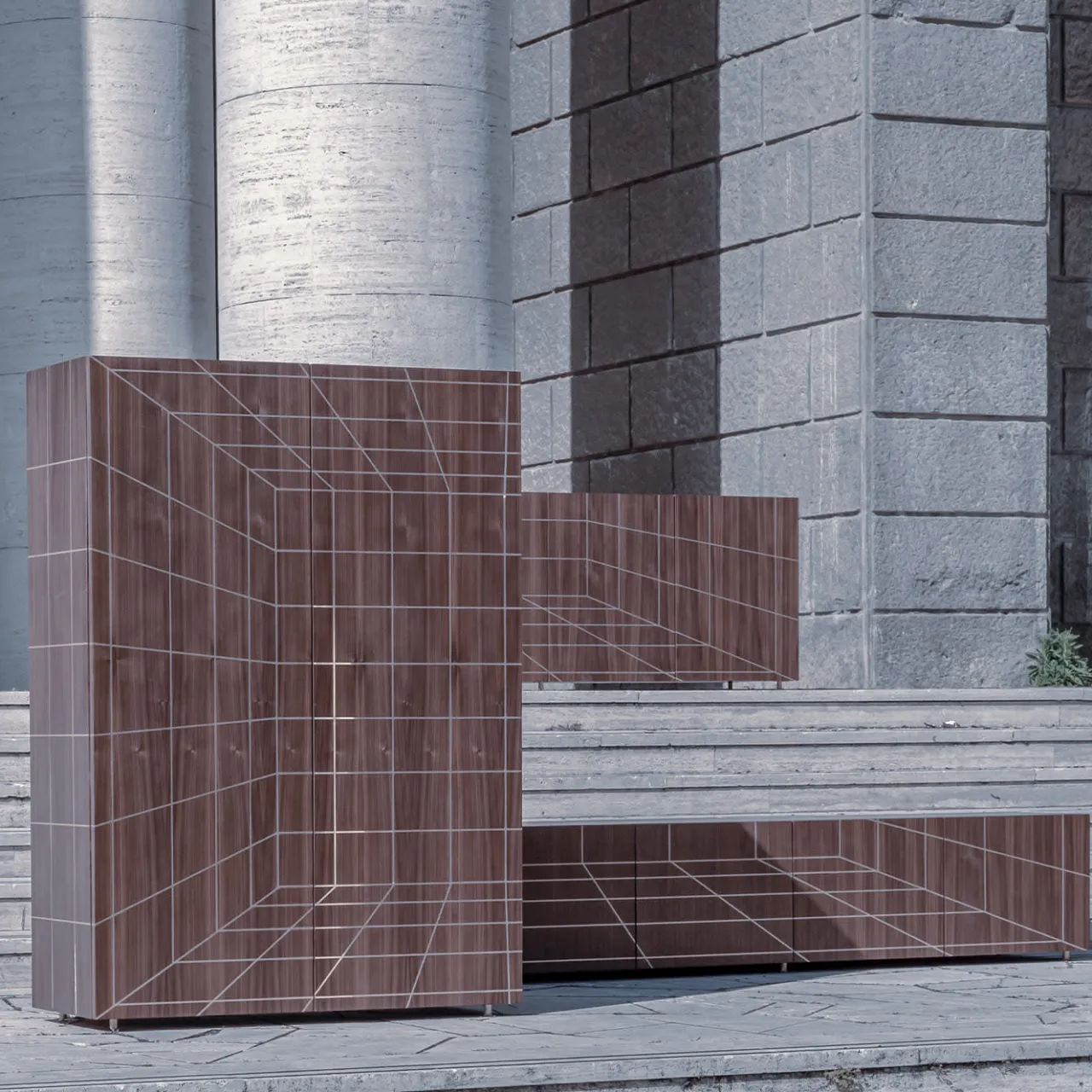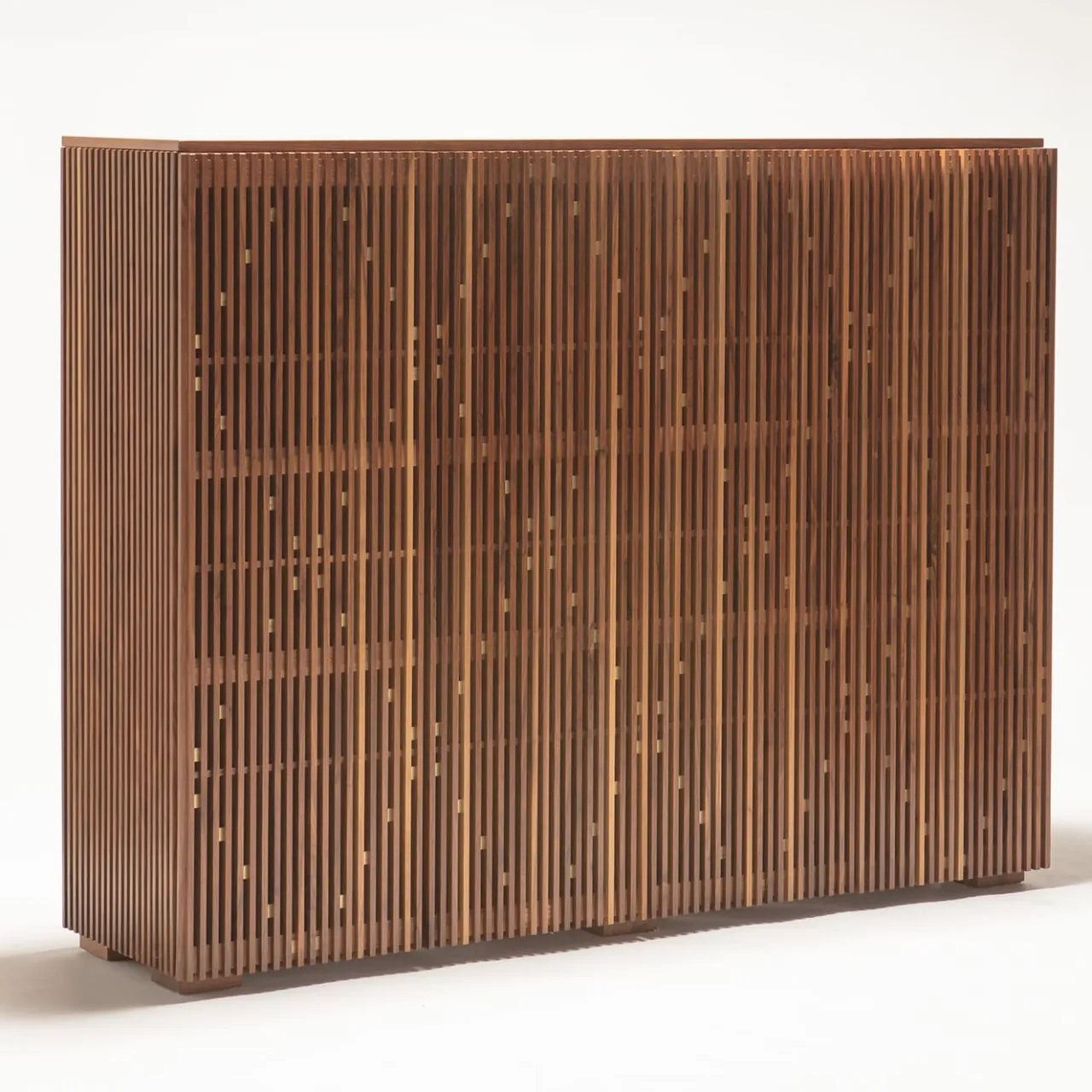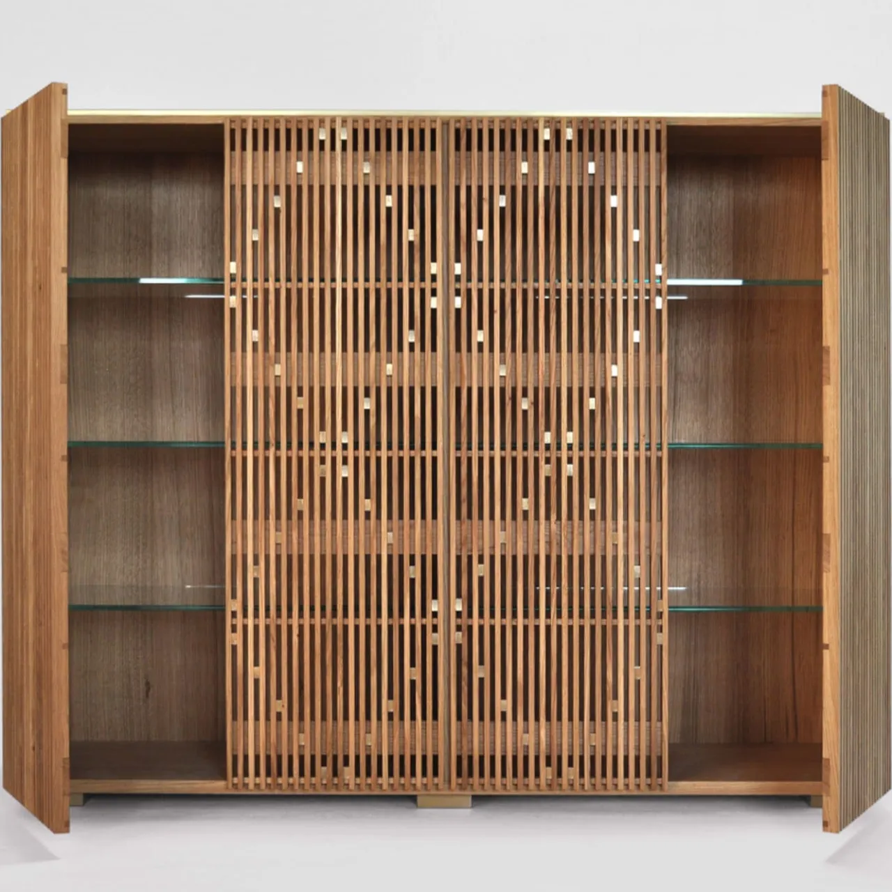 Mobile Milione in noce canaletto con piano in ottone. Lavorazioni: struttura esterna in listellare impiallacciato in noce canaletto – ante in massello di noce con inserti in ottone a formare la caratteristica principale di Milione, le figure romboidali. All’interno 2 ripiani a tutta larghezza in vetro temperato extrachiaro da 2 cm. Per ulteriori opzioni, rivolgersi al Concierge.