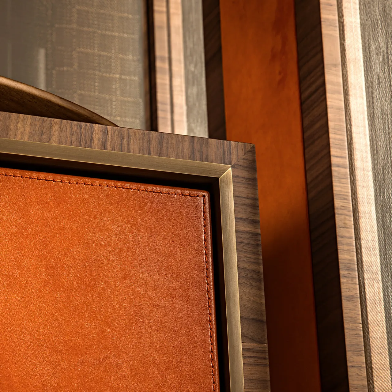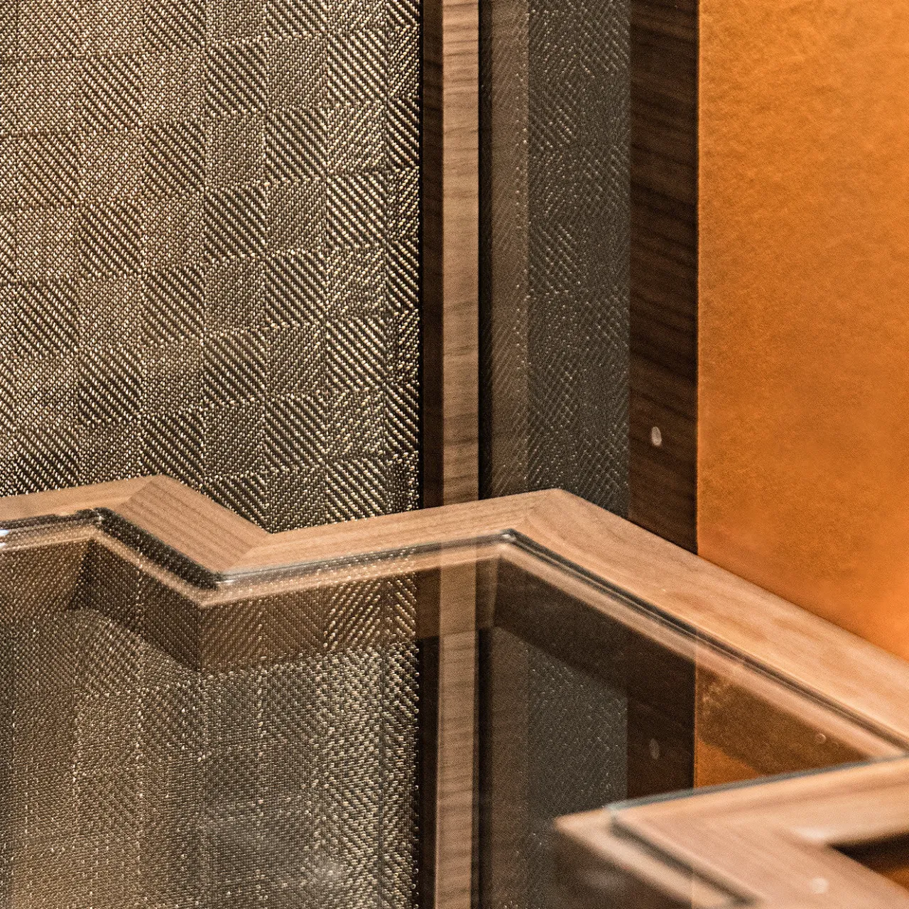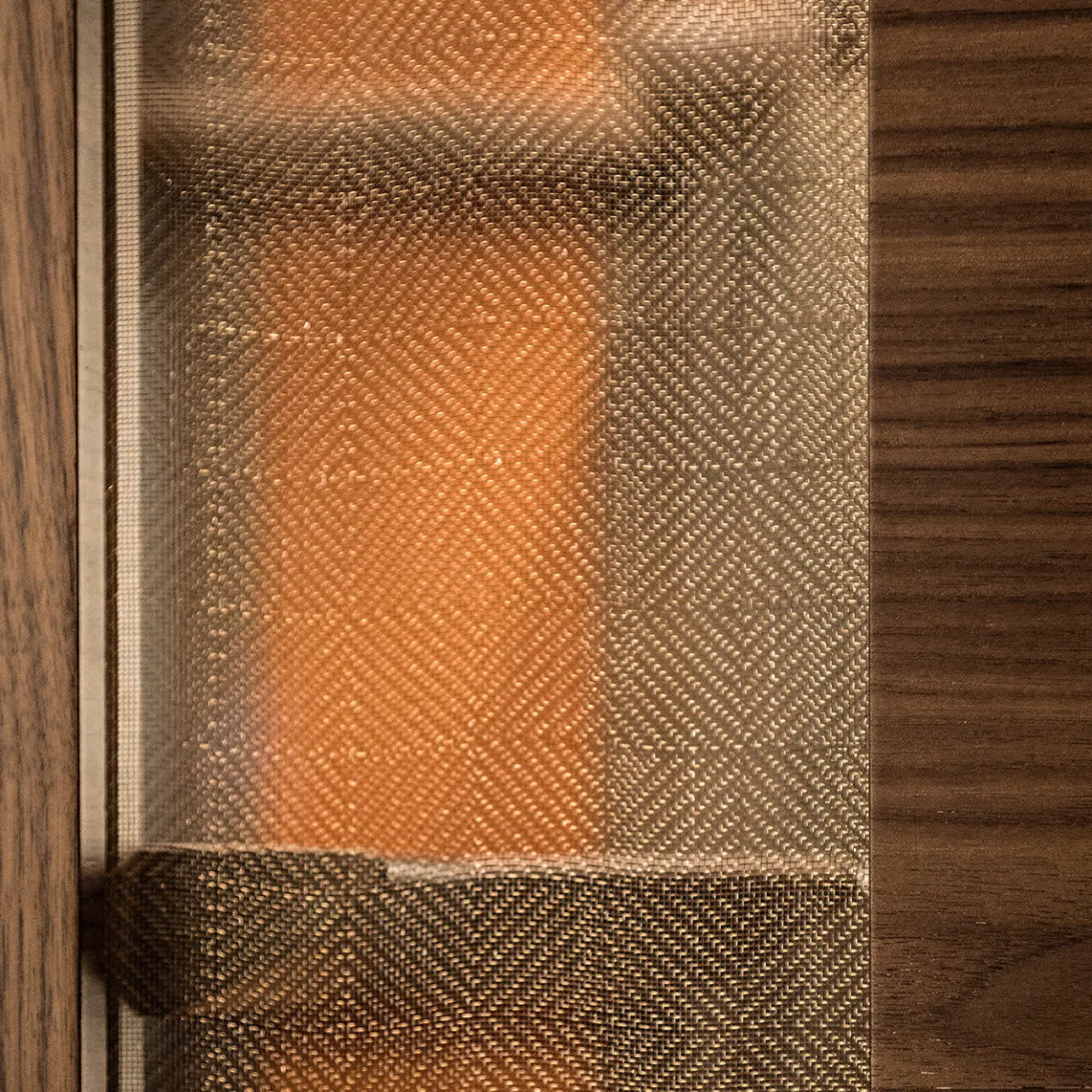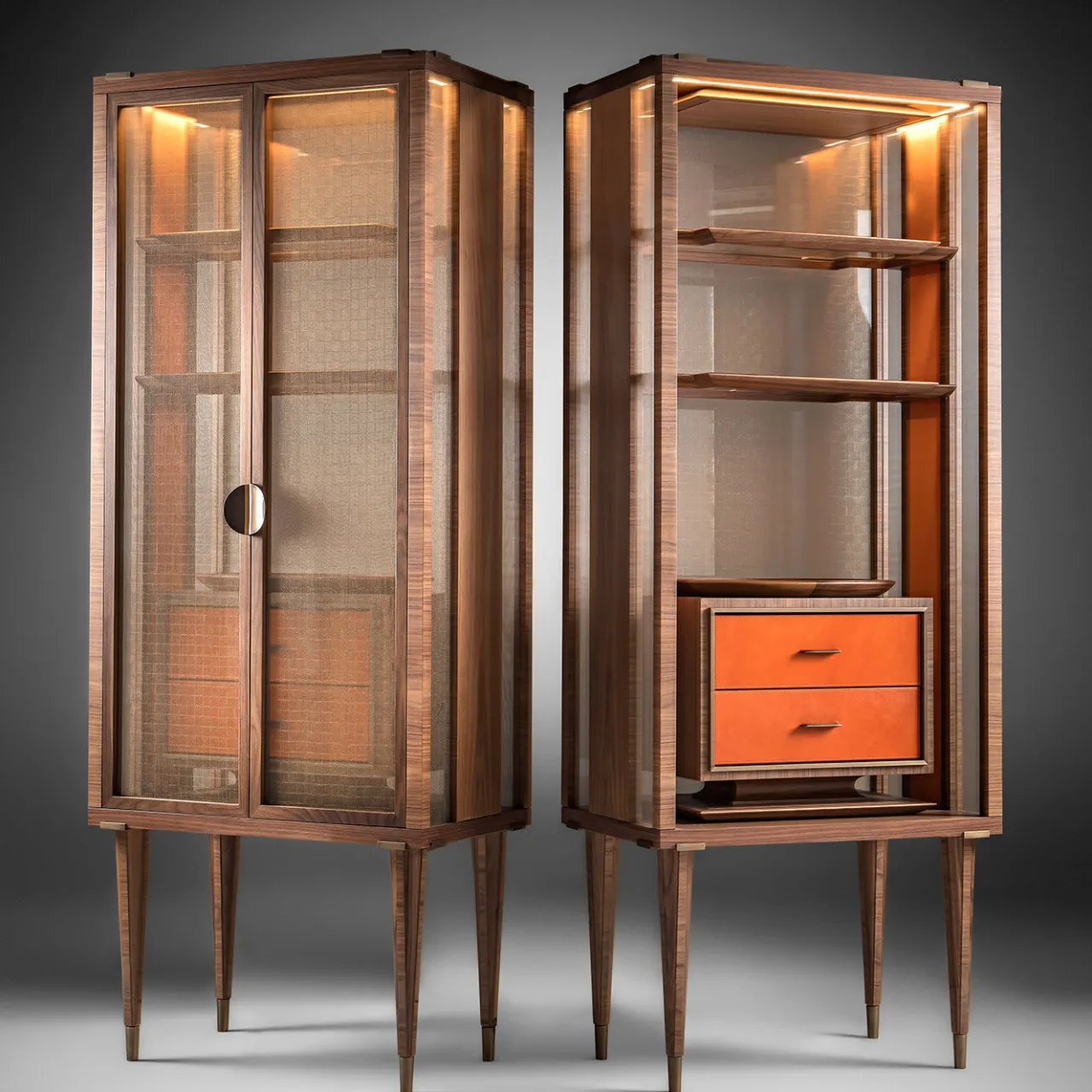 Disponibile anche nella versione con mobile a giorno, questo raffinato mobile si inserisce in modo superbo in qualsiasi interno moderno grazie al suo design all’avanguardia. La solida struttura in noce canaletto con dettagli in bronzo poggia su quattro gambe affusolate ed è caratterizzata da ante e sezioni laterali in vetro stratificato con una rete metallica in finitura bronzo. Il vano interno è dotato di due pratici cassetti in pelle.
