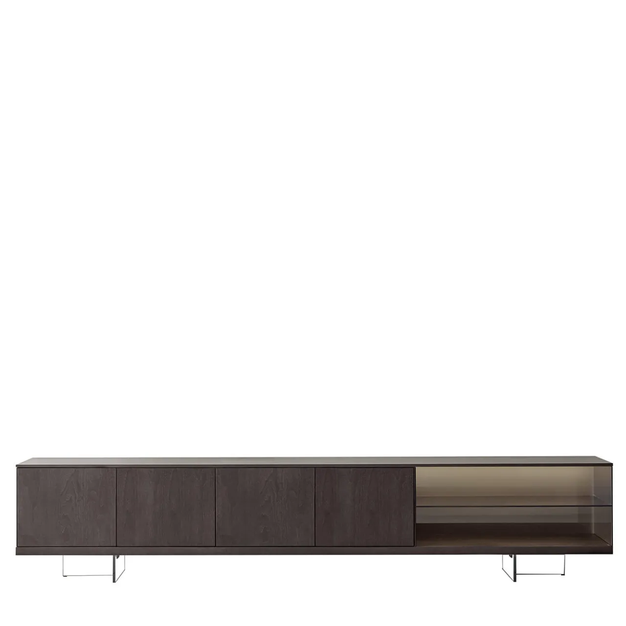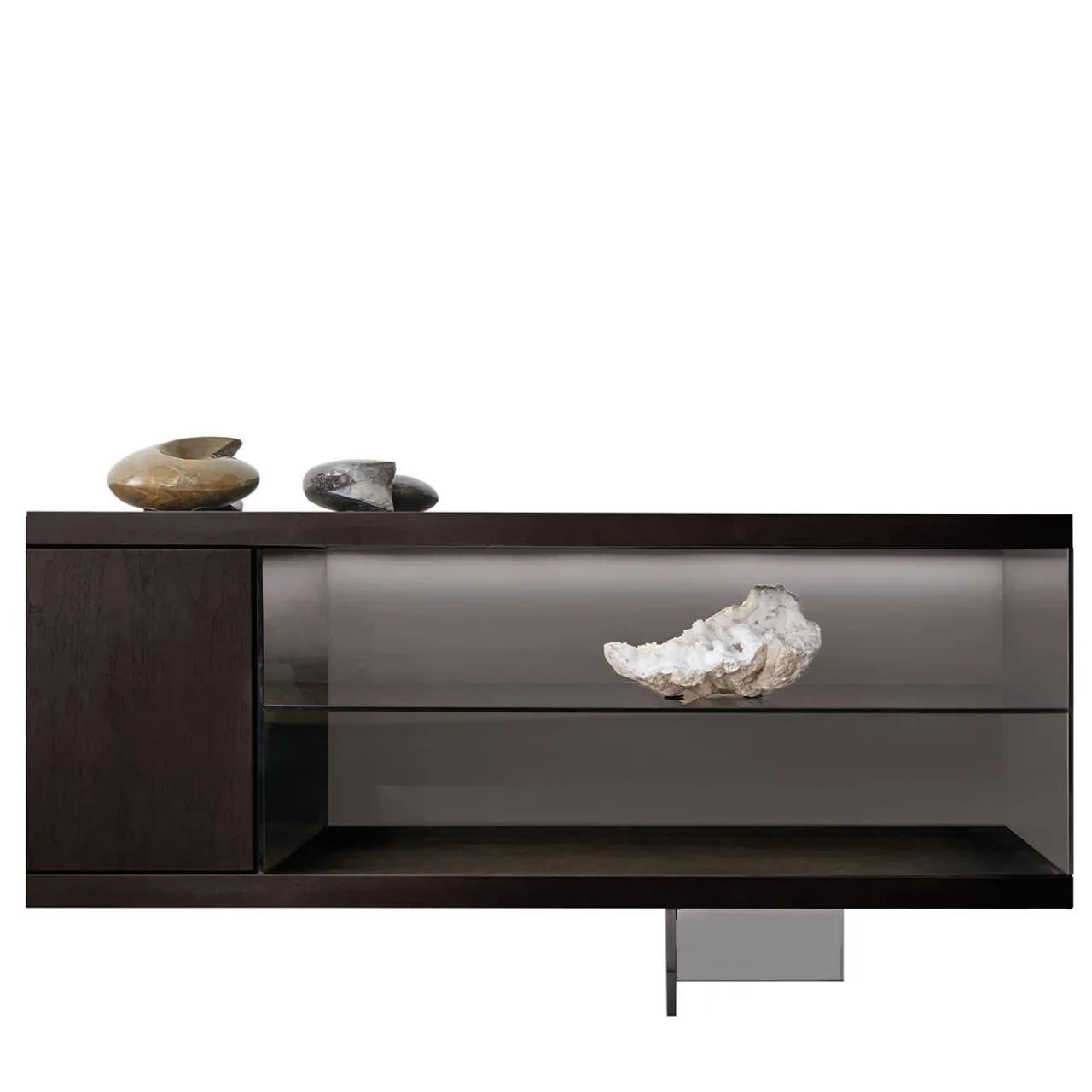 Definita dal suo profilo elegante, questa base TV combina funzionalità e materiali sofisticati. Realizzata in noce nero cioccolato con finitura ad acqua, vanta quattro scomparti e una vetrina in vetro fumé. Una discreta luce LED incorporata valorizza l’interno dell’espositore, creando un ambiente raffinato ideale per esporre oggetti decorativi. Il design elevato è completato da piedini in vetro minimalisti, in equilibrio tra modernità e fascino senza tempo.