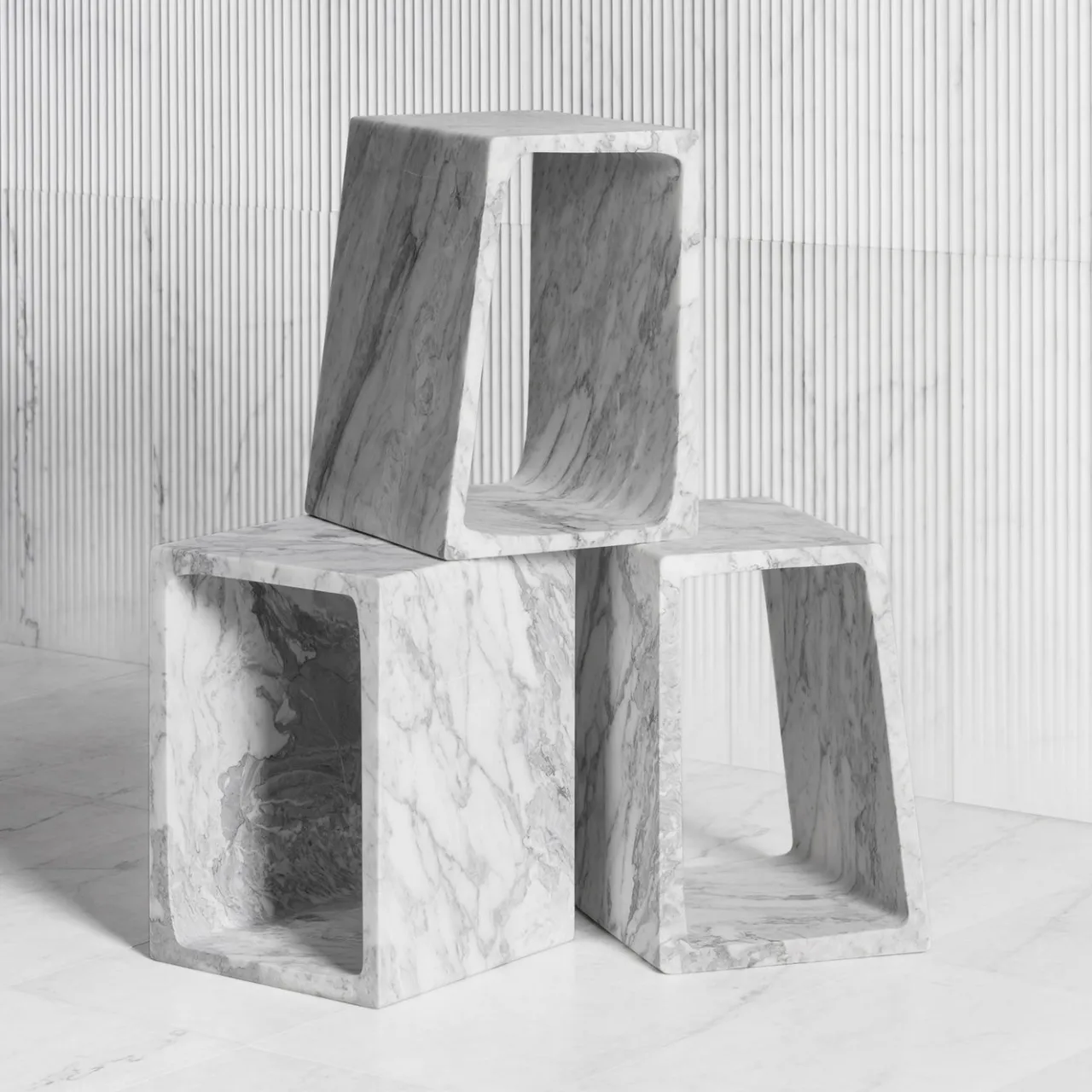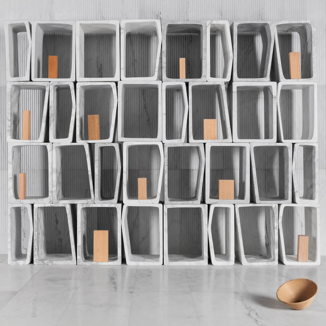 Il modulo Marmeria è un elemento versatile progettato per essere combinato in molteplici configurazioni, consentendo un’adattamento flessibile a vari spazi e ambienti in evoluzione. Ispirato all’arte della muratura, ogni componente geometrico è attentamente impilato per raggiungere una stabilità ottimale. Sebbene sia principalmente un sistema di scaffalature, i singoli moduli possono servire a funzioni diverse come sgabelli o tavolini da notte. La sua struttura cava trasmette un senso di leggerezza, creando volumi eleganti ideali per esporre libri e oggetti da collezione.