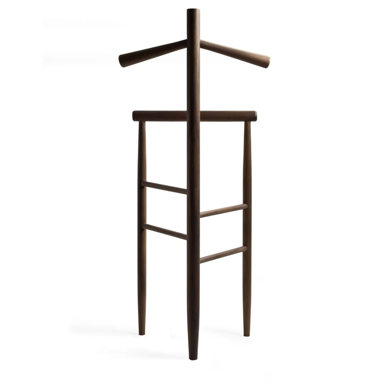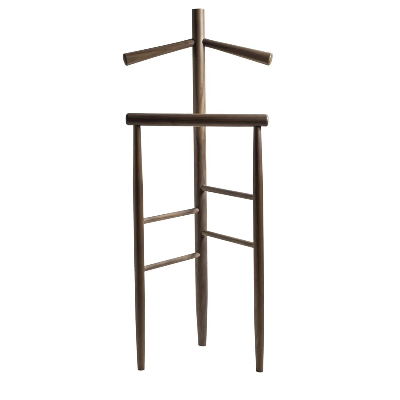 Questo elegante portavalori è un’aggiunta perfetta alle moderne cabine armadio o alle camere da letto, grazie al suo design arioso che consente di riporre in modo pratico gli abiti e gli accessori da tenere a portata di mano al mattino. Realizzato in noce massiccio, la sua silhouette è composta da volumi sottili, una barra centrale per pantaloni antipiega, una gruccia per cappotti o maglioni e barre più basse e piccole per cravatte e cinture.