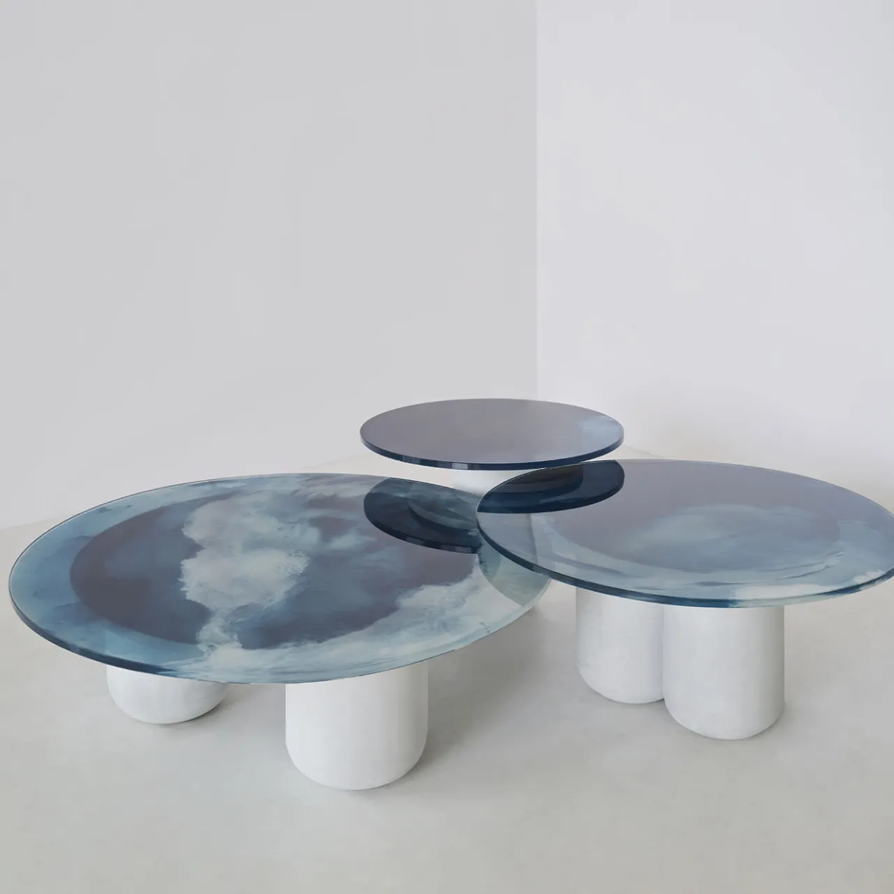 Parte della collezione Trompe-l’oeil, questo tavolino rotondo seduce con il suo trionfo di contrasti e sfumature. Le tre audaci gambe in grautek – una malta a base di calcestruzzo – sostengono il piano circolare in vetro, che sfoggia un disegno blu sfumato mozzafiato, arricchito da texture uniche applicate minuziosamente a mano. Per richieste di personalizzazione, rivolgersi al Concierge.