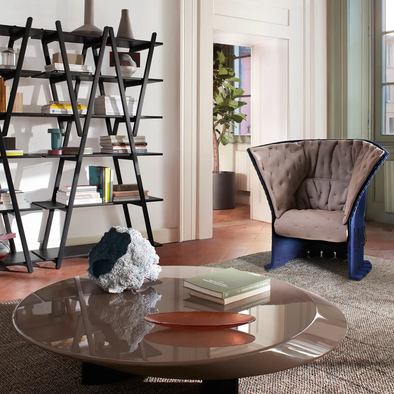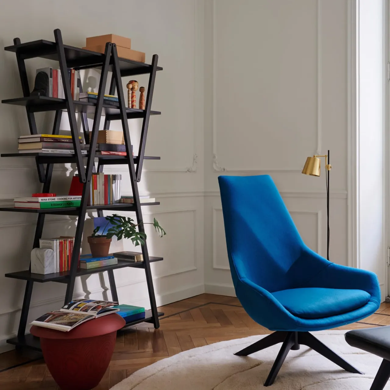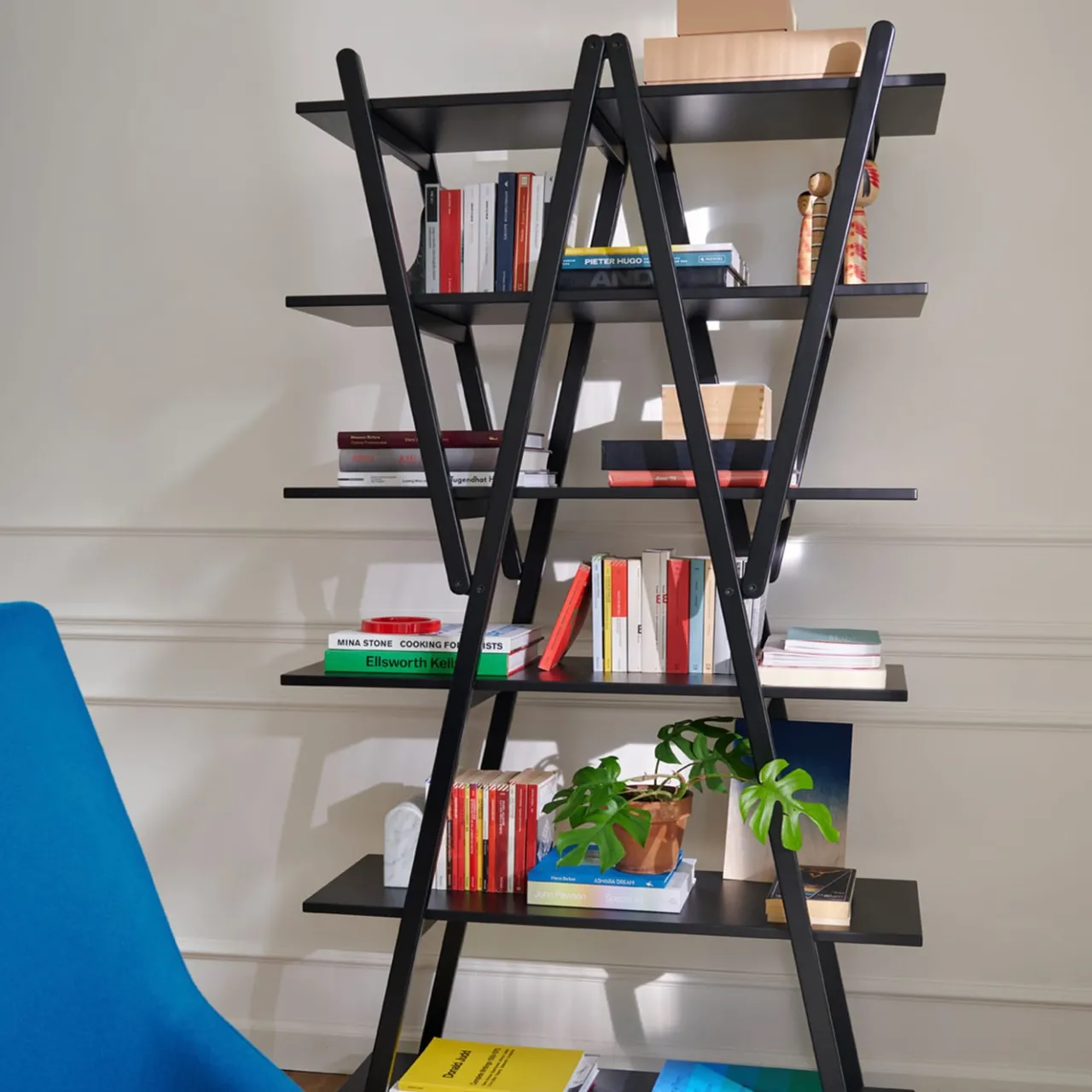 Nuvola Rossa – Libreria. Disegnata da Vico Magistretti, questa libreria dalle linee semplici e pulite nasce da un’analisi dettagliata del modello classico con supporti laterali e ripiani. Si tratta di un’icona del design, ma anche di una vera e propria invenzione costruttiva: i puntoni diagonali diventano la struttura portante e ospitano i ripiani, eliminando la necessità di supporti laterali. Ponendo l’accento sulle cerniere e sui sei ripiani, la struttura, ripiegabile, può essere utilizzata anche come divisorio. La sua estetica elegante e primaria, senza tempo e di facile lettura, ha reso Nuvola Rossa un’icona indiscussa del design fin dal 1977. È stata più volte imitata come esempio di funzione semplificata ottenuta attraverso un gioco di forme.
