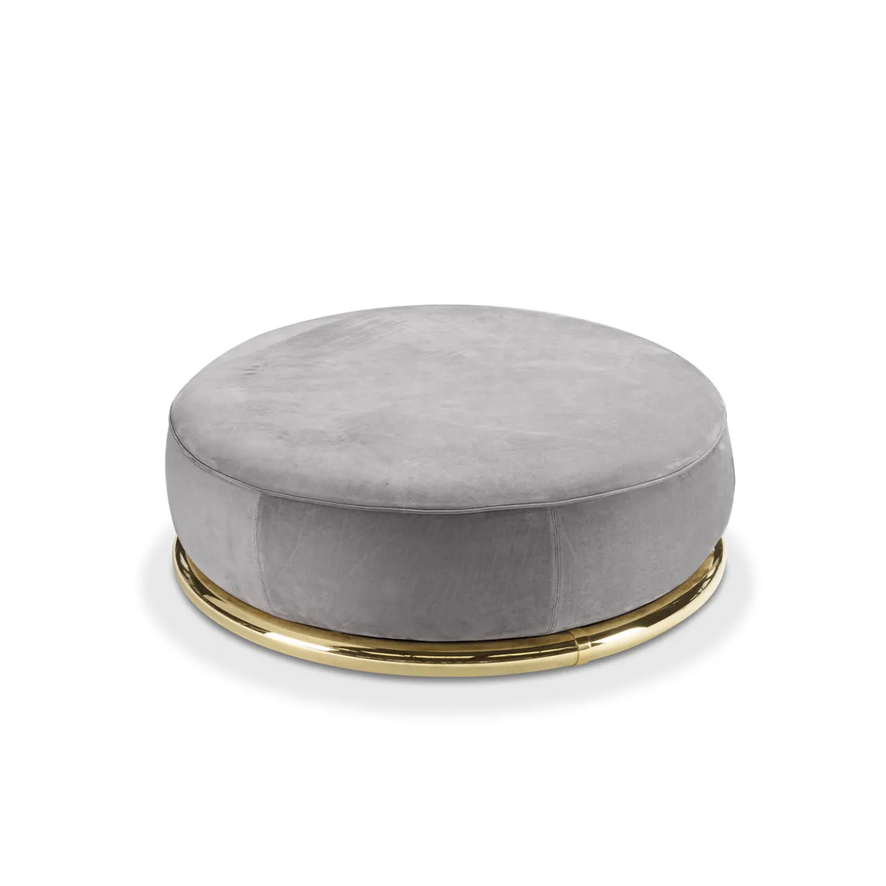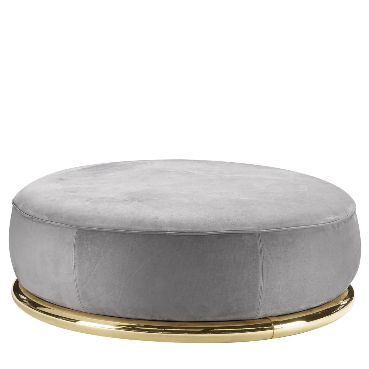 Interpretazione moderna delle forme iconiche e slanciate di un pouf classico, questo magnifico pezzo sfoggia una silhouette rotonda interamente rivestita in pregiata pelle grigia. Perfettamente abbinato al divano grigio della serie Abbracci, creerà un angolo di relax accogliente e confortevole in qualsiasi casa moderna o tradizionale. Il pezzo poggia su una robusta base in ottone lucidato in oro. Per il mercato statunitense, contattare il Concierge per i tessuti certificati CAL TB 117.