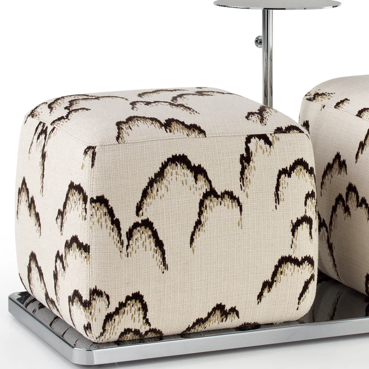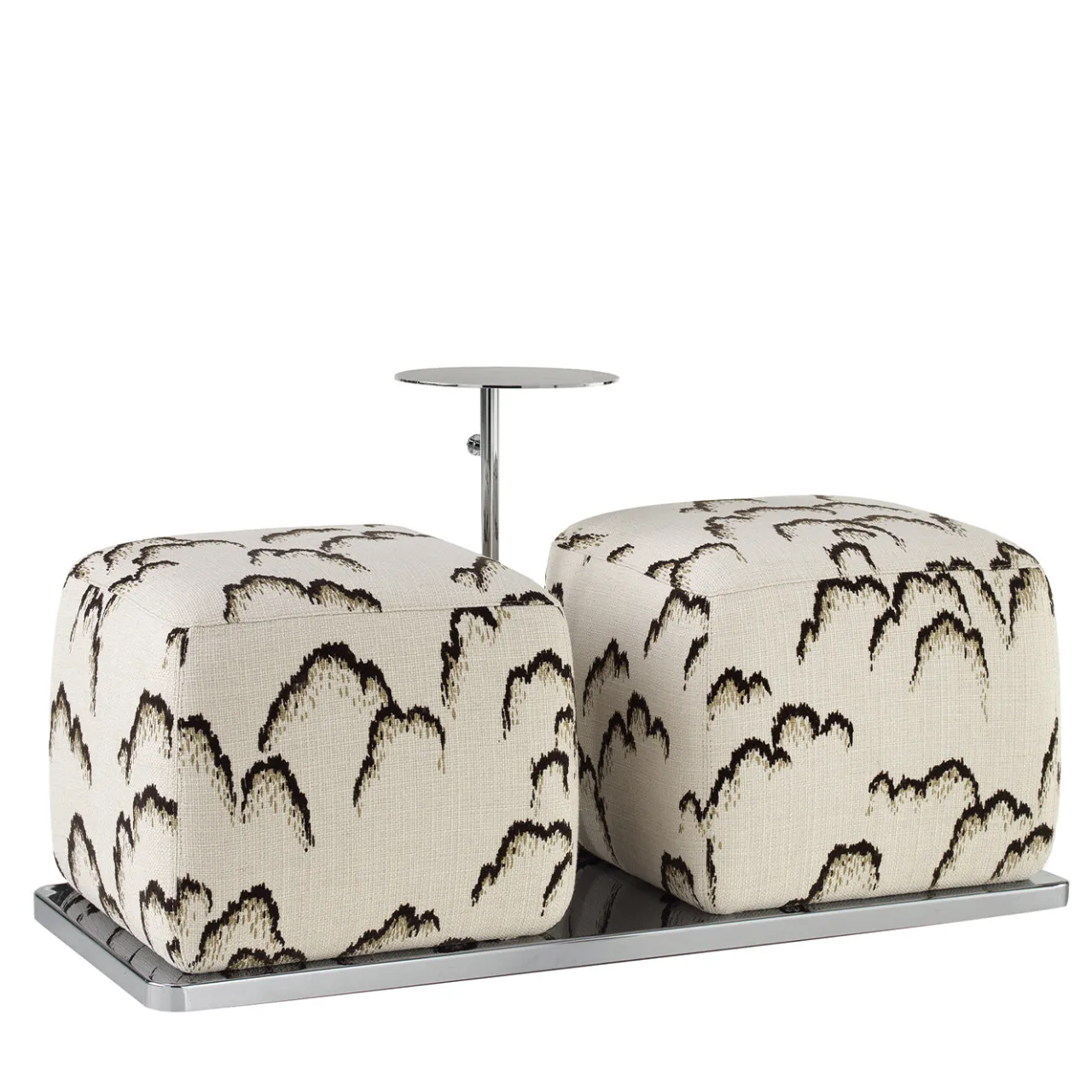 Questo ottomano doppio imbottito presenta un tavolino compatto e un pratico gancio per borse, incorniciato da acciaio cromato lucido. I pouf sono rivestiti in tessuto Dedar a motivo, offrendo un mix di funzionalità e stile adatto agli spazi abitativi moderni. Il tavolino integrato fornisce una superficie elegante ideale per bevande o decorazioni, mentre il design promuove un utilizzo versatile come seduta o poggiapiedi.