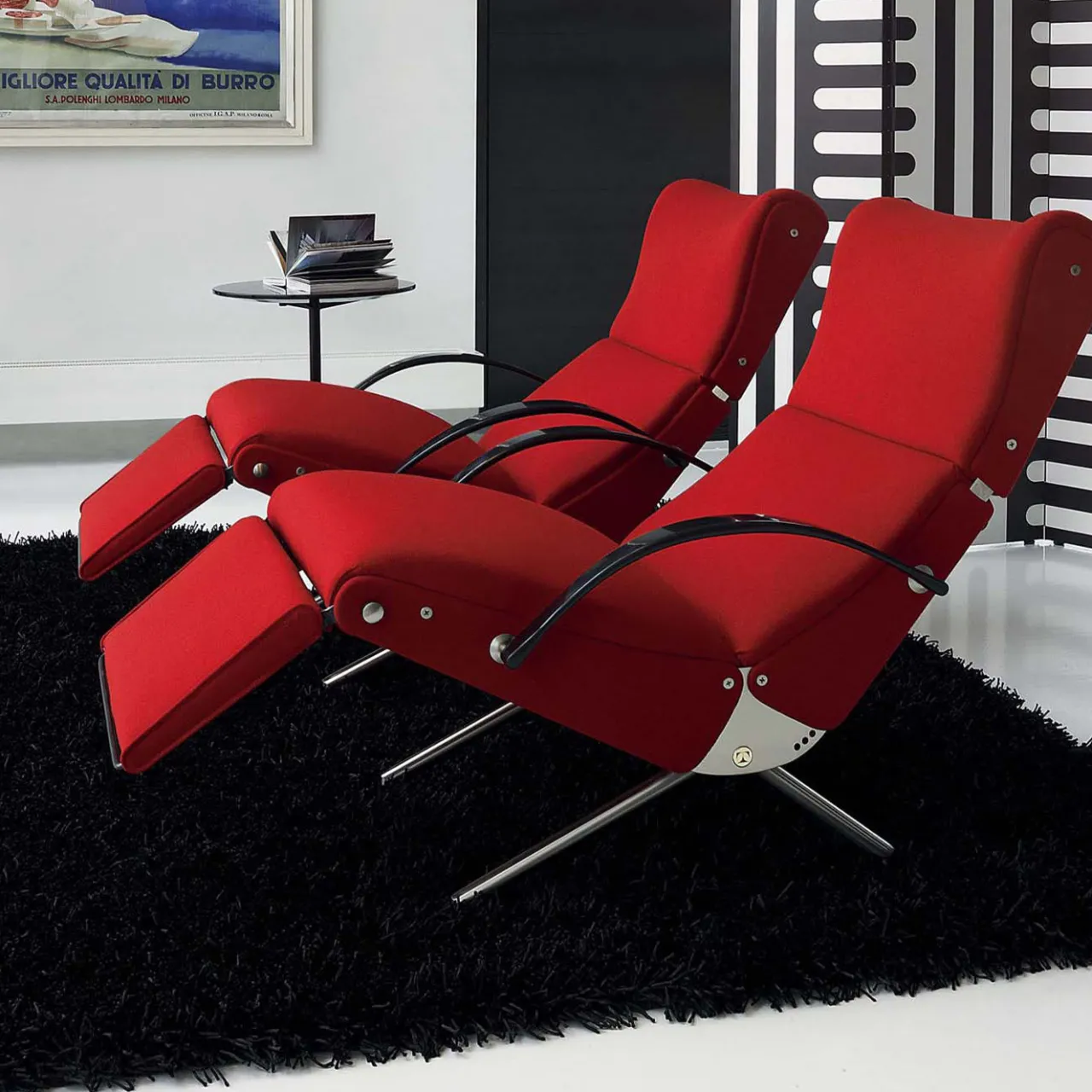 Parte della “ABV Collection”, questa splendida poltrona lounge con schienale regolabile in altezza è un progetto di Osvaldo Borsani del 1955 per sintetizzare in un unico mobile il comfort offerto da una chaise longue e le dimensioni compatte di una poltrona. Costituita da elementi mobili avvolti in tessuto rosso, la sua struttura in metallo satinato e nichelato può passare da una posizione completamente reclinata a una completamente chiusa. I braccioli curvi in acciaio e gomma sono autoregolabili per un maggiore comfort.