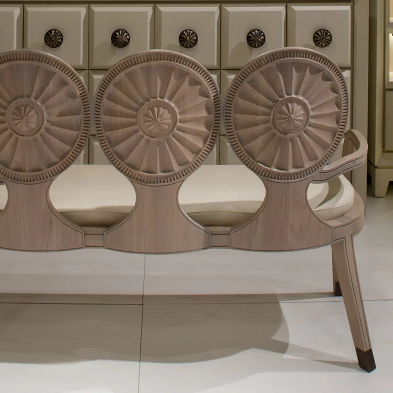 3 Scots Watch è una raffinata panca con struttura in legno in finitura rovere naturale progettata da Archer Humphryes Architects. Lo schienale in legno decorato incorpora tratti tipici dello stile neoclassico, mentre il rivestimento in pelle della seduta conferisce alla panca un aspetto contemporaneo.