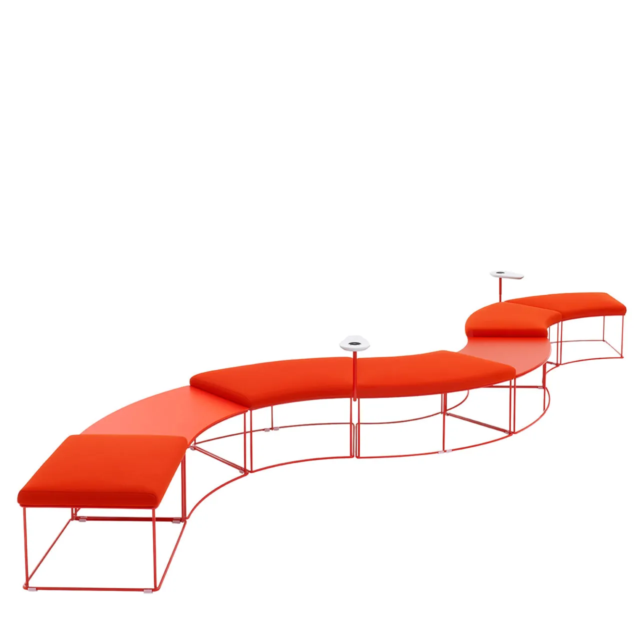 Greg è la sedia d’attesa che si trasforma facilmente in una comoda panca imbottita per interni. Greg è configurabile con componenti modulari curvi senza schienale. Sistema modulare composto da un pouf imbottito, due tavolini curvi con piano Vitter rosso, quattro moduli curvi e due tavolini con caricatore a induzione con presa USB in MDF laccato bianco, struttura in tondino d’acciaio verniciato rosso. Rivestiti in tessuto ignifugo rosso. Chiedere al Concierge per le opzioni di personalizzazione.
