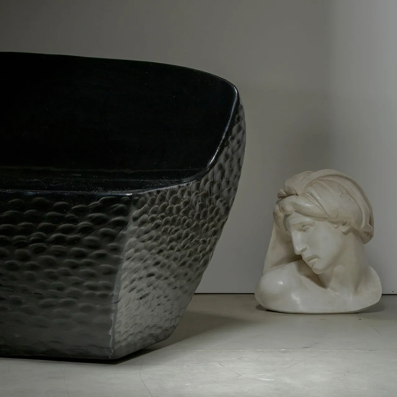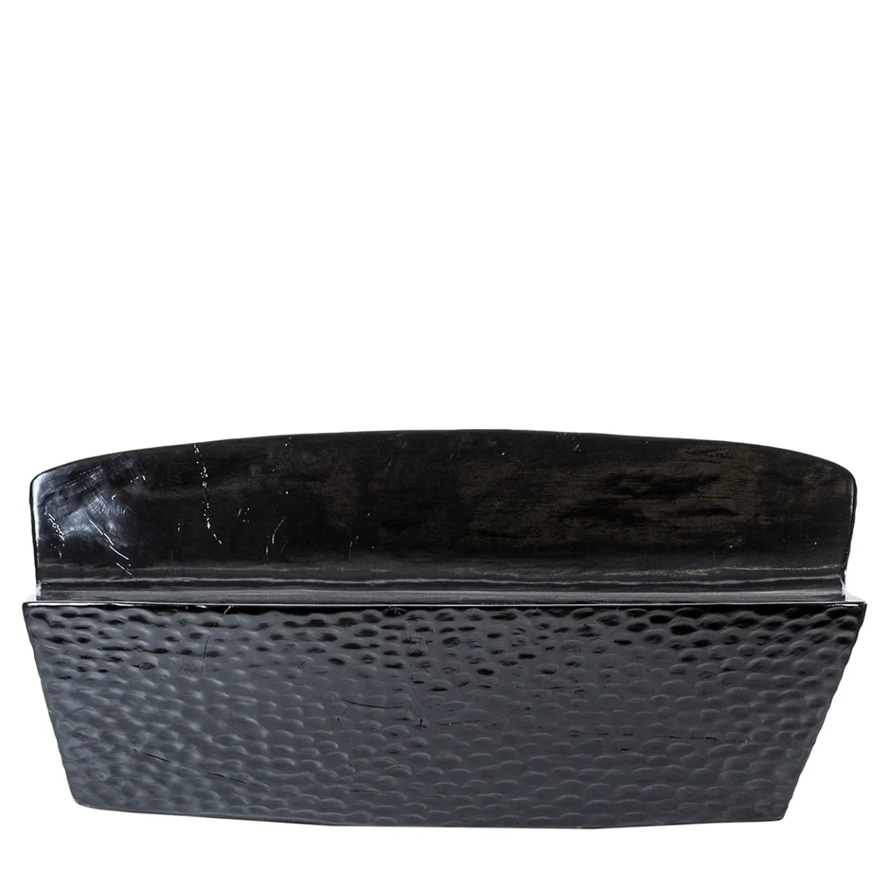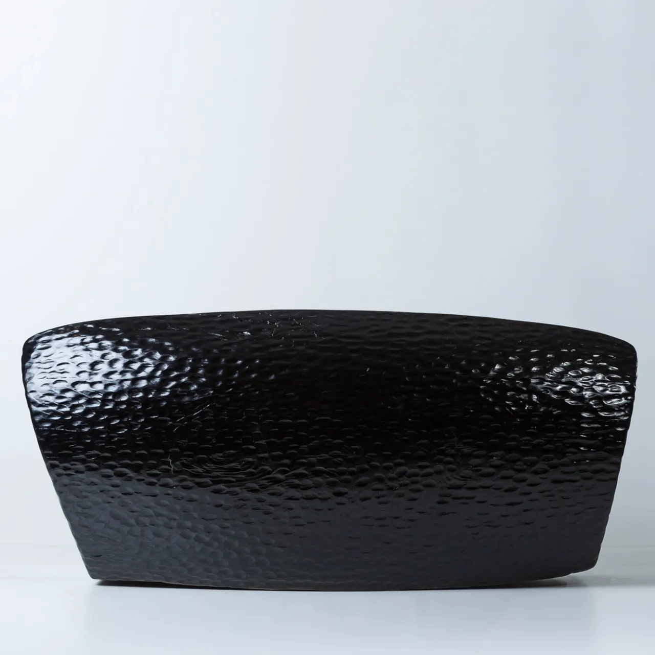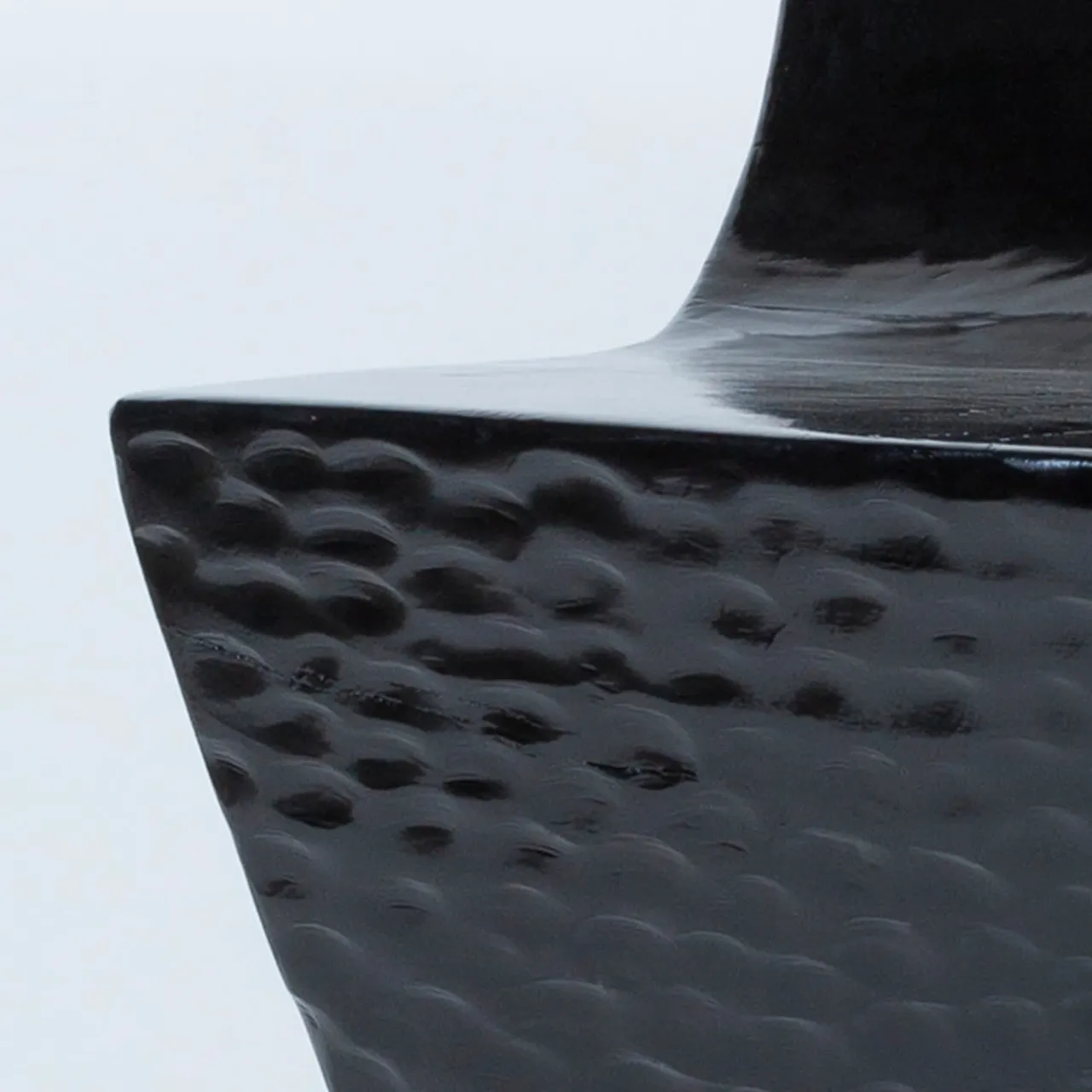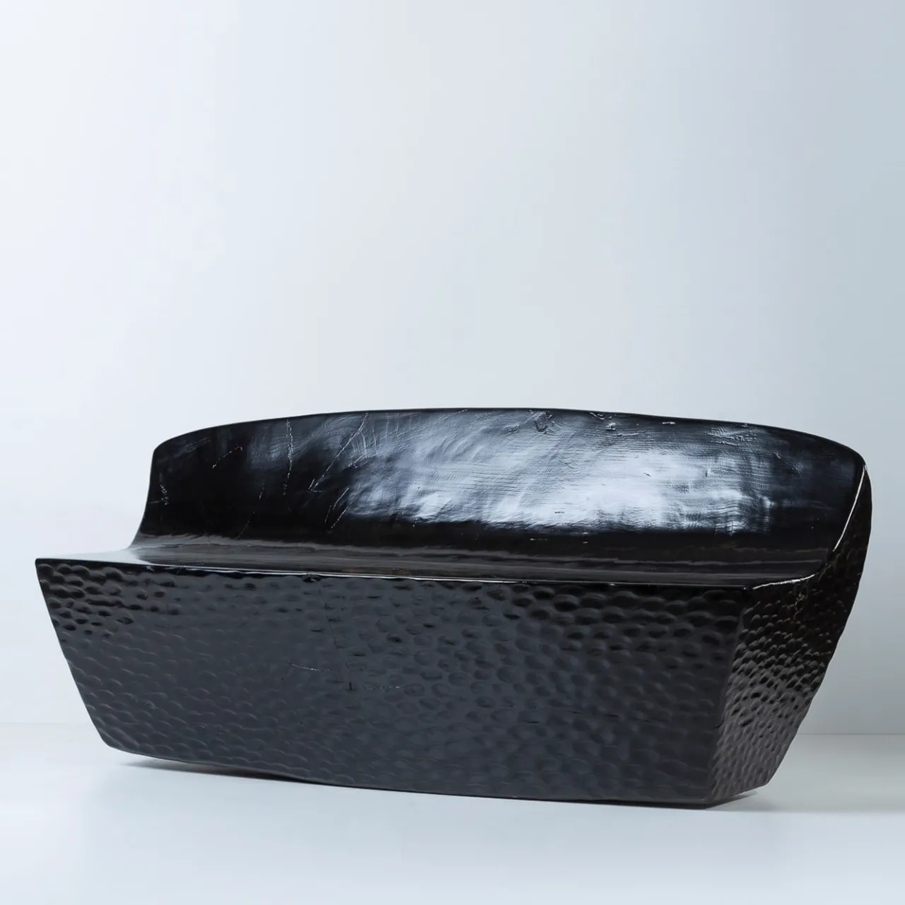Una vetrina di instancabile artigianato, questa panca è stata scolpita da un singolo ceppo di cedro e tinta di nero per una dichiarazione cromatica di classe senza tempo. La sua silhouette dinamica si distingue per la forma fortemente svasata, impreziosita da una texture minuziosamente intagliata a mano lungo la base per aumentare il fascino tattile e visivo. È un pezzo unico che testimonia il fascino innato delle forme organiche.