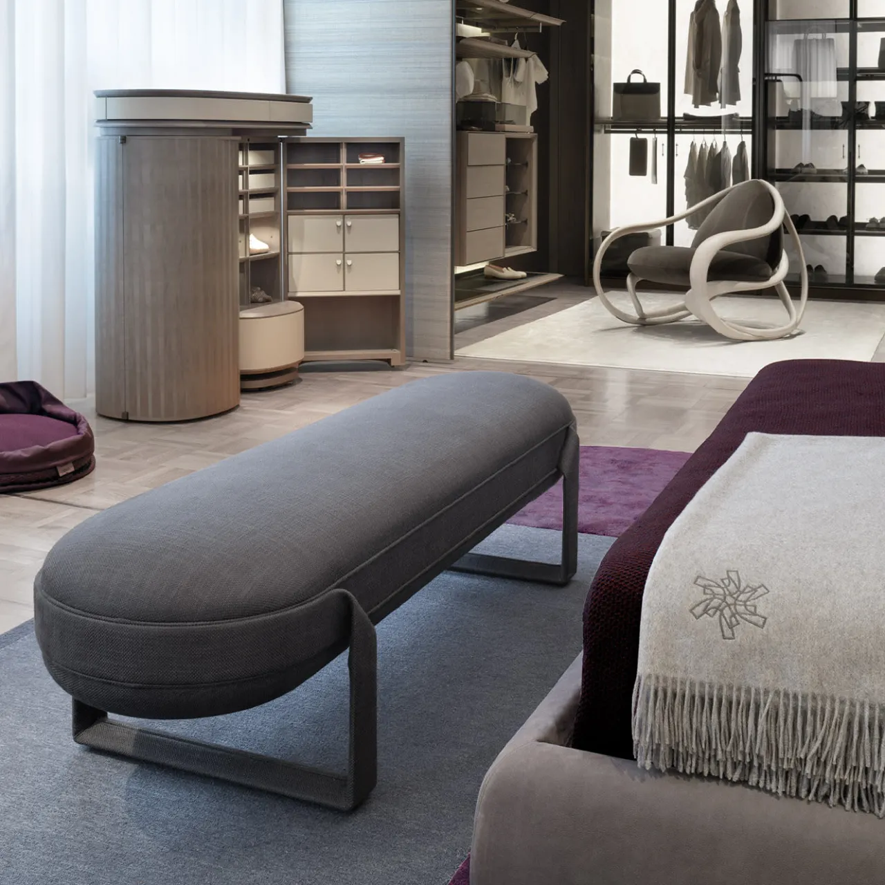 Un design eccezionale che si integra sia con l’arredamento privato che con quello contract, questa squisita panca è un invito a rilassarsi con un buon libro o una bevanda. Realizzata in compensato di pioppo, è imbottita in poliuretano flessibile a densità multipla, rivestita in fibra e rivestita in tessuto grigio (non sfoderabile). Le gambe, in metallo, sono rivestite con dettagli in pelle. I piedi sono in legno di faggio. Per ulteriori dettagli, rivolgersi al Concierge.