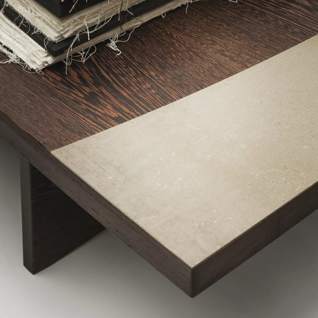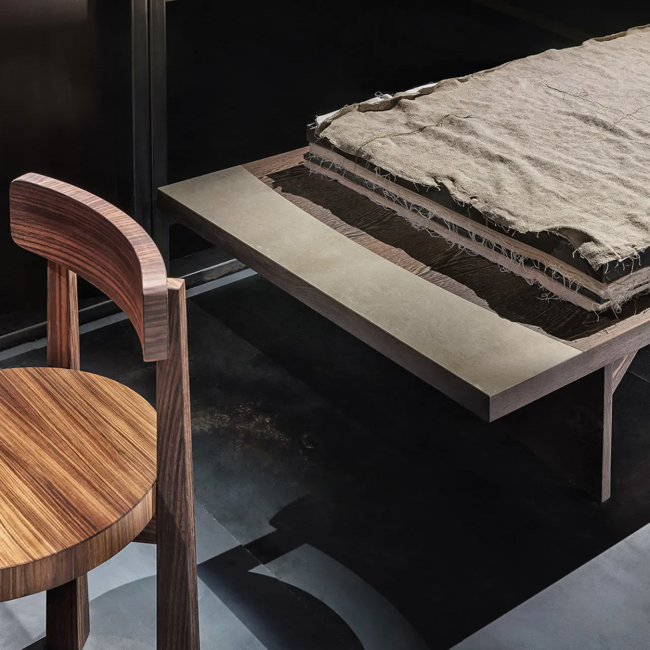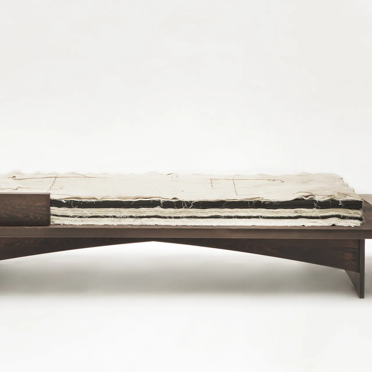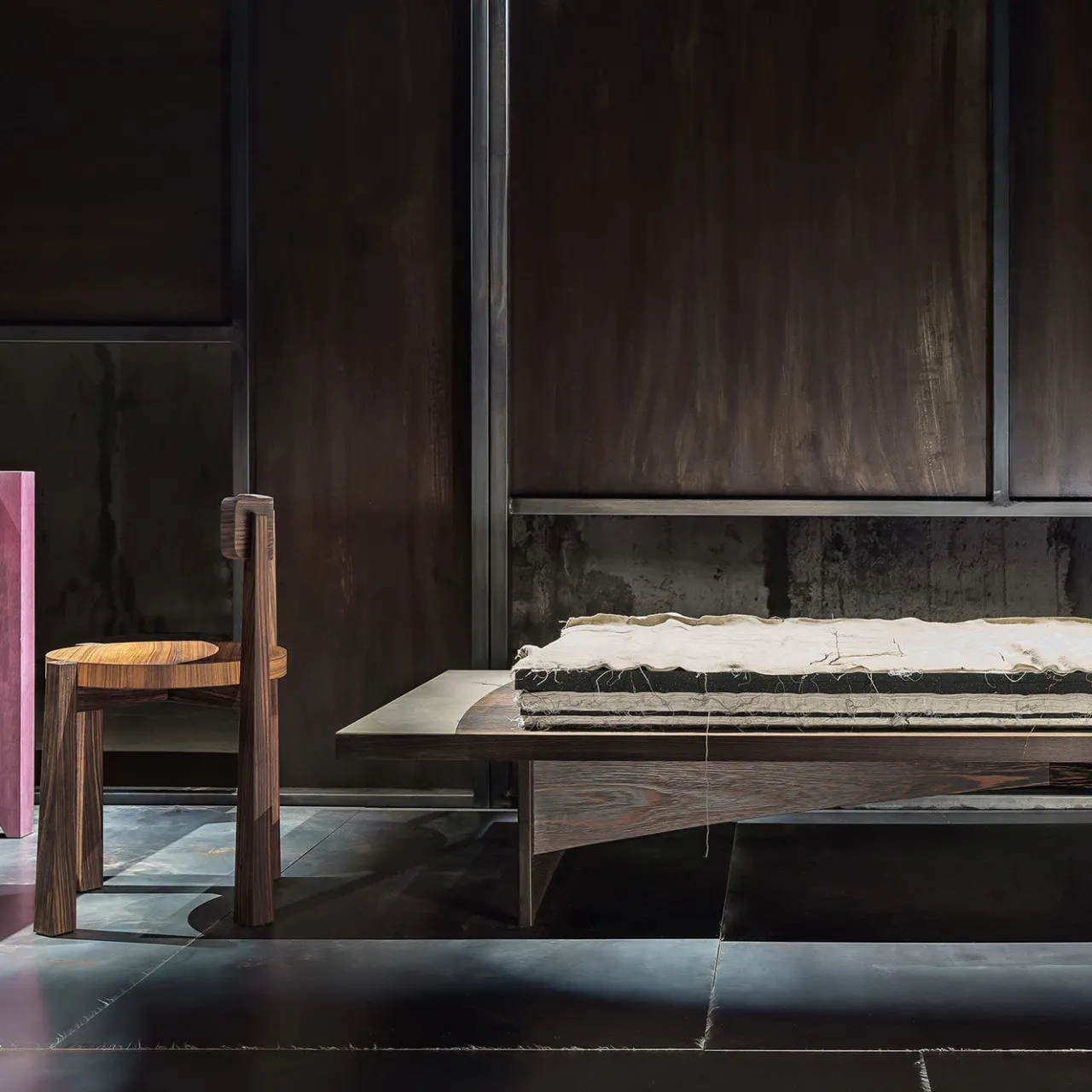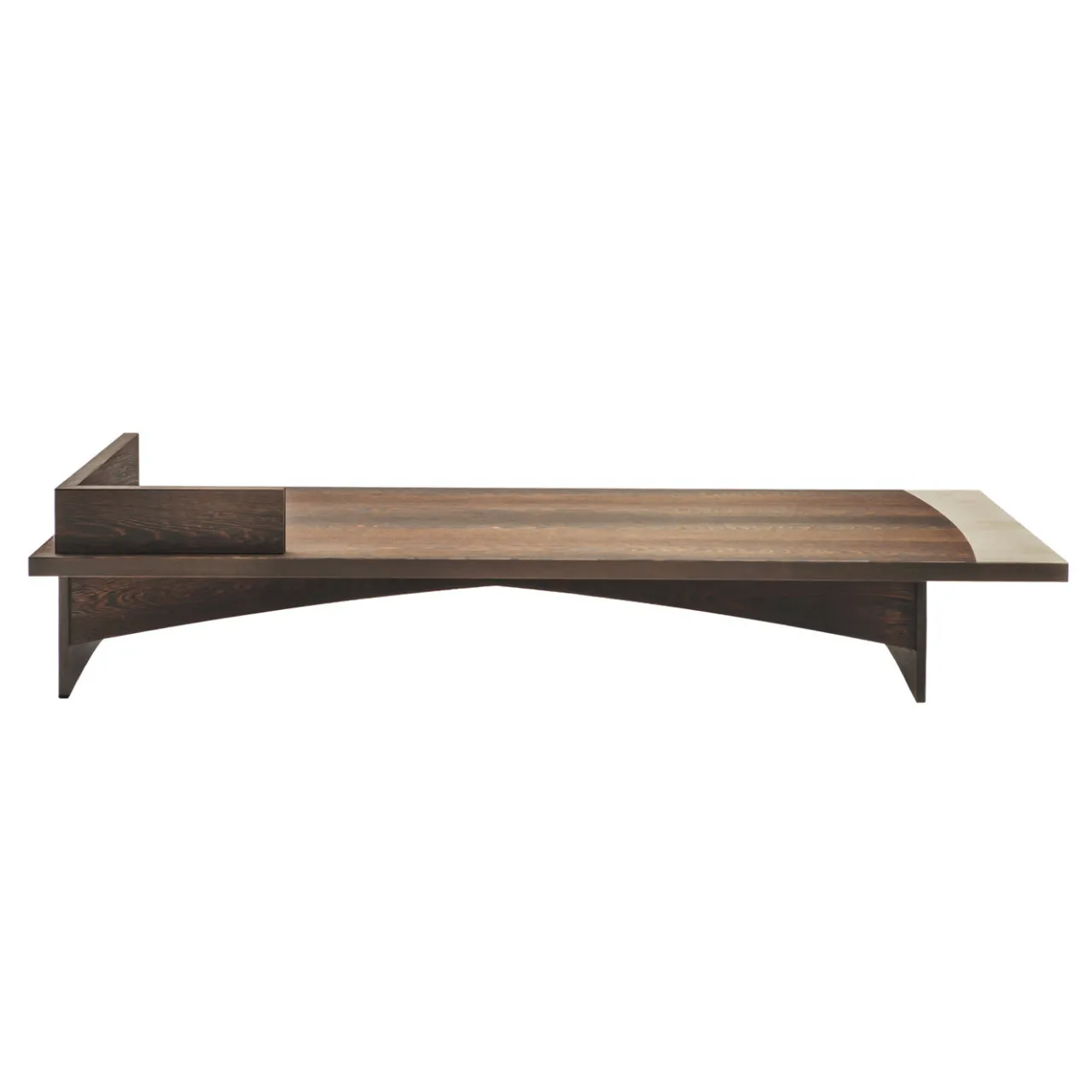 Chiamata così per indicare un letto modesto, questa panca, o dormeuse, fa parte di una collezione unica di pezzi destinati a creare una stanza tradizionale e intima con opere in legno eccezionali. Dalle linee essenziali ed eleganti, questo pezzo è realizzato in legno di wengé e presenta una fascia in cemento su un lato e un inserto a forma di L in rilievo sull’angolo del lato opposto. Doghe, materasso e cuscini non sono inclusi.