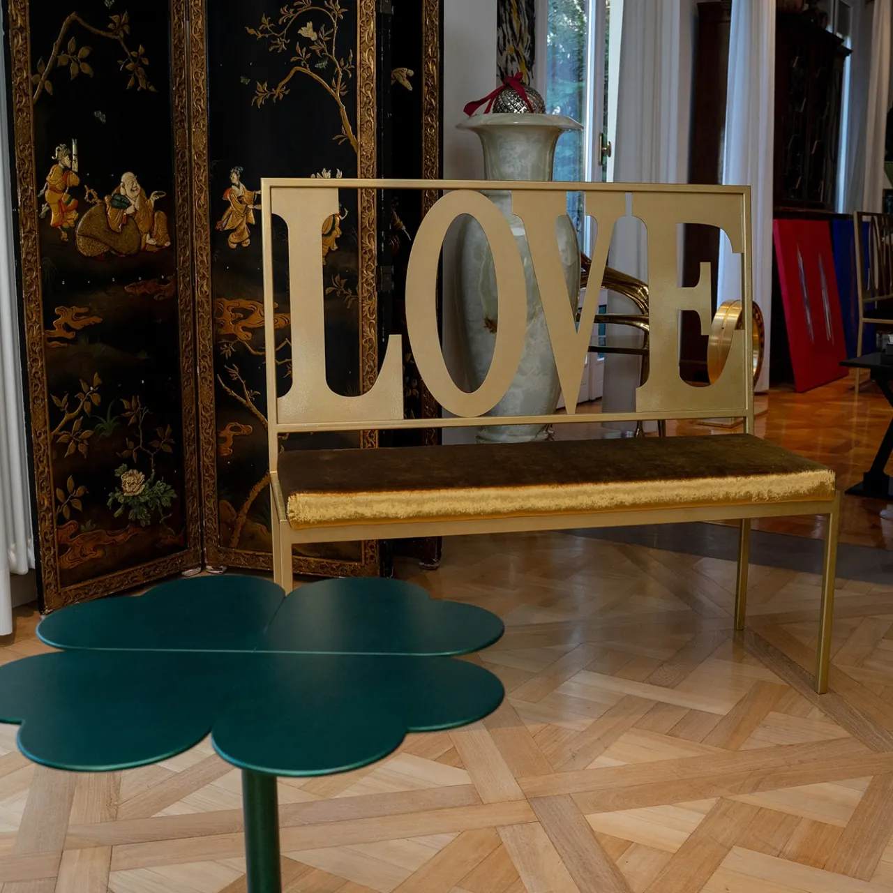 Parte della collezione Imperfect Love, ispirata dal desiderio di offrire oggetti di design dal fascino unico, questa panca in ferro lavorata a mano presenta una calda finitura dorata e un rivestimento della seduta in velluto coordinato. Disponibile anche in nero con rivestimento in velluto nero, blu, bronzo o grigio, la struttura sottile è caratterizzata da uno schienale aperto con quattro grandi lettere in stampatello che compongono la parola “LOVE”. Un pezzo originale per completare un arredamento contemporaneo ed eclettico, questa panca aggiunge un elemento di fascino artistico e può essere abbinata alle sedie a lettere, ai tavolini e alla consolle per un look coeso e giocoso. Ogni pezzo è unico e, a causa della lavorazione a mano, possono verificarsi lievi variazioni.