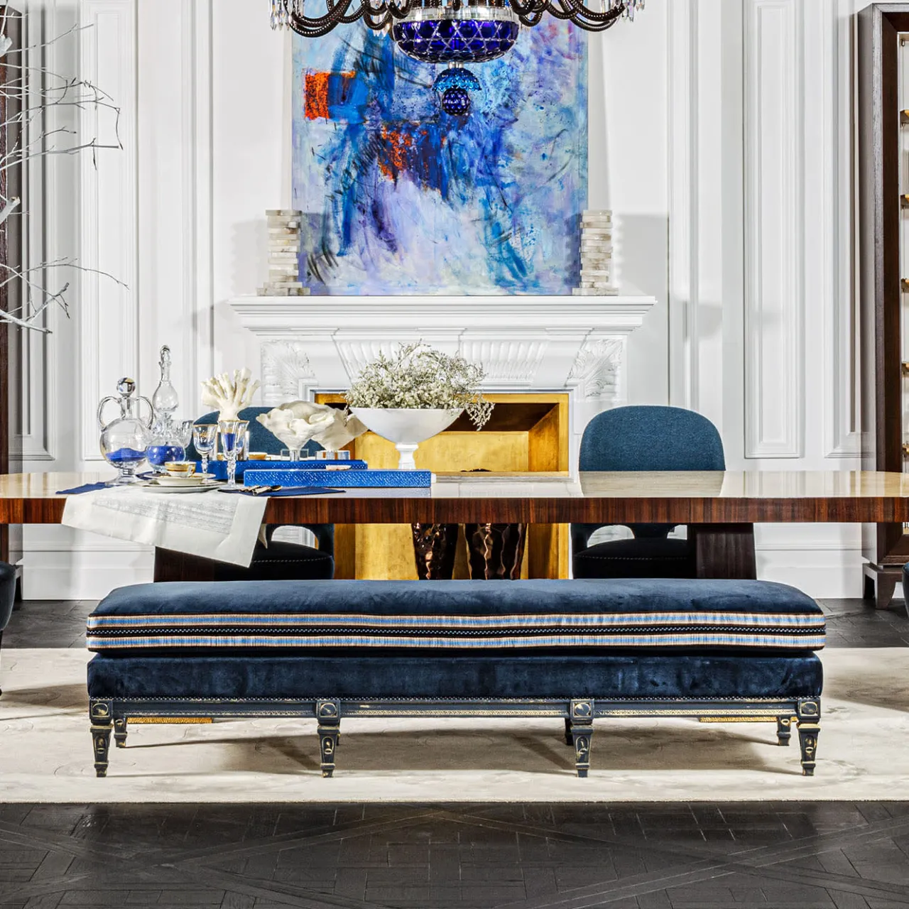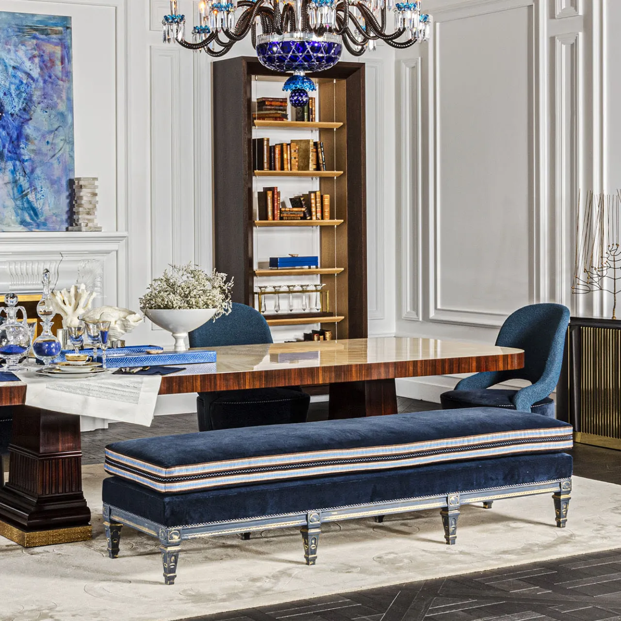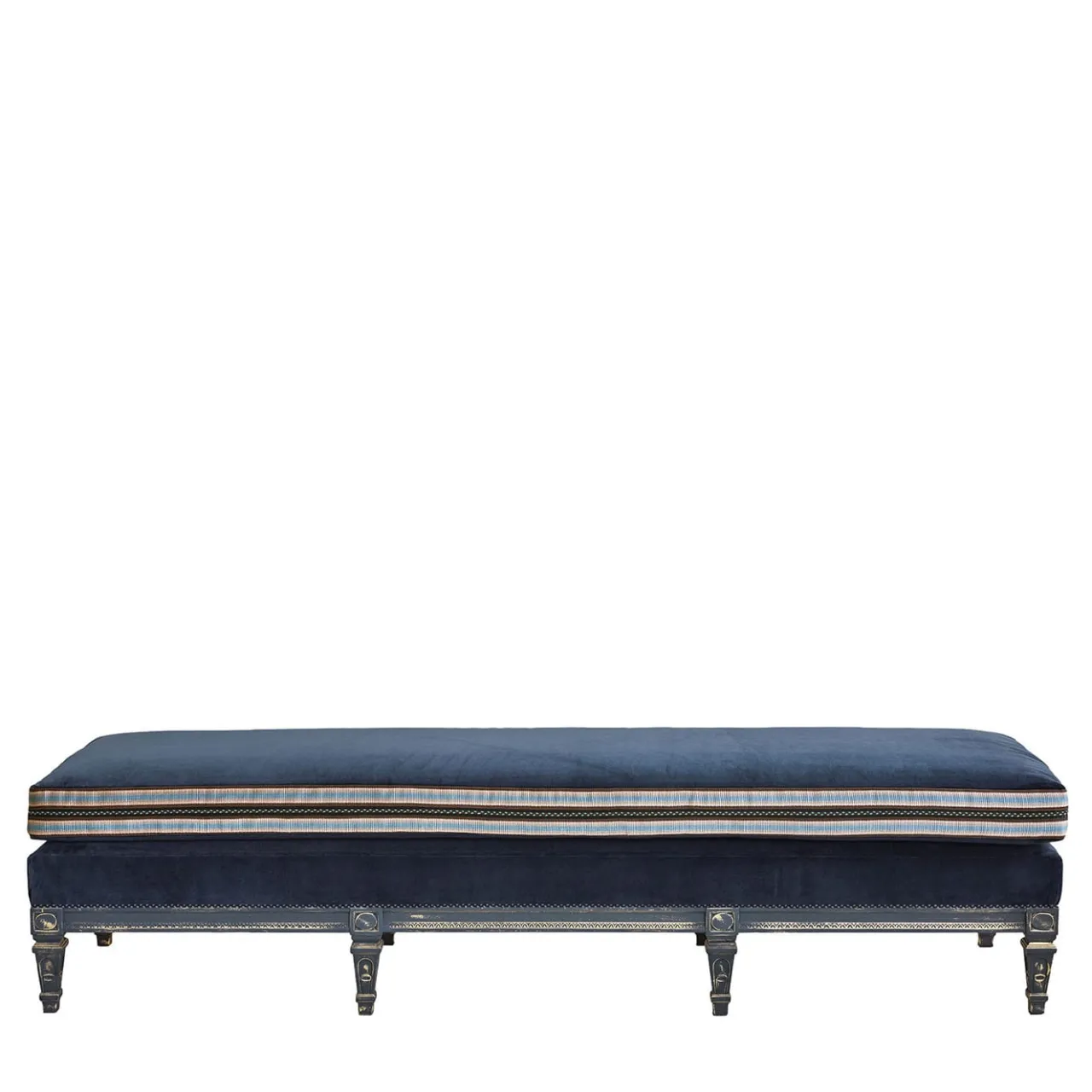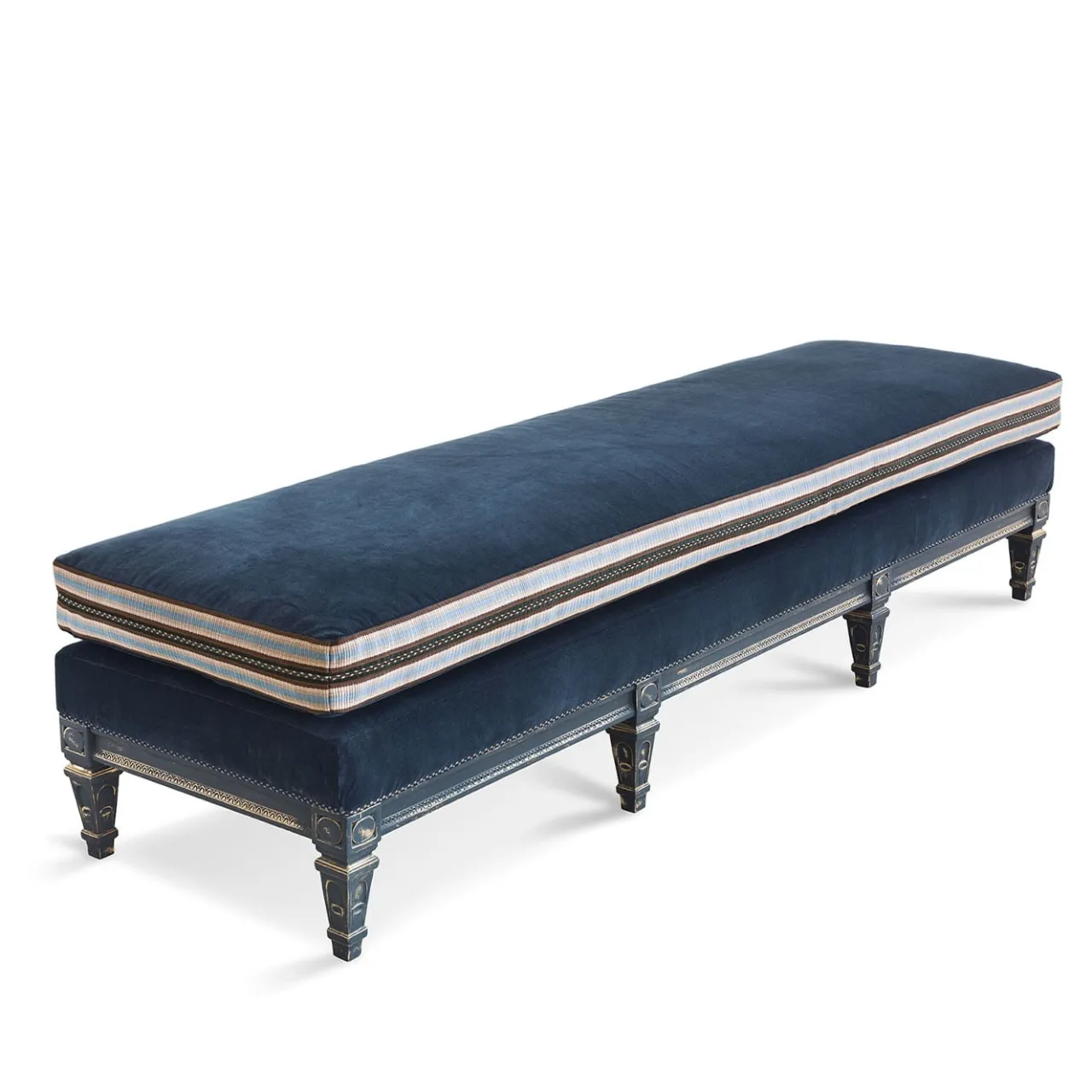 Panca intagliata a mano e rivestita in velluto con finiture decorative sul cuscino della seduta.