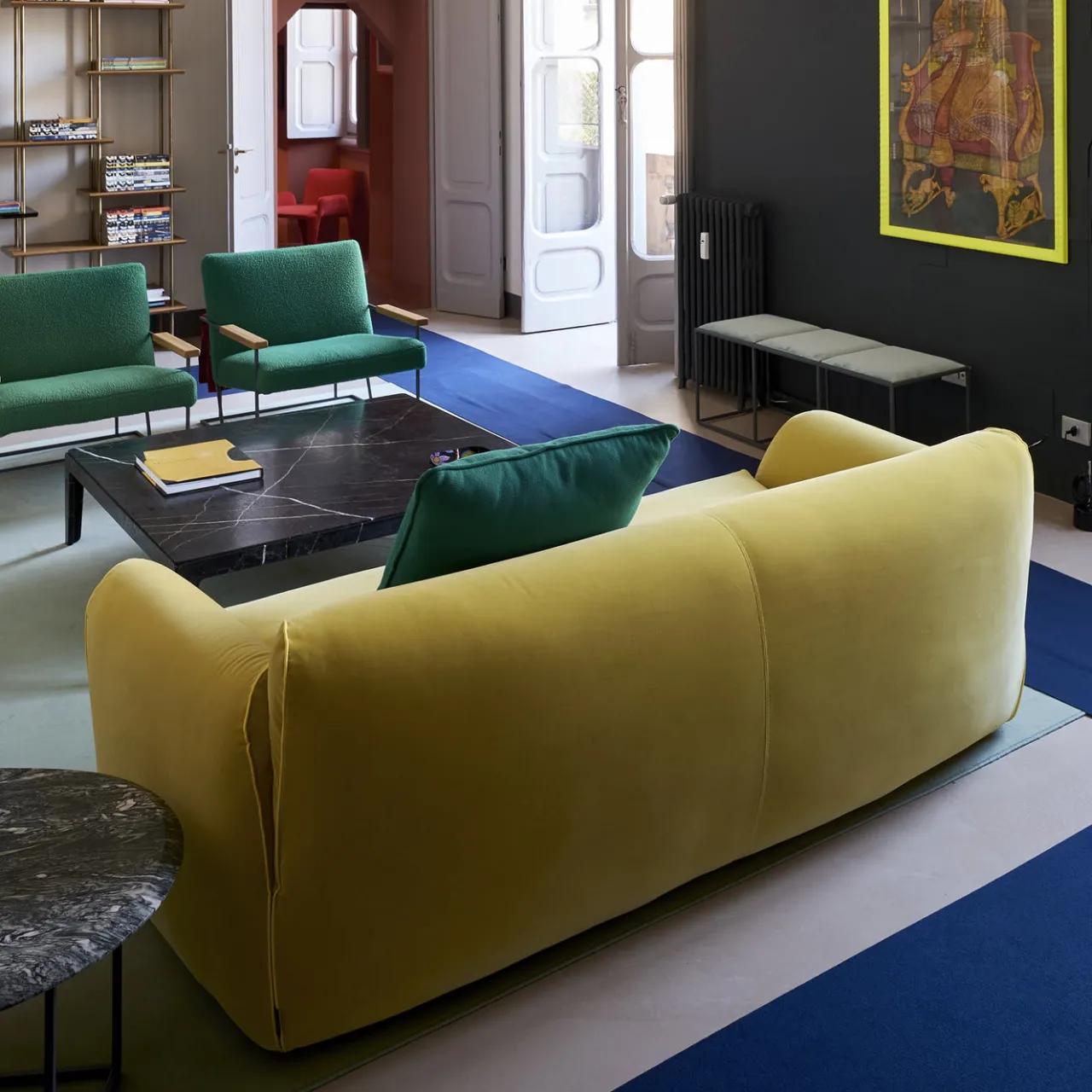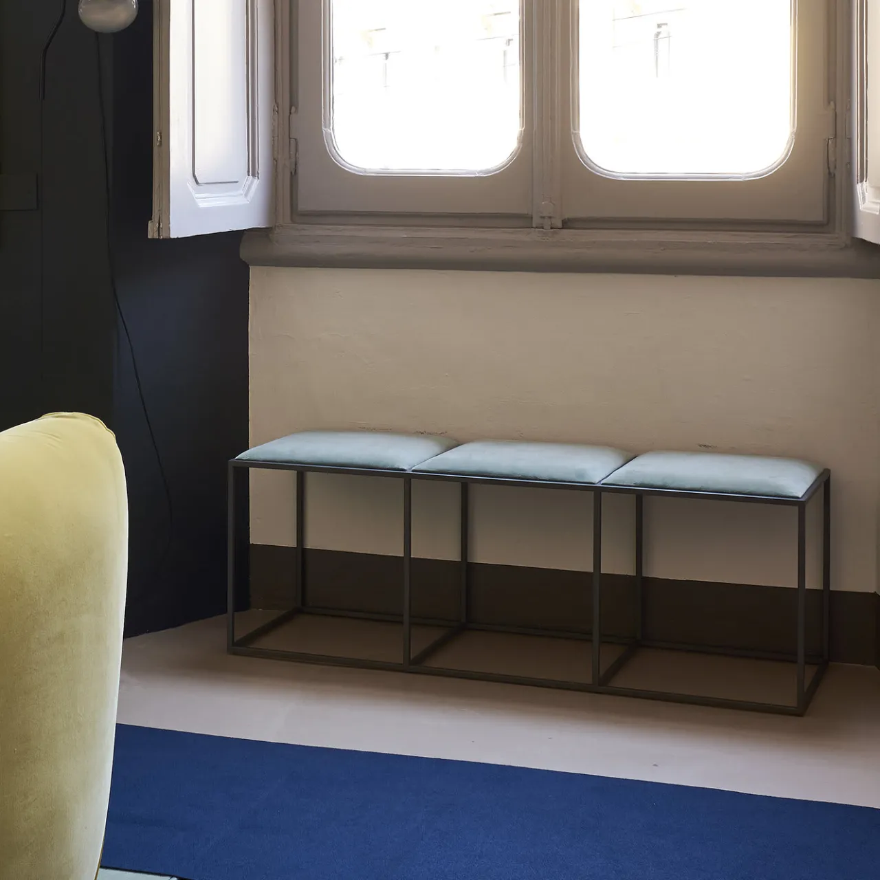 Elegante combinazione di materiali naturali e industriali, questa panca realizzata a mano da Federico Carandini, 2018, cattura l’essenza della filosofia di Eponimo di creare pezzi accattivanti tra il minimal e l’opulento. Questo design compatto ha una struttura leggera in acciaio composta da sottili aste squadrate rifinite in colore grigio cadetto che formano tre quadrati aperti. La seduta imbottita è rivestita in tessuto di cotone vellutato in una raffinata tonalità di mare. Questa panca sarà un accento funzionale e alla moda in un ingresso, una camera da letto o un soggiorno. Presentata al Fuorisalone durante la Milano Design Week 2018.