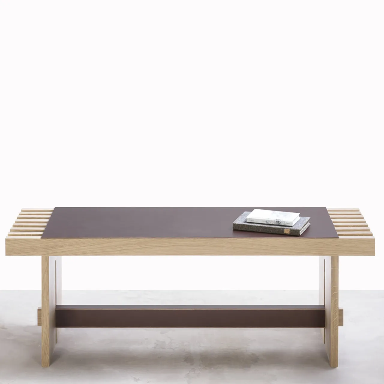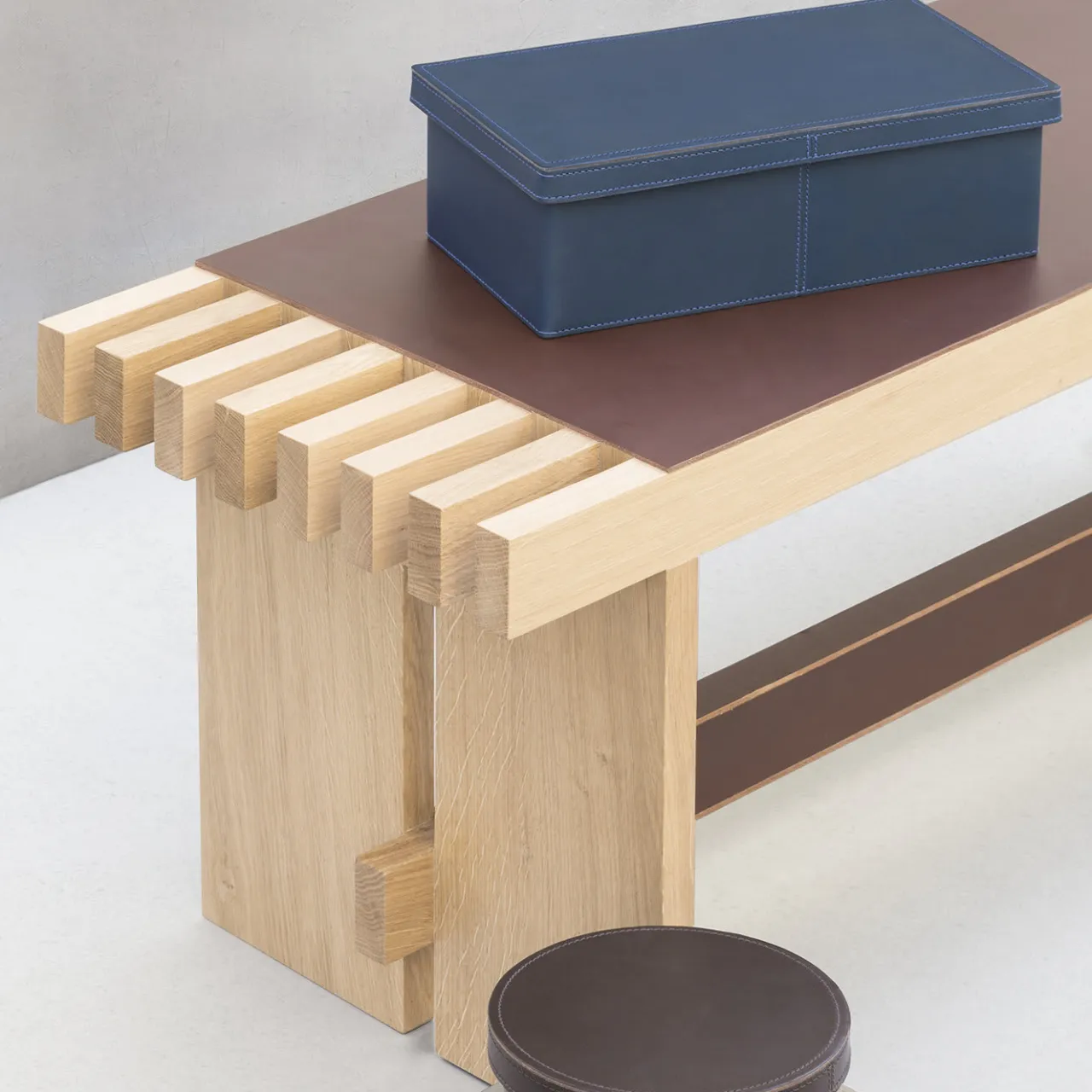 Ecco un altro pezzo della collezione Yuga. Questa bella panca è realizzata in legno di rovere e sormontata da una seduta in cuoio, mentre i dettagli squisiti arricchiscono l’articolo e la preziosità dei suoi materiali. La pelle di selleria utilizzata per la seduta è conciata al vegetale e ha una speciale finitura impermeabile.
