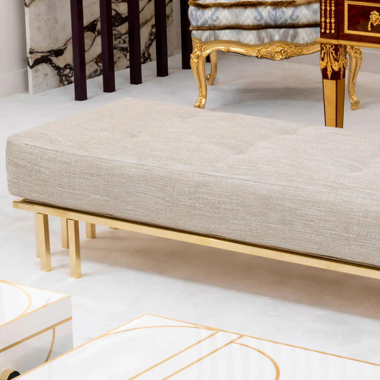 Dal design pulito ed elegante, che incarna uno stile sofisticato e senza tempo, questa panca sarà un’aggiunta squisita ad ambienti interni sia privati che contract. Realizzata in acciaio cromato e rifinito in oro, è rivestita in tessuto grigio. Per ulteriori informazioni, contattare il Concierge.