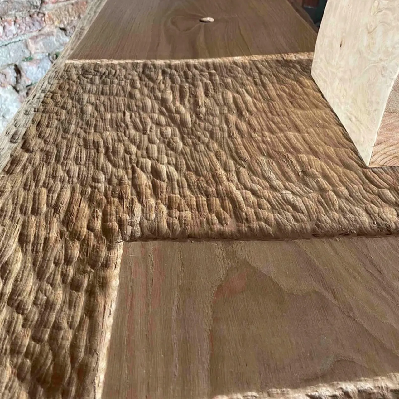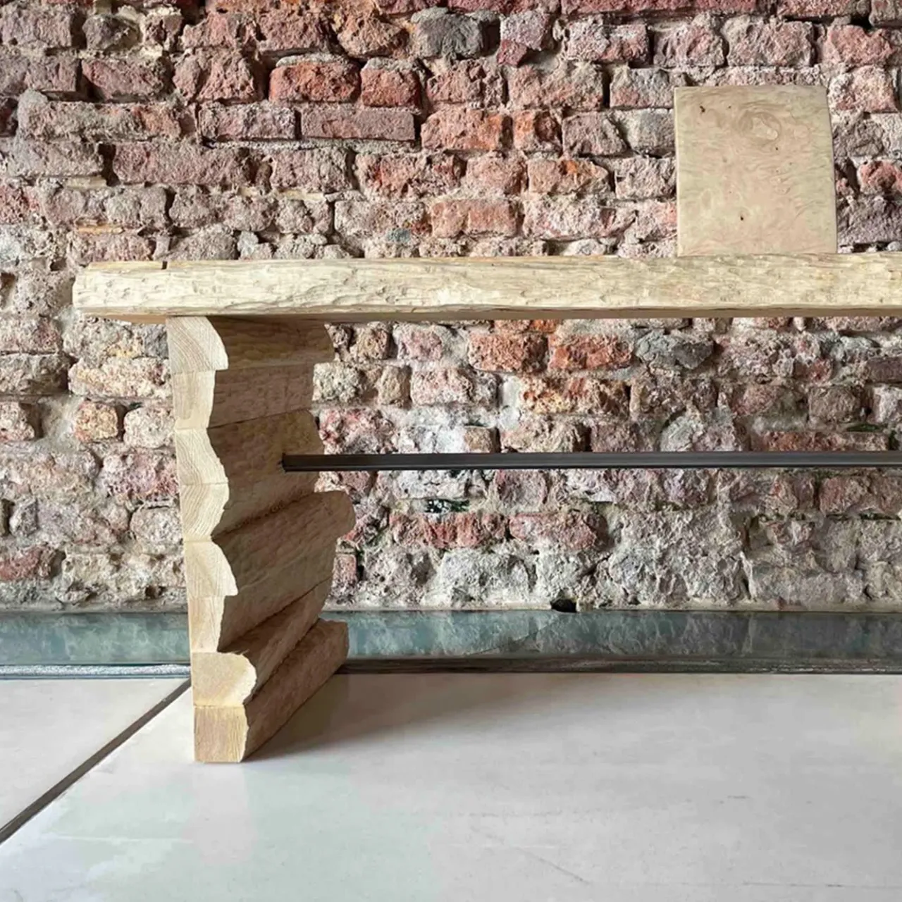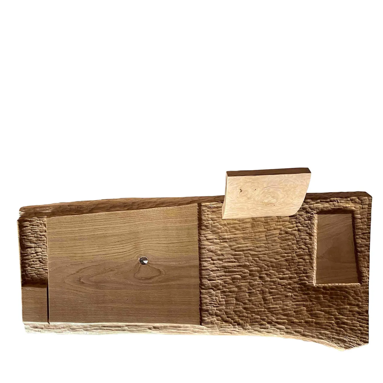 Irregolarità e asimmetrie definiscono questa robusta panca in legno come un pezzo di grande impatto artistico. Meticolosamente lavorata e scolpita a mano, la sua struttura combina radica di quercia e frassino per un contrasto di venature che invita l’occhio a soffermarsi su imprevedibili dettagli naturali. Eccentrico e unico, il pezzo vanta il segno dell’artista.