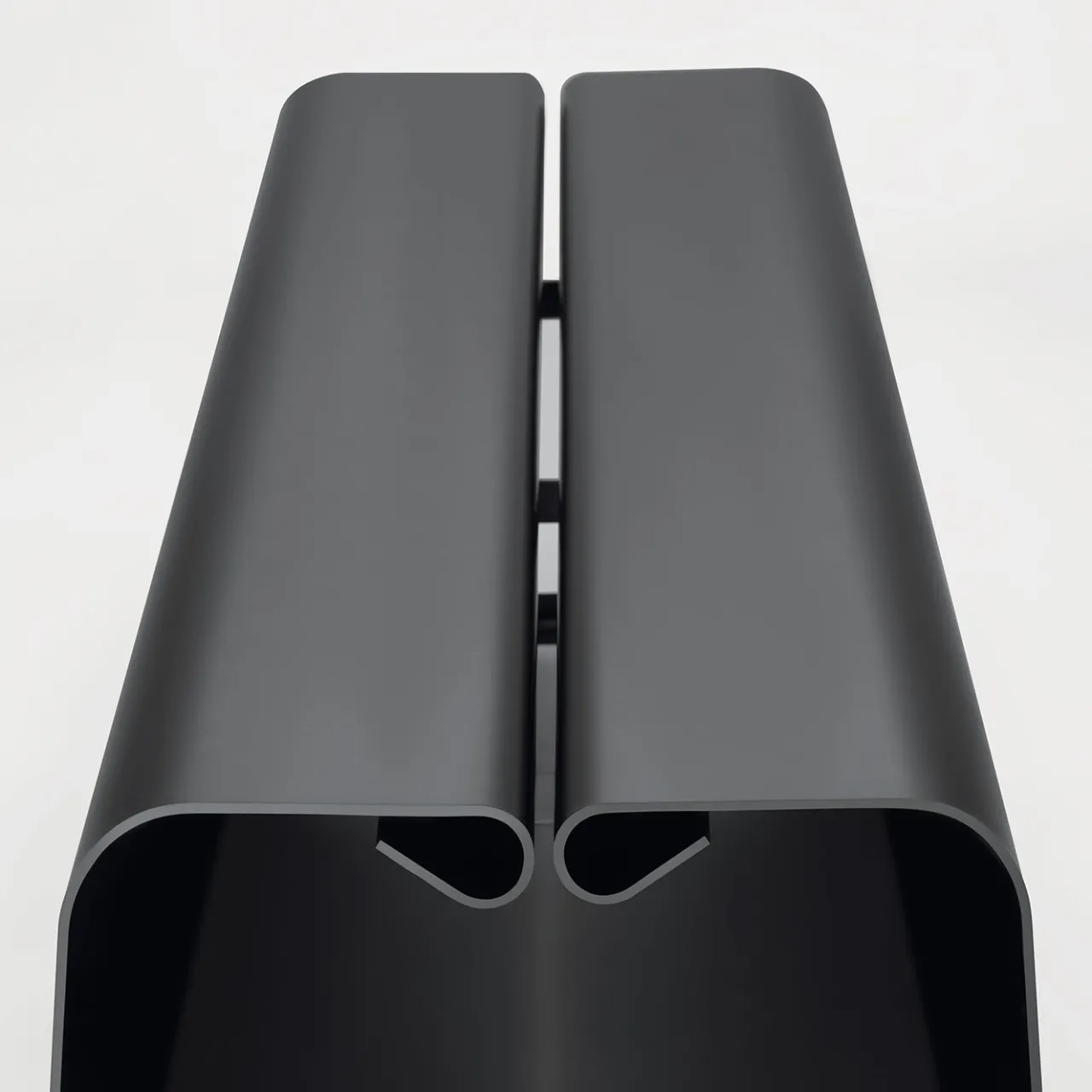 Un pezzo minimalista di arredamento funzionale che si farà notare sia negli spazi interni che in quelli esterni, questa squisita panca è caratterizzata da una silhouette rigorosamente geometrica dal fascino elegante e slanciato. Realizzata a mano in acciaio piegato con finitura nera e struttura interna in acciaio massiccio saldato, questa panca è composta da due pezzi che si arricciano nella parte superiore formando due solchi. Il suo design intelligente consente di combinare panche della stessa serie semplicemente inserendo barre metalliche orizzontali. Si prega di informarsi presso il Concierge per altri colori e finiture disponibili.