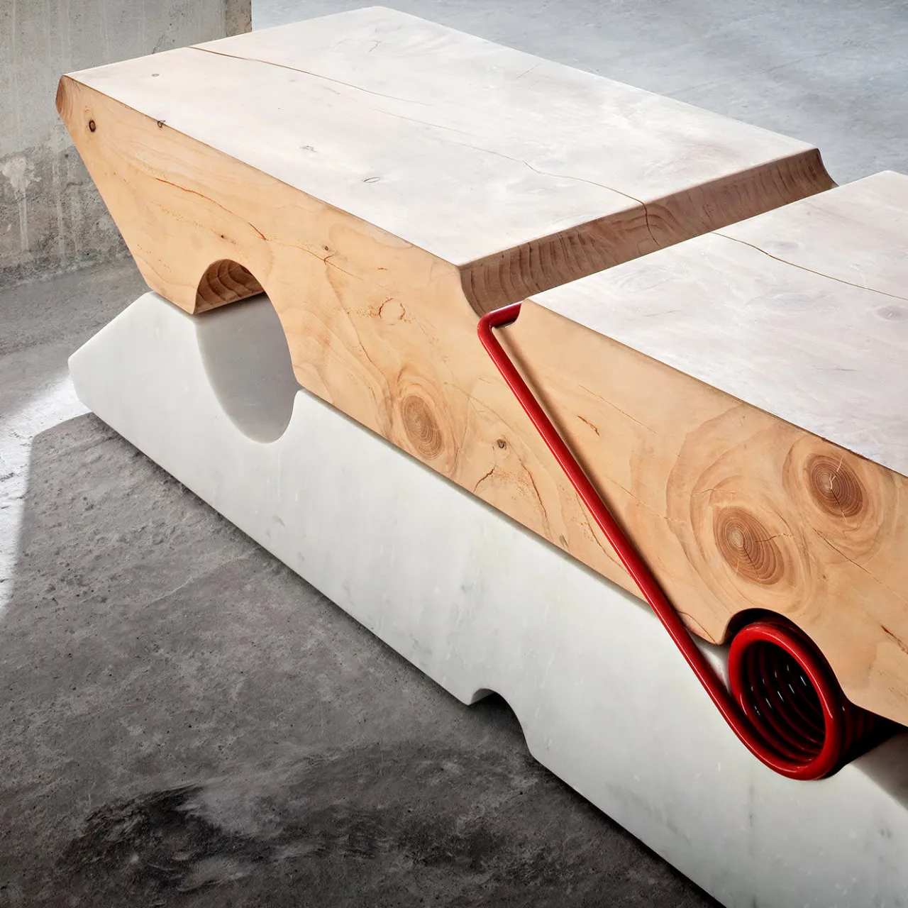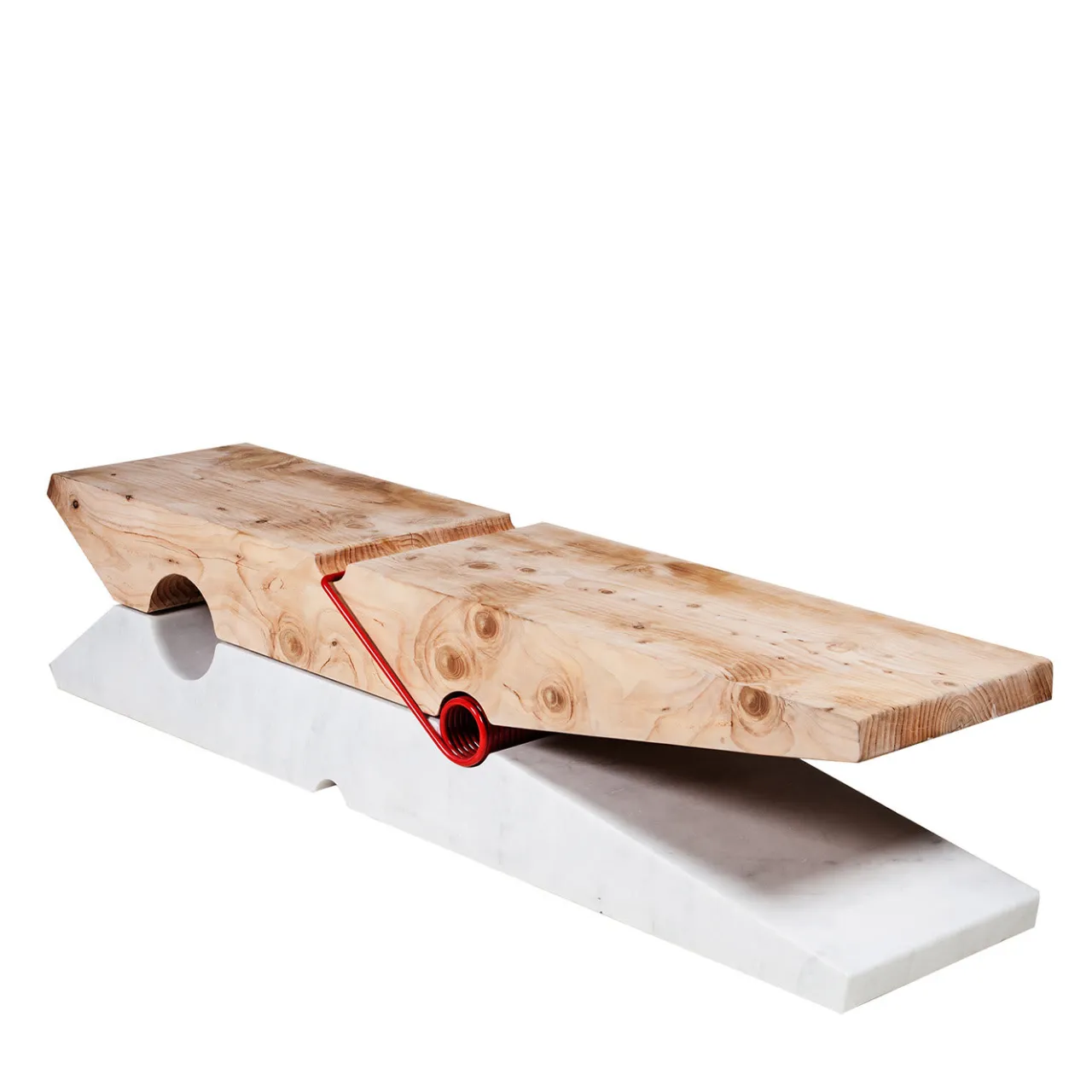 Questa stravagante panca a forma di molletta catturerà senza sforzo lo sguardo in qualsiasi arredamento contemporaneo grazie al suo aspetto estroso temperato da toni neutri. Disponibile in tre varianti di dimensioni, il design è realizzato sovrapponendo elementi perfettamente simmetrici in marmo bianco Statuario Macchietta e cedro grezzo, creando un’inaspettata armonia di toni e texture.