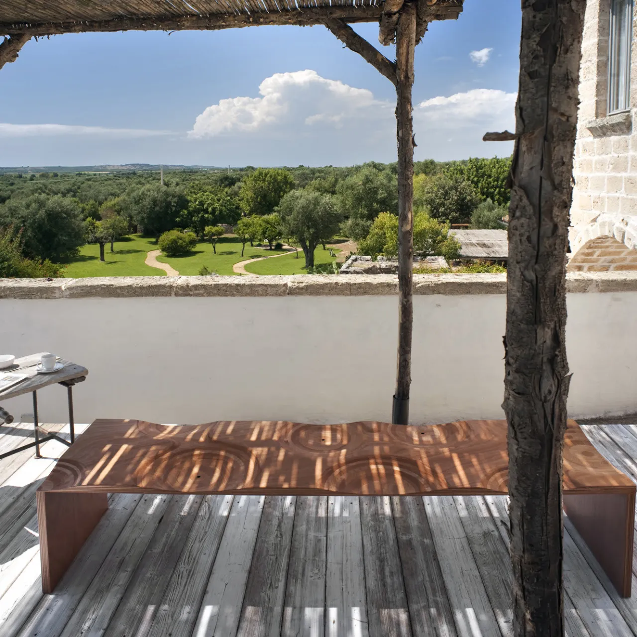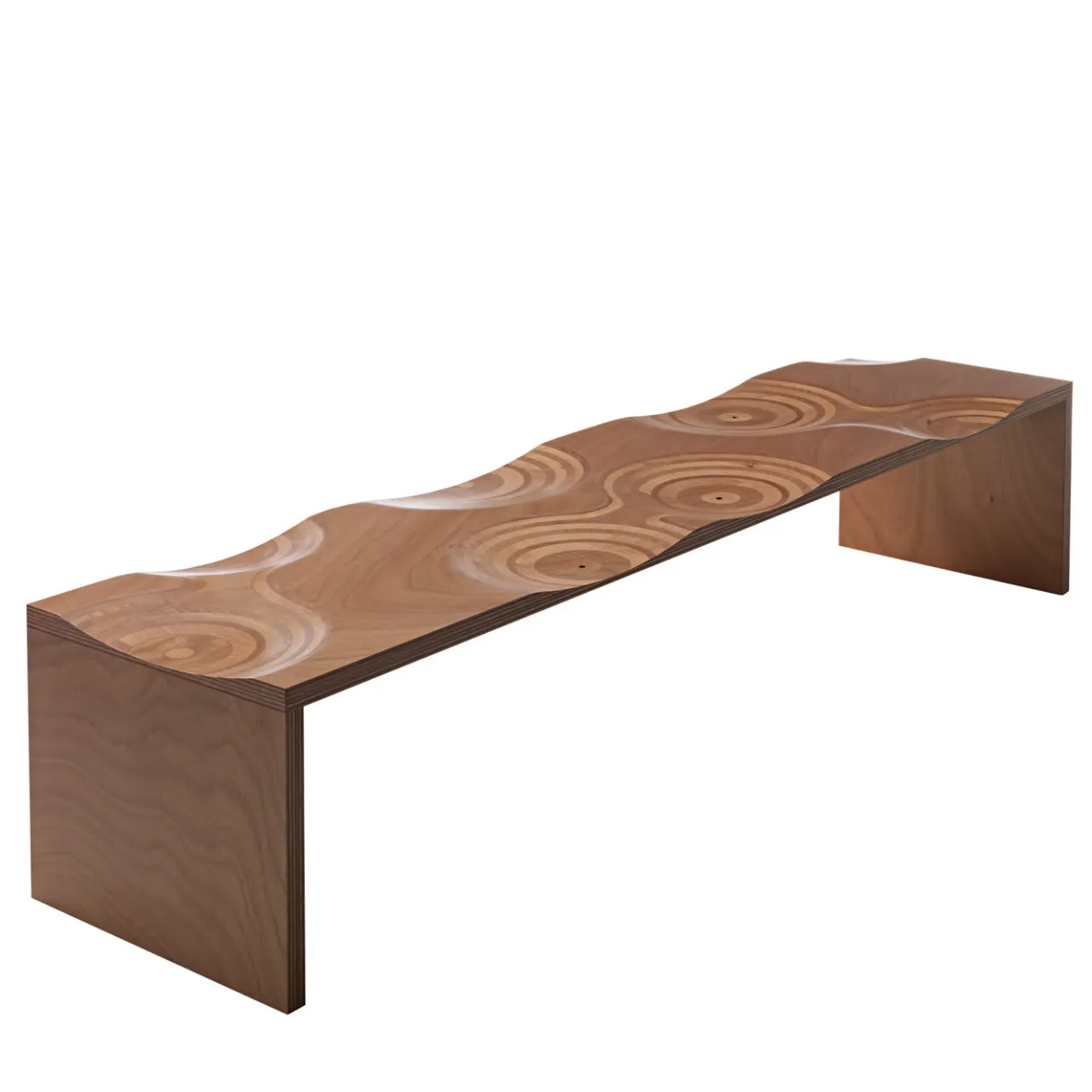 Versione per esterni della panchina Ripples di Toyo Ito, premiata a livello internazionale, quest’opera d’arte scultorea è realizzata in compensato di Okoume, un legno nativo dell’Africa occidentale tropicale perfettamente adatto a resistere all’umidità o alla pioggia leggera. La seduta, superbamente intagliata, presenta fori per il drenaggio dell’acqua in tre delle forme concave ed è rinforzata da una barra metallica nascosta.