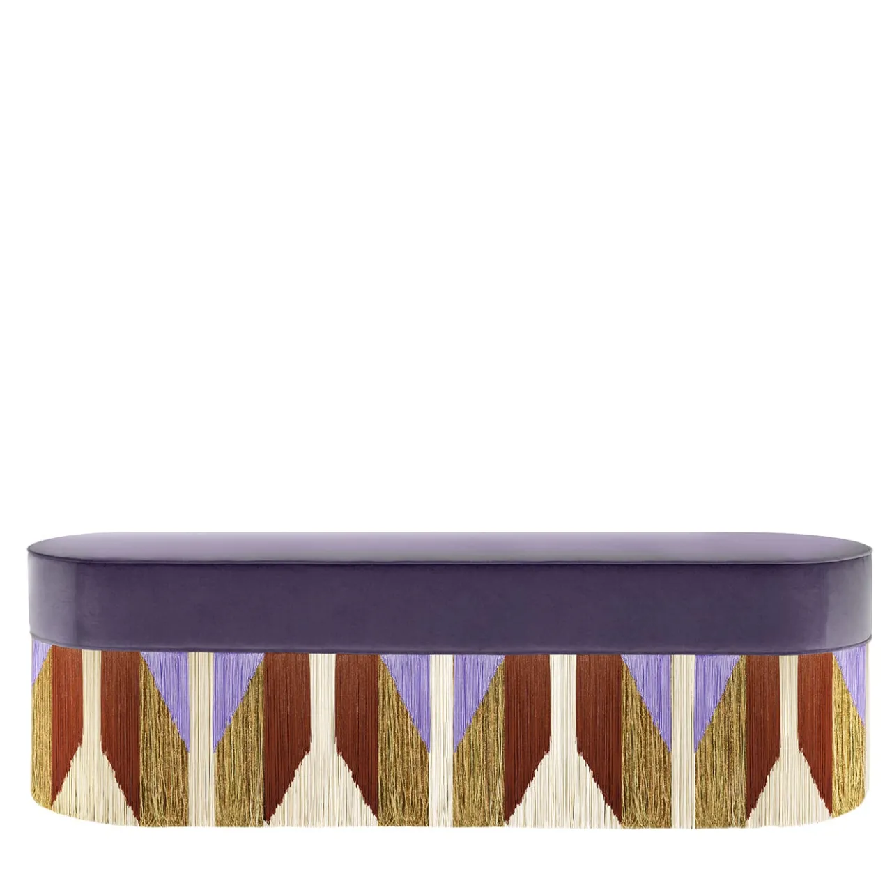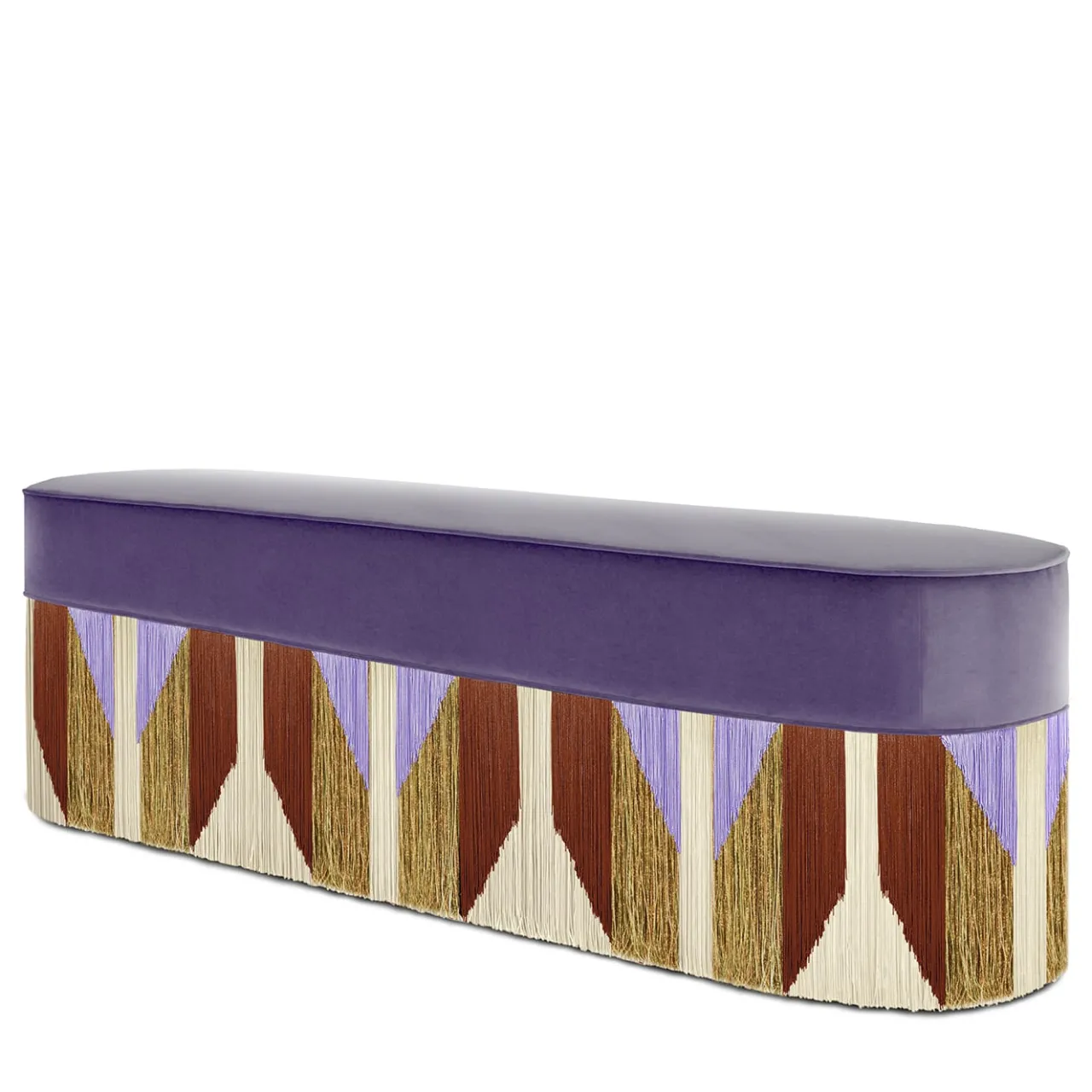 Eccentrica e sofisticata, questa panca è un prezioso pezzo sartoriale che troverà la collocazione ideale alla fine di un moderno letto matrimoniale. Il tratto distintivo è il colorato motivo di ispirazione tribale ottenuto disponendo diverse frange di viscosa, per un effetto visivo dal fascino ipnotico. Un’ampia seduta in velluto viola completa il design. Si prega di contattare il Concierge per le opzioni di personalizzazione disponibili. Ogni pezzo su misura è impresso sul fondo della fodera del pouf e firmato, numerato e datato personalmente dal designer.